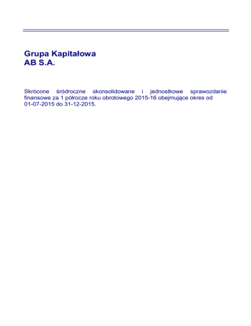 Grupa Kapitałowa AB S.A. Skrócone śródroczne skonsolidowane i jednostkowe sprawozdanie finansowe za 1 półrocze roku obrotowego 2015-16 obejmujące okres od 01-07-2015 do 31-12-2015. SPIS TREŚCI SKONSOLIDOWANY RACHUNEK ZYSKÓW I STRAT ZA OKRES OD 1 LIPCA 2015 DO 31 GRUDNIA 2015 Strona 4 SKONSOLIDOWANE SPRAWOZDANIE Z INNYCH CAŁKOWITYCH DOCHODÓW ZA OKRES OD 1 LIPCA 2015 DO 31 GRUDNIA 2015 5 SKONSOLIDOWANY SPRAWOZDANIE Z SYTUACJI FINANSOWEJ ZA OKRES ZAKOŃCZONY 31 GRUDNIA 2015 6 SKONSOLIDOWANE ZESTAWIENIE ZMIAN W KAPITALE WŁASNYM NA DZIEŃ 31 GRUDNIA 2015 ROKU 7 SKONSOLIDOWANE SPRAWOZDANIE Z PRZEPŁYWU ŚRODKÓW PIENIĘŻNYCH NA DZIEŃ 31 GRUDNIA 2015 ROKU 9 NOTY DO SKONSOLIDOWANEGO SPRAWOZDANIA FINANSOWEGO SPORZĄDZONEGO NA DZIEŃ 31 GRUDNIA 2015 ROKU 10 Strona 1 2 3 4 5 6 7 8 9 10 11 12 13 14 15 16 17 18 19 20 21 22 23 24 25 26 27 28 29 30 31 32 33 34 35 36 Informacje ogólne Stosowane zasady rachunkowości Podstawowe osądy rachunkowe i podstawy szacowania niepewności Przychody Segmenty Pozostałe przychody i koszty operacyjne Podatek dochodowy Działalność zaniechana Zysk przypadający na jedną akcję Rzeczowy majątek trwały Nieruchomości inwestycyjne Długoterminowe aktywa finansowe Wartość firmy Pozostałe wartości niematerialne i prawne Jednostki zależne Aktywa finansowe Pozostałe aktywa Zapasy Należności z tytułu dostaw i usług oraz pozostałe należności Aktywa objęte zastawem jako zabezpieczenie Kapitał podstawowy Kapitał zapasowy Kapitał rezerwowy Zysk netto i wynik z lat ubiegłych Pożyczki i kredyty otrzymane Pozostałe zobowiązania finansowe Rezerwy Zobowiązania z tytułu dostaw i usług oraz pozostałe zobowiązania Zobowiązania z tytułu leasingu finansowego Instrumenty finansowe Transakcje z jednostkami powiązanymi Przejęcie jednostek zależnych Środki pieniężne i ich ekwiwalenty Transakcje niepieniężne i źródła finansowania Zobowiązania warunkowe Zdarzenia po dniu bilansowym 10 11 19 20 21 23 25 26 27 28 29 29 29 30 31 32 32 32 33 34 34 35 35 36 37 41 41 41 41 42 53 53 54 54 54 54 Skonsolidowane sprawozdanie finansowe Grupy Kapitałowej AB za I półrocze roku obrotowego 2015/2016 JEDNOSTKOWY RACHUNEK ZYSKÓW I STRAT ZA OKRES OD 1 LIPCA 2015 DO 31 GRUDNIA 2015 55 JEDNOSTKOWE SPRAWOZDANIE Z INNYCH CAŁKOWITYCH DOCHODÓW ZA OKRES OD 1 LIPCA 2015 DO 31 GRUDNIA 2015 56 JEDNOSTKOWE SPRAWOZDANIE Z SYTUACJI FINANSOWEJ ZA OKRES ZAKOŃCZONY 31 GRUDNIA 2015 57 JEDNOSTKOWE ZESTAWIENIE ZMIAN W KAPITALE WŁASNYM NA DZIEŃ 31 GRUDNIA 2015 ROKU 58 JEDNOSTKOWE SPRAWOZDANIE Z PRZEPŁYWU ŚRODKÓW PIENIĘŻNYCH NA DZIEŃ 31 GRUDNIA 2015 ROKU 59 NOTY DO JEDNOSTKOWEGO SPRAWOZDANIA FINANSOWEGO SPORZĄDZONEGO NA DZIEŃ 31 GRUDNIA 2015 ROKU 60 Strona 1 2 3 4 5 6 7 8 9 Wybrane jednostkowe dane finansowe przeliczone na euro Należności krótkoterminowe – struktura walutowa Zobowiązania – struktura walutowa Środki pieniężne – struktura walutowa Zmiana stanu odpisów aktualizujących należności Zmiana stanu rezerw na świadczenia pracownicze Zmiana stanu pozostałych rezerw Transakcje z podmiotami powiązanymi Zdarzenia po dniu bilansowym ZATWIERDZENIE SPRAWOZDANIA FINANSOWEGO 60 61 61 62 62 62 63 63 63 63 3 Skonsolidowane sprawozdanie finansowe Grupy Kapitałowej AB za I półrocze roku obrotowego 2015/2016 SKONSOLIDOWANY RACHUNEK ZYSKÓW I STRAT ZA OKRES OD 1 LIPCA 2015 DO 31 GRUDNIA 2015 NOTA Okres od 01/07/2015 do 31/12/2015 PLN’000 Okres od 01/07/2014 do 31/12/2014 PLN’000 Działalność kontynuowana Przychody ze sprzedaży Koszt własny sprzedaży 3 859 457 3 702 983 3 572 611 3 434 324 156 474 138 287 82 382 15 897 3 666 6 127 66 155 15 599 3 611 4 817 Zysk (strata) na działalności operacyjnej Przychody finansowe Koszty finansowe Zysk ze zbycia jednostek stowarzyszonych Udział w zyskach jednostek stowarzyszonych 55 734 2 126 10 659 55 327 2 614 7 006 Zysk (strata) przed opodatkowaniem 47 201 50 935 9 066 10 272 38 135 40 663 38 135 40 663 38 135 40 663 Zysk ( strata ) brutto na sprzedaży Koszt sprzedaży Koszty zarządu Pozostałe przychody operacyjne Pozostałe koszty operacyjne Podatek dochodowy Zysk (strata) netto z działalności kontynuowanej 4 Działalność zaniechana Zysk (strata) netto z działalności kontynuowanej Zysk (strata) netto Zysk /strata netto przypadający: Akcjonariuszom jednostki dominującej Udziałowcom nie sprawującym kontroli * strata netto udziałowców nie sprawujących kontroli 4 Skonsolidowane sprawozdanie finansowe Grupy Kapitałowej AB za I półrocze roku obrotowego 2015/2016 SKONSOLIDOWANE SPRAWOZDANIE Z INNYCH CAŁKOWITYCH DOCHODÓW ZA OKRES OD 1 LIPCA 2015 DO 31 GRUDNIA 2015 Zysk (strata) netto 38 135 40 663 5 210 -2 157 3 210 -6 281 Całkowity dochód ogółem przypadający: 41 188 37 592 Akcjonariuszom jednostki dominującej Udziałowcom nie sprawującym kontroli 41 188 37 592 Pozostałe całkowite dochody: Pozycje, które mogą być reklasyfikowane do wyniku w późniejszych okresach Różnice kursowe z przeliczenia jednostek zagranicznych Rachunkowość zabezpieczeń Udział w innych całkowitych dochodach jednostek stowarzyszonych Skutki wyceny aktywów finansowych dostępnych do sprzedaży Podatek dochodowy odnoszący się do pozycji, które mogą być reklasyfikowane Pozycje, które nie będą reklasyfikowane do wyniku Skutki aktualizacji majątku trwałego Zyski i straty aktuarialne Podatek dochodowy odnoszący się do pozycji, które nie będą reklasyfikowane 5 Skonsolidowane sprawozdanie finansowe Grupy Kapitałowej AB za I półrocze roku obrotowego 2015/2016 SKONSOLIDOWANE SPRAWOZDANIE Z SYTUACJI FINANSOWEJ ZA OKRES ZAKOŃCZONY 31 GRUDNIA 2015 NOTA Okres zakończony 31/12/15 PLN’000 Okres zakończony 30/06/15 PLN’000 Okres zakończony 31/12/14 PLN’000 AKTYWA Aktywa trwałe Wartości niematerialne i prawne Wartość firmy Rzeczowe aktywa trwałe Nieruchomości inwestycyjne Długoterminowe aktywa finansowe Aktywa z tytułu podatku odroczonego 270 924 23 086 42 898 190 462 4