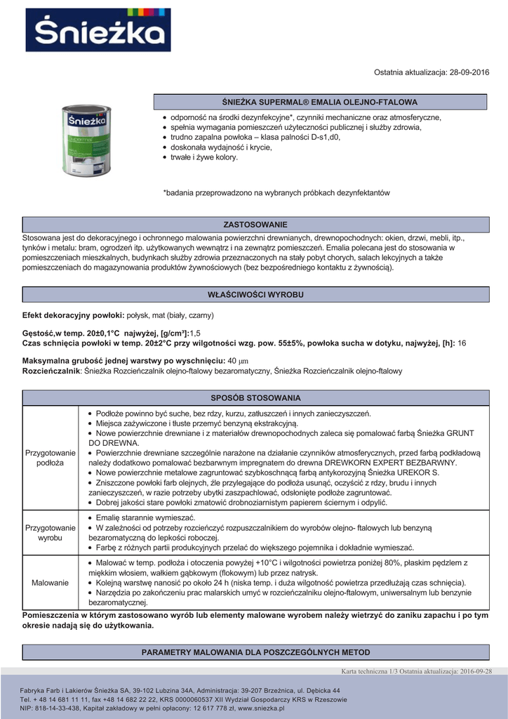 Ostatnia aktualizacja: 28-09-2016 ŚNIEŻKA SUPERMAL® EMALIA OLEJNOFTALOWA odporność na środki dezynfekcyjne*, czynniki mechaniczne oraz atmosferyczne, ŚNIEŻKA_SUPERMAL®_EMALIA_OLEJNOFTALOWA spełnia wymagania pomieszczeń użyteczności publicznej i służby zdrowia, trudno zapalna powłoka – klasa palności Ds1,d0, doskonała wydajność i krycie, trwałe i żywe kolory. *badania przeprowadzono na wybranych próbkach dezynfektantów ZASTOSOWANIE Stosowana jest do dekoracyjnego i ochronnego malowania powierzchni drewnianych, drewnopochodnych: okien, drzwi, mebli, itp., tynków i metalu: bram, ogrodzeń itp. użytkowanych wewnątrz i na zewnątrz pomieszczeń. Emalia polecana jest do stosowania w pomieszczeniach mieszkalnych, budynkach służby zdrowia przeznaczonych na stały pobyt chorych, salach lekcyjnych a także pomieszczeniach do magazynowania produktów żywnościowych (bez bezpośredniego kontaktu z żywnością). WŁAŚCIWOŚCI WYROBU Efekt dekoracyjny powłoki: połysk, mat (biały, czarny) Gęstość,w temp. 20±0,1°C najwyżej, [g/cm³]:1,5 Czas schnięcia powłoki w temp. 20±2°C przy wilgotności wzg. pow. 55±5%, powłoka sucha w dotyku, najwyżej, [h]: 16 Maksymalna grubość jednej warstwy po wyschnięciu: 40 μm Rozcieńczalnik: Śnieżka Rozcieńczalnik olejnoftalowy bezaromatyczny, Śnieżka Rozcieńczalnik olejnoftalowy SPOSÓB STOSOWANIA Przygotowanie podłoża Podłoże powinno być suche, bez rdzy, kurzu, zatłuszczeń i innych zanieczyszczeń. Miejsca zażywiczone i tłuste przemyć benzyną ekstrakcyjną. Nowe powierzchnie drewniane i z materiałów drewnopochodnych zaleca się pomalować farbą Śnieżka GRUNT DO DREWNA. Powierzchnie drewniane szczególnie narażone na działanie czynników atmosferycznych, przed farbą podkładową należy dodatkowo pomalować bezbarwnym impregnatem do drewna DREWKORN EXPERT BEZBARWNY. Nowe powierzchnie metalowe zagruntować szybkoschnącą farbą antykorozyjną Śnieżka UREKOR S. Zniszczone powłoki farb olejnych, źle przylegające do podłoża usunąć, oczyścić z rdzy, brudu i innych zanieczyszczeń, w razie potrzeby ubytki zaszpachlować, odsłonięte podłoże zagruntować. Dobrej jakości stare powłoki zmatowić drobnoziarnistym papierem ściernym i odpylić. Przygotowanie wyrobu Emalię starannie wymieszać. W zależności od potrzeby rozcieńczyć rozpuszczalnikiem do wyrobów olejno ftalowych lub benzyną bezaromatyczną do lepkości roboczej. Farbę z różnych partii produkcyjnych przelać do większego pojemnika i dokładnie wymieszać. Malowanie Malować w temp. podłoża i otoczenia powyżej +10°C i wilgotności powietrza poniżej 80%, płaskim pędzlem z miękkim włosiem, wałkiem gąbkowym (flokowym) lub przez natrysk. Kolejną warstwę nanosić po około 24 h (niska temp. i duża wilgotność powietrza przedłużają czas schnięcia). Narzędzia po zakończeniu prac malarskich umyć w rozcieńczalniku olejnoftalowym, uniwersalnym lub benzynie bezaromatycznej. Pomieszczenia w którym zastosowano wyrób lub elementy malowane wyrobem należy wietrzyć do zaniku zapachu i po tym okresie nadają się do użytkowania. PARAMETRY MALOWANIA DLA POSZCZEGÓLNYCH METOD Karta techniczna 1/3 Ostatnia aktualizacja: 2016-09-28 Fabryka Farb i Lakierów Śnieżka SA, 39102 Lubzina 34A, Administracja: 39207 Brzeźnica, ul. Dębicka 44 Tel. + 48 14 681 11 11, fax +48 14 682 22 22, KRS 0000060537 XII Wydział Gospodarczy KRS w Rzeszowie NIP: 8181433438, Kapitał zakładowy w pełni opłacony: 12 617 778 zł, www.sniezka.pl PARAMETRY MALOWANIA METODY lepkość farby MALOWANIA dodatek rozcieńczalnika średnica dyszy pistoletu ciśnienie natrysku zalecana ilość warstw [s] [%] [mm] [MPa] Pędzel, wałek postać handlowa do 10 - - 1-2 Natrysk pneumatyczny 25÷35 do 20 1,5÷2 0,3÷0,5 1-2 postać handlowa - 0,26 20÷21 1-2 ŚNIEŻKA_SUPERMAL®_EMALIA_OLEJNOFTALOWA Natrysk hydrodynamiczny* * natrysk wykonany na urządzeniach firmy Graco, model 395 ST PRO OKRES PRZYDATNOŚCI 24 miesiące OPAKOWANIA 200ml, 400ml, 800ml, 2,5L, 5L, 10L WYDAJNOŚĆ WYDAJNOŚĆ: do 16 m²/L przy jednokrotnym malowaniu KOLORYSTYKA 22 kolory LZO Limit zawartości LZO dla tego produktu: (kat. A/d/FR): 300g/l (2010). Produkt zawiera max. 300 g/l. NORMY, BADANIA I ATESTY ZN-SN 023:2009 ZN-SN -023:2009 Atest PZH: HK/B/0478/04/2009 WSKAZÓWKI BHP I PPOŻ BEZPIECZEŃSTWO: Zawiera Węglowodory C9C11, nalkany, izoalkany, cykliczne <2% węglowodorów aromatycznych Zawiera Bis(2etyloheksanian) kobaltu, Kwasy tłuszczowe C18, nienasycone, dimery, produkty reakcji z N,Ndimetylo1,3propanodiaminą i 1,3propanodiaminą, Kwasy tłuszczowe, C619 rozgałęzione, sole kobaltu (2+), Oksym butan2onu. Może powodować wystąpienie reakcji alergicznej. Powtarzające się narażenie może powodować wysuszanie lub pękanie skóry. Łatwopalna ciecz i pary. Może wywoływać uczucie senności i zawroty głowy. W razie konieczności zasięgnięcia porady lekarza należy pokazać pojemnik lub etykietę. Chronić przed dziećmi. Przed użyciem przeczytać etykietę. W PRZYPADKU KONTAKTU ZE SKÓRĄ (lub włosami): Natychmiast usunąć/zdjąć zanieczyszczoną odzież. Spłukać skórę pod strumieniem wody/prysznicem. W PRZYPADKU DOSTANIA SIĘ DO DRÓG ODDECHOWYCH: Wyprowadzić lub wynieść poszkodowanego na świeże powietrze i zapewnić warunki do odpoczynku w pozycji umożliwiającej swobodne oddychanie. W przypadku złego samopoczucia skontaktować się z OŚRODKIEM ZATRUĆ lub lekarzem. W przypadku pożaru: Użyć gaśnicy typu ABC do gaszenia. Zawartość/pojemnik usuwać zgodnie z obowiązującymi przepisami. Przechowywanie i transport: Temperatura przechowywania: od +5°C do +30°C. Chronić przed mrozem i nasłonecznieniem. Karta techniczna 2/3 Ostatnia aktualizacja: 2016-09-28 Fabryka Farb i Lakierów Śnieżka SA, 39102 Lubzina 34A, Administracja: 39207 Brzeźnica, ul. Dębicka 44 Tel. + 48 14 681 11 11, fax +48 14 682 22 22, KRS 0000060537 XII Wydział Gos