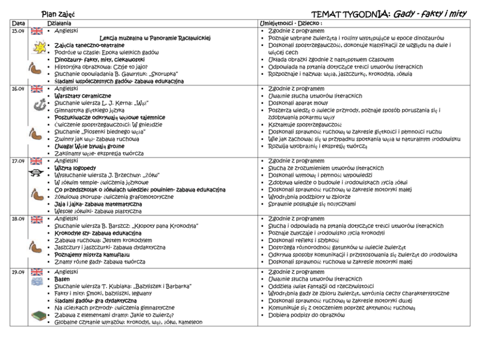 TEMAT TYGODNIA: Plan zajęć Data 15.04 16.04 17.04 18.04 19.04 Działania Angielski Lekcja muzealna w Panoramie Racławickiej Zajęcia taneczno-teatralne Podróże w czasie: Epoka wielkich gadów Dinozaury- fakty, mity, ciekawostki Historyjka obrazkowa: Czyje to jajo? Słuchanie opowiadania B. Gawryluk: „Skorupka” Śladami współczesnych gadów- zabawa edukacyjna Angielski Warsztaty ceramiczne Słuchanie wiersza L. J. Kerna: „Wąż” Gimnastyka giętkiego języka Poszukiwacze odkrywają wężowe tajemnice Ćwiczenie spostrzegawczości: W gnieździe Słuchanie „Piosenki biednego węża” Zwinny jak wąż- zabawa ruchowa Uwaga! Węże bywają groźne Zaklinamy węże- ekspresja twórcza Angielski Wizyta logopedy Wysłuchanie wiersza J. Brzechwy: „Żółw” W żółwim tempie- ćwiczenia językowe Co przedszkolak o żółwiach wiedzieć powinien- zabawa edukacyjna Żółwiowa skorupa- ćwiczenia grafomotoryczne Jaja i jajka- zabawa matematyczna Wesołe żółwiki- zabawa plastyczna Angielski Słuchanie wiersza B. Barszcz: „Kłopoty pana Krokodyla” Krokodyle łzy- zabawa edukacyjna Zabawa ruchowa: Jestem krokodylem Jaszczury i jaszczurki- zabawa dydaktyczna Poznajemy mistrza kamuflażu Znamy różne gady- zabawa twórcza Angielski Basen Słuchanie wiersza T. Kubiaka: „Bazyliszek i Barbarka” Fakty i mity: Smoki, bazyliszki, legwany Śladami gadów- gra dydaktyczna Na ścieżkach przyrody- ćwiczenia gimnastyczne Zabawa z elementami dramy: Jakie to zwierzę? Globalne czytanie wyrazów: krokodyl, wąż, żółw, kameleon Gady - fakty i mity Umiejętności - Dziecko : Zgodnie z programem Poznaje wybrane zwierzęta i rośliny występujące w epoce dinozaurów Doskonali spostrzegawczość, dokonuje klasyfikacji ze względu na dwie i więcej cech Układa obrazki zgodnie z następstwem czasowym Odpowiada na pytania dotyczące treści utworów literackich Rozpoznaje i nazywa: węża, jaszczurkę, krokodyla, żółwia Zgodnie z programem Uważnie słucha utworów literackich Doskonali aparat mowy Poszerza wiedzę o świecie przyrody, poznaje sposób poruszania się i zdobywania pokarmu węży Kształtuje spostrzegawczość Doskonali sprawność ruchową w zakresie giętkości i płynności ruchu Wie jak zachować się w przypadku spotkania węża w naturalnym środowisku Rozwija wyobraźnię i ekspresję twórczą Zgodnie z programem Słucha ze zrozumieniem utworów literackich Doskonali wymowę i płynność wypowiedzi Zdobywa wiedze o budowie i środowiskach życia żółwi Doskonali sprawność ruchową w zakresie motoryki małej Wyodrębnia podzbiory w zbiorze Sprawnie posługuje się nożyczkami Zgodnie z programem Słucha i odpowiada na pytania dotyczące treści utworów literackich Poznaje zwyczaje i środowisko życia krokodyli Doskonali refleks i szybkość Dostrzega różnorodność gatunków w świecie zwierząt Odkrywa sposoby komunikacji i przystosowania się zwierząt do środowiska Doskonali sprawność ruchowa w zakresie motoryki małej Zgodnie z programem Uważnie słucha utworów literackich Oddziela świat fantazji od rzeczywistości Wyodrębnia gady ze zbioru zwierząt, wyróżnia cechy charakterystyczne Doskonali sprawność ruchową w zakresie motoryki dużej Komunikuje się z otoczeniem poprzez aktywność ruchową Dobiera podpisy do obrazków