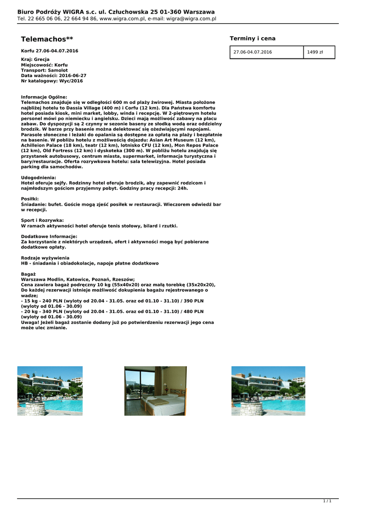Biuro Podróży WIGRA s.c. ul. Człuchowska 25 01-360 Warszawa Tel. 22 665 06 06, 22 664 94 86, www.wigra.com.pl, e-mail: [email protected] Telemachos** Korfu 27.06-04.07.2016 Terminy i cena 27.06-04.07.2016 1499 zł Kraj: Grecja Miejscowość: Korfu Transport: Samolot Data ważności: 2016-06-27 Nr katalogowy: Wyc/2016 Informacje Ogólne: Telemachos znajduje się w odległości 600 m od plaży żwirowej. Miasta położone najbliżej hotelu to Dassia Village (400 m) i Corfu (12 km). Dla Państwa komfortu hotel posiada kiosk, mini market, lobby, winda i recepcję. W 2-piętrowym hotelu personel mówi po niemiecku i angielsku. Dzieci mają możliwość zabawy na placu zabaw. Do dyspozycji są 2 czynny w sezonie baseny ze słodką wodą oraz oddzielny brodzik. W barze przy basenie można delektować się ożeźwiającymi napojami. Parasole słoneczne i leżaki do opalania są dostępne za opłatą na plaży i bezpłatnie na basenie. W pobliżu hotelu z możliwością dojazdu: Asian Art Museum (12 km), Achilleion Palace (18 km), teatr (12 km), lotnisko CFU (12 km), Mon Repos Palace (12 km), Old Fortress (12 km) i dyskoteka (300 m). W pobliżu hotelu znajdują się przystanek autobusowy, centrum miasta, supermarket, informacja turystyczna i bary/restauracje. Oferta rozrywkowa hotelu: sala telewizyjna. Hotel posiada parking dla samochodów. Udogodnienia: Hotel oferuje sejfy. Rodzinny hotel oferuje brodzik, aby zapewnić rodzicom i najmłodszym gościom przyjemny pobyt. Godziny pracy recepcji: 24h. Posiłki: Śniadanie: bufet. Goście mogą zjeść posiłek w restauracji. Wieczorem odwiedź bar w recepcji. Sport i Rozrywka: W ramach aktywności hotel oferuje tenis stołowy, bilard i rzutki. Dodatkowe Informacje: Za korzystanie z niektórych urządzeń, ofert i aktywności mogą być pobierane dodatkowe opłaty. Rodzaje wyżywienia HB - śniadania i obiadokolacje, napoje płatne dodatkowo Bagaż Warszawa Modlin, Katowice, Poznań, Rzeszów; Cena zawiera bagaż podręczny 10 kg (55x40x20) oraz małą torebkę (35x20x20), Do każdej rezerwacji istnieje możliwość dokupienia bagażu rejestrowanego o wadze; - 15 kg - 240 PLN (wyloty od 20.04 - 31.05. oraz od 01.10 - 31.10) / 390 PLN (wyloty od 01.06 - 30.09) - 20 kg - 340 PLN (wyloty od 20.04 - 31.05. oraz od 01.10 - 31.10) / 480 PLN (wyloty od 01.06 - 30.09) Uwaga! Jeżeli bagaż zostanie dodany już po potwierdzeniu rezerwacji jego cena może ulec zmianie. 1/1 Powered by TCPDF (www.tcpdf.org)
