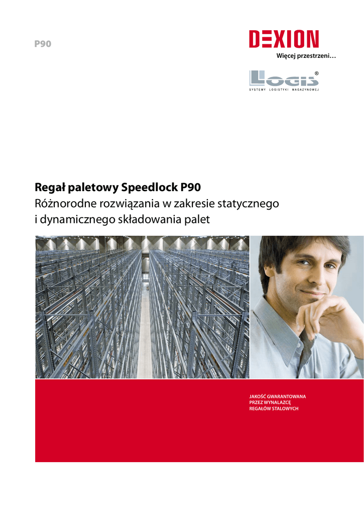 P90 Więcej przestrzeni… Regał paletowy Speedlock P90 Różnorodne rozwiązania w zakresie statycznego i dynamicznego składowania palet JAKOŚĆ GWARANTOWANA PRZEZ WYNALAZCĘ REGAŁÓW STALOWYCH 02 DEXION P90 Wraz z koncepcją zastosowania perforowanych profili stalowych w technice składowania Dexion już przed 50 laty stworzył standardy w zakresie elastyczności i zorientowania na potrzeby klienta. Po dzień dzisiejszy projektujemy i produkujemy w Niemczech – nie tylko dla naszych Klientów, lecz wspólnie z nimi. Elastyczny regał paletowy – wynalazek Dexion Dexion specjalizuje się w indywidualnych i wydajnych rozwiązaniach w zakresie logistyki magazynowej. W oparciu o długoletnie doświadczenie w zakresie techniki magazynowania oraz w nieustannym porozumieniu z Klientami cały czas rozwijamy swoje produkty w sposób przemyślany i zaplanowany – zarówno pod względem techniki, jakości, jak i koncepcji. W Polsce od ponad dekady reprezentantem Dexiona jest firma Logis Sp. z o.o., czołowy dostawca nowoczesnych systemów składowania. Firma Logis powstała w 1996 roku w Poznaniu i od początku swego istnienia całą swą uwagę skupiała na szeroko rozumianym interesie Klienta. Mając za drogowskaz hasło „satysfakcja Klienta jest naszą satysfakcją“ zdobyła zaufanie wielu firm. Z czasem stało się ono najlepszym argumentem, przemawiającym za jej wyborem jako dostawcy regałów magazynowych i wózków widłowych. Naszym celem nie jest bowiem sprzedawanie Klientom gotowych systemów, lecz wspólne opracowywanie „szytych na miarę” i elastycznych rozwiązań w zakresie składowania towarów, które całkowicie odpowiadają potrzebom Klienta. Dzięki swej elastyczności oraz bogatemu zestawowi akcesoriów systemy takie bez problemu dopasowywane są do potrzeb Klienta i stanowią optymalne rozwiązanie zarówno przy statycznym, jak i przy dynamicznym składowaniu palet. System P90 do składowania sezonowych towarów szybko rotujących (FMCG): regał wysokiego składowania w formie wąskich korytarzy w magazynie międzynarodowej firmy oferującej ozdoby wnętrz mieszkalnych. 03 DEXION P90 Opracowany przez Dexion system regałów paletowych Speedlock P90 to podstawa wydajnych i elastycznych rozwiązań logistycznych na miarę wszelkich potrzeb. P90 charakteryzuje się nie tylko standardowo gwarantowaną przez Dexion najwyższą jakością i ponadprzeciętną stabilnością, lecz dzięki bogatemu zestawowi akcesoriów także niezwykła wielostronnością zastosowań – od prostego, statycznego regału paletowego, poprzez różnorodne rozwiązania dynamiczne aż po automatyczny magazyn palet. Niezawodność, stabilność i wielostronność – system P90 firmy Dexion OPTYMALNE DOPASOWANIE Niezależnie od tego, czy do składowania wykorzystujemy europalety, palety jednorazowego użytku, palety wykonane na wewnętrzne potrzeby firmy, pudła o konstrukcji ramowej ze stalowej siatki i drewnianej podłodze czy też pojemniki – P90 bez problemu dopasowuje się do odpowiednich form pod względem szerokości, głębokości oraz wielkości powierzchni półek. Również warunki przestrzenne są optymalnie wykorzystywane, a to dzięki temu, iż regały P90 dostępne są w wysokości od 1,5 do 30 m, a także dzięki możliwości regulacji głębokości i szerokości. DUŻA STABILNOŚĆ Dzięki niezwykle stabilnej konstrukcji oraz wysokiej jakości, wykonanie regałów w systemie P90 o wysokości do 30 m oraz maksymalnym obciążeniu pola przekraczającym 04 30 t także nie stanowi żadnego problemu. Ponadto wszystkie elementy konstrukcji P90 – od ram aż po najmniejsze, pojedyncze elementy – są trwale zabezpieczone przed wpływami środowiskowymi, co gwarantuje długi okres użytkowania systemów. BOGATY ZESTAW AKCESORIÓW Wybierając odpowiednie akcesoria z naszej bogatej oferty katalogowej, Klienci mogą jeszcze bardziej dopasować wybrany system regałów paletowych do indywidualnych potrzeb. Oprócz różnego rodzaju belek, kątowników i półek dostępne są także liczne elementy zabezpieczające. Ponadto istnieje też możliwość wyboru spośród wielorakich elementów służących jako oznakowanie i wyposażenie regałów specjalistycznych. ABSOLUTNIE PEWNA INWESTYCJA NA PRZYSZŁOŚĆ A co jeżeli w przyszłości planujemy magazynowanie innego rodzaju towarów? To żaden problem – niezależnie od tego, jak zmieniają się nasze potrzeby, P 90 zawsze się dopasuje. Dzięki modułowej konstrukcji wielkość półek można bardzo łatwo zmienić, a bogaty zestaw akcesoriów zapewnia możliwość optymalnego wyposażenia również przy zmieniających się wymaganiach. DANE TECHNICZNE Wysokość regału: do 30 m Obciążenie pola: ponad 30 t Obciążenie półki: do 5 t Wysokość półki: do 3.500 mm Szerokość półki: do 5.000 mm DEXION P90: MODUŁY Niezależnie od preferowanego rodzaju składowanych towarów dzięki systemowi P90 wspólnie z Klientem opracowujemy optymalny regał paletowy, całkowicie odpowiadający indywidualnym potrzebom – o wysokości do 30 m oraz regulowanej szerokości i głębokości. Oto przegląd najważniejszych modułów na bazie P90: P90- tylna ścianka z siatki Półka Słup Ochrona przed wysunięciem Belka Powierzchnia do składowania beczek Stężenie Belka poprzeczna Powierzchnia żłobkowana Wypełnienie z kraty Stopa Ochraniacz słupa 06 DEXION P90: MODUŁY INNOWACJA – BELKA TYPU I Wyłącznie w systemach regałów paletowych firmy Dexion oprócz belek otwartych typu SLO oraz zamkniętych typu SLB lub SLE stosowany jest także zupełnie nowy element nośny – belka typu I. Dzięki specjalnie opracowanemu, umożliwiającemu oszczędność surowców profilowi charakteryzuje się ona, niezależnie od wyjątkowo małego ciężaru i korzystnej ceny, ekstremalnie wysoką nośnością. Ponadprzeciętną jakość belki typu I zapewnia specjalny proces produkcji: „zaciskanie” (clinching). W procesie tym – w przeciwieństwie