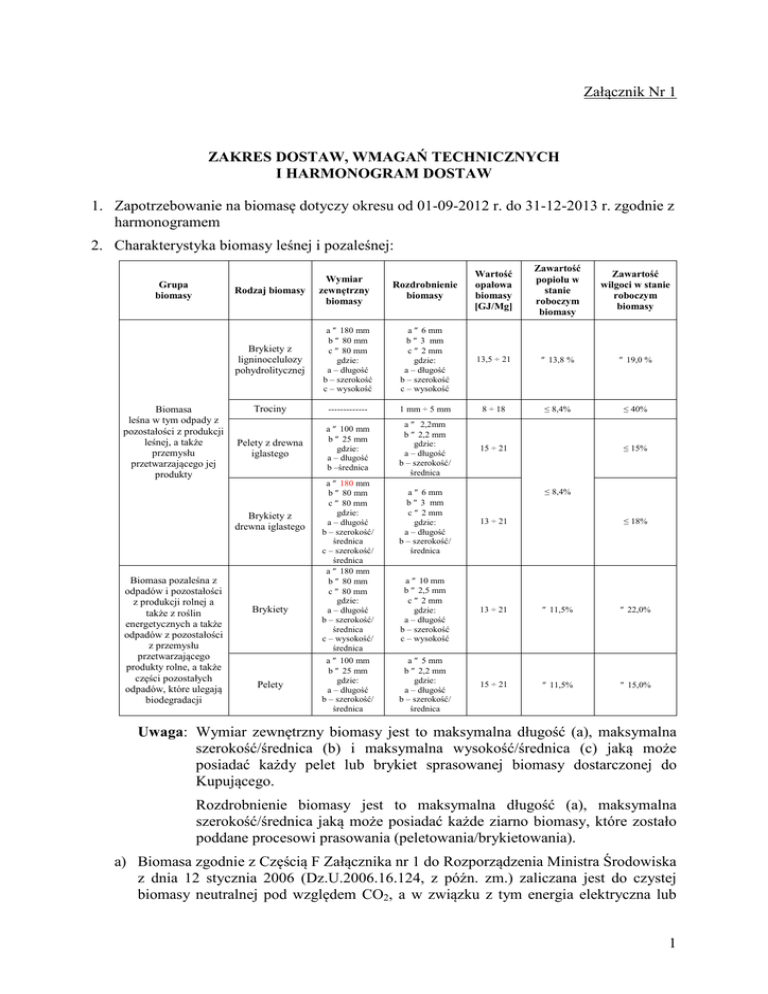 Załącznik Nr 1 ZAKRES DOSTAW, WMAGAŃ TECHNICZNYCH I HARMONOGRAM DOSTAW 1. Zapotrzebowanie na biomasę dotyczy okresu od 01-09-2012 r. do 31-12-2013 r. zgodnie z harmonogramem 2. Charakterystyka biomasy leśnej i pozaleśnej: Grupa biomasy Rozdrobnienie biomasy Wartość opałowa biomasy [GJ/Mg] Zawartość popiołu w stanie roboczym biomasy Zawartość wilgoci w stanie roboczym biomasy Brykiety z ligninocelulozy pohydrolitycznej a ≤ 180 mm b ≤ 80 mm c ≤ 80 mm gdzie: a – długość b – szerokość c – wysokość a ≤ 6 mm b ≤ 3 mm c ≤ 2 mm gdzie: a – długość b – szerokość c – wysokość 13,5 ÷ 21 ≤ 13,8 % ≤ 19,0 % Trociny ------------- 1 mm ÷ 5 mm 8 ÷ 18 ≤ 8,4% ≤ 40% a ≤ 100 mm b ≤ 25 mm gdzie: a – długość b –średnica a ≤ 2,2mm b ≤ 2,2 mm gdzie: a – długość b – szerokość/ średnica 15 ÷ 21 Rodzaj biomasy Biomasa leśna w tym odpady z pozostałości z produkcji leśnej, a także przemysłu przetwarzającego jej produkty Pelety z drewna iglastego Brykiety z drewna iglastego Biomasa pozaleśna z odpadów i pozostałości z produkcji rolnej a także z roślin energetycznych a także odpadów z pozostałości z przemysłu przetwarzającego produkty rolne, a także części pozostałych odpadów, które ulegają biodegradacji Brykiety Pelety Wymiar zewnętrzny biomasy a ≤ 180 mm b ≤ 80 mm c ≤ 80 mm gdzie: a – długość b – szerokość/ średnica c – szerokość/ średnica a ≤ 180 mm b ≤ 80 mm c ≤ 80 mm gdzie: a – długość b – szerokość/ średnica c – wysokość/ średnica a ≤ 100 mm b ≤ 25 mm gdzie: a – długość b – szerokość/ średnica ≤ 15% a ≤ 6 mm b ≤ 3 mm c ≤ 2 mm gdzie: a – długość b – szerokość/ średnica 13 ÷ 21 a ≤ 10 mm b ≤ 2,5 mm c ≤ 2 mm gdzie: a – długość b – szerokość c – wysokość 13 ÷ 21 ≤ 11,5% ≤ 22,0% a ≤ 5 mm b ≤ 2,2 mm gdzie: a – długość b – szerokość/ średnica 15 ÷ 21 ≤ 11,5% ≤ 15,0% ≤ 8,4% ≤ 18% Uwaga: Wymiar zewnętrzny biomasy jest to maksymalna długość (a), maksymalna szerokość/średnica (b) i maksymalna wysokość/średnica (c) jaką może posiadać każdy pelet lub brykiet sprasowanej biomasy dostarczonej do Kupującego. Rozdrobnienie biomasy jest to maksymalna długość (a), maksymalna szerokość/średnica jaką może posiadać każde ziarno biomasy, które zostało poddane procesowi prasowania (peletowania/brykietowania). a) Biomasa zgodnie z Częścią F Załącznika nr 1 do Rozporządzenia Ministra Środowiska z dnia 12 stycznia 2006 (Dz.U.2006.16.124, z późn. zm.) zaliczana jest do czystej biomasy neutralnej pod względem CO2, a w związku z tym energia elektryczna lub 1 cieplna wytworzona w wyniku jej spalania zostanie zaliczona do energii wytworzonej w odnawialnym źródle energii zgodnie z Rozporządzeniem Ministra Gospodarki z dnia 14 sierpnia 2008 r. (Dz.U.2008.156.969), z późn. zm.). b) Biomasa dostarczona do Kupującego nie będzie wytwarzana z odpadów drewna, które mogą zawierać związki fluorowcoorganiczne lub metale ciężkie, jako wynik obróbki środkami do konserwacji drewna lub powlekania, w skład których wchodzą w szczególności odpady drewna pochodzącego z budownictwa i odpady z rozbiórki, tj. spełnia wymogi §2 pkt.1 lit. e Rozporządzenia Ministra Środowiska z 22 kwietnia 2011 roku, w sprawie standardów emisyjnych z instalacji (Dz.U.2011r. Nr 95, poz 558). c) Biomasa dostarczona do Kupującego nie będzie zawierała frakcji pochodzących z drewna twardego – dębu i buku (Rozporządzenie Ministra Zdrowia z dnia 01 grudnia 2004 r. w sprawie substancji, preparatów, czynników lub procesów technologicznych środowisku pracy o działaniu rakotwórczym lub mutagennym w (Dz.U.2004.280.2771). d) Dostarczona przez Sprzedającego biomasa nie będzie zawierać w sobie substancji niebiodegradowalnych w stopniu odbiegającym od znanych naturalnych właściwości biomasy danego rodzaju, tj. nie będzie zawierać w sobie „dodatków” niebiodegradowalnych nie występujących naturalnie (np. farby, lakiery, impregnaty) lub w stopniu przekraczającym znane naturalne wielkości tych zanieczyszczeń, które wpływają na procesy spalania, a zatem wpływałyby na ilość pozyskiwanych świadectw pochodzenia. /Dla brykietów z ligninocelulozy pohydrolitycznej poziom zawartości biomasy w badanej próbce w stanie suchym bezpopiołowym (zbadanej metodą selektywnego rozpuszczania, opisaną w normie PN‐EN 15440: 2011), będzie zgodny z aktualnymi wymaganiami URE (zgodnie z załącznikiem Nr 2 do Informacji URE Nr 30/2011 z dnia 23 grudnia 2011 r. zawartość biomasy powinna wynosić ≥ 95 %, natomiast niebiomasy ≤ 5 % - bez niepewności pomiarowej)/. e) Dostarczona do Kupującego biomasa nie będzie zanieczyszczona frakcjami torfowymi i uwęglonymi skamieniałościami materiałów pochodzenia biomasowego (zgodnie z Załącznikiem nr 1 do Rozporządzenia Ministra Środowiska z dnia 12 stycznia 2006 r. – Dz.U.2006.16.124, z późn. zm.). f) W dostarczonej do Kupującego biomasie nie będzie zanieczyszczeń stałych takich jak: elementy metalowe, kamienie, gruz, korzenie, deski, itp. 2 3. Uogólniony harmonogram dostaw biomasy: Miesiąc dostaw Biomasa łącznie [Mg] RAZEM leśna Biomasa leśna [Mg] Brykiety z ligninocelulozy pohydrolitycznej Trocina Brykiety/pelety leśne 2 610,00 24 000,00 10 800,00 10 800,00 lis-12 24 000,00 10 800,00 gru-12 20 000,00 Rok 2012 sty-13 Biomasa pozaleśna [Mg] 2 610,00 8 190,00 8 190,00 13 200,00 13 200,00 2 610,00 8 190,00 13 200,00 9 000,00 2 170,00 6 830,00 11 000,00 92 000,00 41 400,00 10 000,00 31 400,00 50 600,00 20 000,00 6 000,00 2 000,00 4 000,00 14 000,00 wrz-12 24 000,00 paź-12 lut-13 26 000,00 7 800,00 2 600,00 5 200,00 18 200,00 mar-13 26 000,00 7 800,00 2 600,00 5 200,00 18 200,00 kwi-13 26 000,00 7 800,00 2 600,00 5 200,00 18 200,00 maj-13 26 000,00 7 800,00 2 600,00 5 200,00 18 200,00 5 200,00 18 200,00 cze-13 26 000