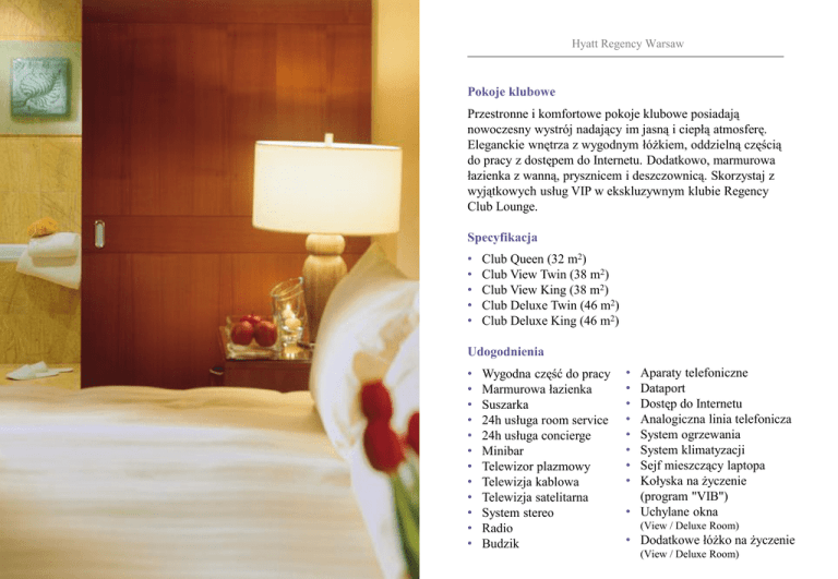 Hyatt Regency Warsaw Pokoje klubowe Przestronne i komfortowe pokoje klubowe posiadają nowoczesny wystrój nadający im jasną i ciepłą atmosferę. Eleganckie wnętrza z wygodnym łóżkiem, oddzielną częścią do pracy z dostępem do Internetu. Dodatkowo, marmurowa łazienka z wanną, prysznicem i deszczownicą. Skorzystaj z wyjątkowych usług VIP w ekskluzywnym klubie Regency Club Lounge. Specyfikacja • • • • • Club Queen (32 m2) Club View Twin (38 m2) Club View King (38 m2) Club Deluxe Twin (46 m2) Club Deluxe King (46 m2) Udogodnienia • • • • • • • • • • • • Wygodna część do pracy Marmurowa łazienka Suszarka 24h usługa room service 24h usługa concierge Minibar Telewizor plazmowy Telewizja kablowa Telewizja satelitarna System stereo Radio Budzik • • • • • • • • Aparaty telefoniczne Dataport Dostęp do Internetu Analogiczna linia telefonicza System ogrzewania System klimatyzacji Sejf mieszczący laptopa Kołyska na życzenie (program "VIB") • Uchylane okna (View / Deluxe Room) • Dodatkowe łóżko na życzenie (View / Deluxe Room) Hyatt Regency Warsaw Hyatt Regency Warsaw Ul. Belwederska 23 00-761 Warszawa, Polska Tel: +48 22 558 1234 Fax: +48 22 558 1235 E-Mail: [email protected]