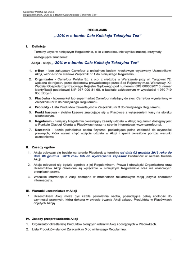 Carrefour Polska Sp. z o.o. Regulamin akcji „-20% w e-Bonie: Cała Kolekcja Tekstylna Tex” REGULAMIN „-20% w e-bonie: Cała Kolekcja Tekstylna Tex” I. Definicje Terminy użyte w niniejszym Regulaminie, o ile z kontekstu nie wynika inaczej, otrzymały następujące znaczenie: Akcja - akcja „-20% w e-bonie: Cała Kolekcja Tekstylna Tex” 1. e-Bon - bon zakupowy Carrefour z unikalnym kodem kreskowym wydawany Uczestnikowi Akcji, wzór e-Bonu stanowi Załącznik nr 1 do niniejszego Regulaminu. 2. Organizator - Carrefour Polska Sp. z o.o. z siedzibą w Warszawie przy ul. Targowej 72, wpisana do rejestru przedsiębiorców prowadzonego przez Sąd Rejonowy m.st. Warszawy, XII Wydział Gospodarczy Krajowego Rejestru Sądowego pod numerem KRS 0000020710, numer identyfikacji podatkowej NIP 937 000 81 68, o kapitale zakładowym w wysokości 1 970 719 050 złotych. 3. Placówka - hipermarket lub supermarket Carrefour należący do sieci Carrefour wymieniony w Załączniku nr 2 do niniejszego Regulaminu. 4. Produkty - Lista Produktów zawarta jest w Załączniku nr 3 do niniejszego Regulaminu. 5. Punkt kasowy - stoisko kasowe znajdujące się w Placówce z wyłączeniem kasy na stoisku alkoholowym. 6. Regulamin - niniejszy Regulamin określający zasady udziału w Akcji; regulamin dostępny jest w Punkcie Obsługi Klienta w Placówkach oraz na stronie internetowej www.carrefour.pl. 7. Uczestnik - każda pełnoletnia osoba fizyczna, posiadająca pełną zdolność do czynności prawnych, która wyrazi chęć wzięcia udziału w Akcji i spełni określone poniżej warunki uczestnictwa. II. Zasady ogólne 1. Akcja odbywać się będzie na terenie Placówek w terminie od dnia 02 grudnia 2016 roku do dnia 06 grudnia 2016 roku lub do wyczerpania zapasów Produktów w okresie trwania Akcji. 2. Akcja odbywać się będzie zgodnie z jej Regulaminem. Prawa i obowiązki Organizatora oraz Uczestników Akcji określone są wyłącznie w niniejszym Regulaminie oraz we właściwych przepisach prawa. 3. Wszelkie informacje o Akcji dostępne w materiałach reklamowych mają jedynie charakter informacyjny. III. Warunki uczestnictwa w Akcji 1. Uczestnikiem Akcji może być każda pełnoletnia osoba, posiadająca pełną zdolność do czynności prawnych, która dokona w okresie trwania Akcji zakupu Produktów w Placówkach objętych Akcją. IV. Zasady przeprowadzenia Akcji 1. Organizator określa listę Produktów biorących udział w Akcji i dostępnych w Placówkach. 2. Lista Produktów stanowi Załącznik nr 3 do niniejszego Regulaminu. 1 Carrefour Polska Sp. z o.o. Regulamin akcji „-20% w e-Bonie: Cała Kolekcja Tekstylna Tex” V. Warunki otrzymania e-Bonu za zakup Produktu. 1. Każdemu Uczestnikowi przysługuje jednorazowo prawo do otrzymania na zasadach określonych w niniejszym Regulaminie e-Bonu za zakup Produktu. 2. Warunkiem otrzymania e-Bonu jest nabycie przez Uczestnika Produktu w Placówce w okresie obowiązywania Akcji. 3. Wartość otrzymanego e-Bonu uzależniona jest od ostatecznej kwoty figurującej na paragonie fiskalnym potwierdzającym dokonane przez Uczestnika zakupu Produktów w Placówce, po uwzględnieniu wszystkich naliczanych bezpośrednio przy kasie rabatów przysługujących Uczestnikowi. Wartość e-Bonu przyznawanego za zakup Produktów wynosi 30% ich wartości brutto, z tym, że maksymalna wartość otrzymanego do jednej transakcji e- Bonu wynosi 200,00 złotych brutto, tj. e – Bony będą przyznawane o stałej wartości 200,00 złotych brutto, od ceny zakupu Produktów przekraczającej 1 000,00 złotych brutto. 4. e-Bony będą wydawane w Punkcie Kasowym przez kasjera tylko i wyłącznie po dokonaniu przez Uczestnika zapłaty za Produkty. e-Bon nie będzie wydawany w innym dniu niż dzień nabycia Produktów oraz tylko i wyłącznie bezpośrednio po dokonaniu przez Uczestnika zapłaty za Produkty. Po wydaniu e-Bonu kasjer dokona na paragonie fiskalnym adnotacji o treści ”Bon wydany sztuk….”. Wydanie kolejnego e-Bonu na podstawie paragonu, na którym znajduje się taka adnotacja nie będzie możliwe. 5. W żadnym przypadku wartość przyznanych łącznie Uczestnikowi bonów, w tym e-Bonów oraz bonów Carrefour, które mogą zostać przyznane Uczestnikowi na podstawie innych promocji, w których bierze udział, obowiązujących w tym samym czasie w Placówkach, nie może przekroczyć łącznie kwoty 760 złotych do jednego paragonu. VI. e-Bon 1. e-Bon jest bonem na okaziciela, uprawniającymi okaziciela e-Bonu do częściowej lub całkowitej zapłaty za zakupione produkty oferowane do sprzedaży w Placówkach. Możliwość realizacji eBonu w terminie jego ważności uwarunkowana jest zakupem produktów w Placówkach. 2. e-Bon Carrefour podlega realizacji wyłącznie w terminie na nim określonym, tj. od 07.12.2016 do 24.12.2016 roku. 3. W przypadku, gdy wartość zakupionych Produktów będzie niższa od wartości nominalnej eBonu Placówka nie zwraca różnicy pomiędzy wartością zakupionych produktów, a wartością eBonu Carrefour. 4. W przypadku, gdy wartość Produktów będzie wyższa od wartości e-Bonu, jego okaziciel będzie zobowiązany dopłacić różnicę. 5. W przypadku utraty, zniszczenia lub uszkodzenia e-Bonu po jego wydaniu, duplikaty nie będą wydawane, a okazicielowi e-Bonu nie przysługują jakiekolwiek roszczenia z tego tytułu. 6. e-Bon nie podlega wymianie ani zwrotowi. 7. e-Bony nie są realizowane w kasach samoobsługowych. VII. Postępowanie reklamacyjne 1. Każdemu Uczestnikowi Akcji przysługuje prawo wniesienia pisemnej reklamacji, w zakresie niezgodności przeprowadzenia Akcji z niniejszym Regulaminem w czasie trwania Akcji lub nie później niż w terminie do 90 dni od daty jego zakończenia. Za datę wniesienia reklamacji uważa się datę stempla pocztowego na przesyłce zawierającej reklamację. 2. Reklamacje należy kierować na piśmie, drogą pocztową do: Carrefour Polska Sp. z o. o., ul. Targowa 72, 03-734 Warszawa, z dopisk