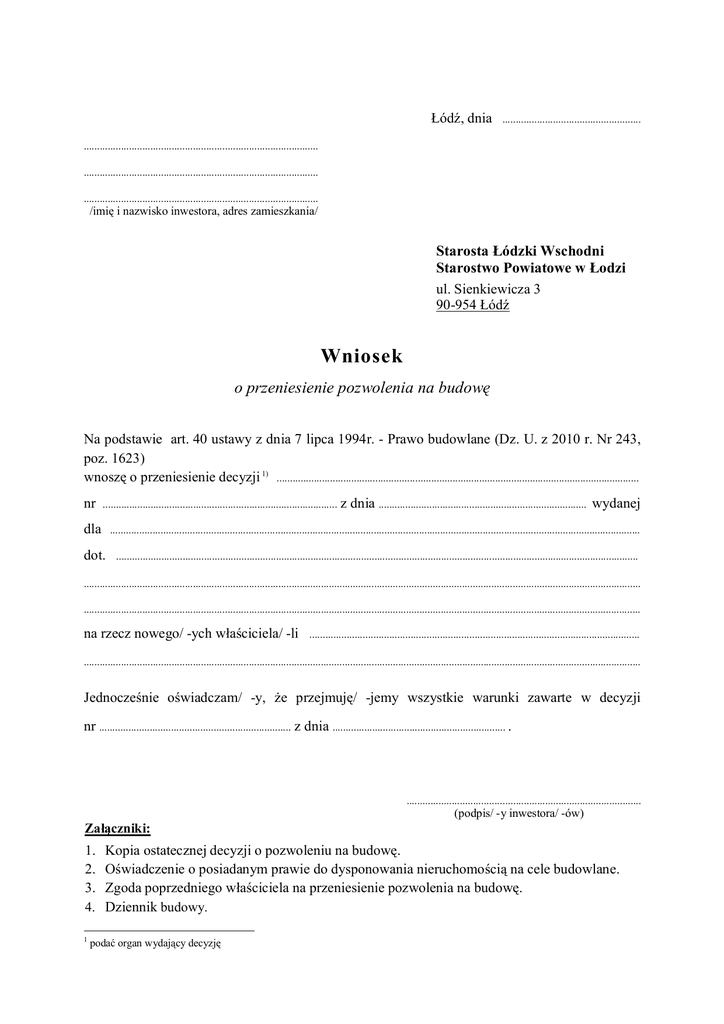 Łódź, dnia .................................................... ........................................................................................ ........................................................................................ ........................................................................................ /imię i nazwisko inwestora, adres zamieszkania/ Starosta Łódzki Wschodni Starostwo Powiatowe w Łodzi ul. Sienkiewicza 3 90-954 Łódź Wniosek o przeniesienie pozwolenia na budowę Na podstawie art. 40 ustawy z dnia 7 lipca 1994r. - Prawo budowlane (Dz. U. z 2010 r. Nr 243, poz. 1623) wnoszę o przeniesienie decyzji 1) ........................................................................................................................................ nr ........................................................................................ z dnia .............................................................................. wydanej dla ....................................................................................................................................................................................................... dot. .................................................................................................................................................................................................... ................................................................................................................................................................................................................. ................................................................................................................................................................................................................. na rzecz nowego/ -ych właściciela/ -li ............................................................................................................................ ................................................................................................................................................................................................................. Jednocześnie oświadczam/ -y, że przejmuję/ -jemy wszystkie warunki zawarte w decyzji nr ........................................................................ z dnia ................................................................. . ........................................................................................ (podpis/ -y inwestora/ -ów) Załączniki: 1. 2. 3. 4. 1 Kopia ostatecznej decyzji o pozwoleniu na budowę. Oświadczenie o posiadanym prawie do dysponowania nieruchomością na cele budowlane. Zgoda poprzedniego właściciela na przeniesienie pozwolenia na budowę. Dziennik budowy. podać organ wydający decyzję