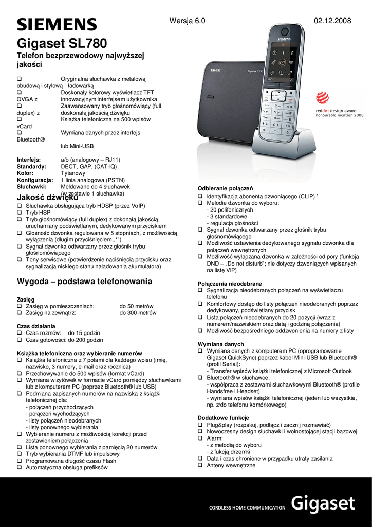 Wersja 6.0 02.12.2008 Gigaset SL780 Telefon bezprzewodowy najwy szej jako ci obudow i stylow QVGA z duplex) z vCard Wymiana danych przez interfejs Bluetooth® lub Mini-USB Interfejs: Standardy: Kolor: Konfiguracja: Słuchawki: Jako Oryginalna słuchawka z metalow ładowark Doskonały kolorowy wy wietlacz TFT innowacyjnym interfejsem u ytkownika Zaawansowany tryb gło nomówi cy (full doskonał jako ci d wi ku Ksi ka telefoniczna na 500 wpisów a/b (analogowy – RJ11) DECT, GAP, (CAT-IQ) Tytanowy 1 linia analogowa (PSTN) Meldowane do 4 słuchawek (w zestawie 1 słuchawka) d wi ku Słuchawka obsługuj ca tryb HDSP (przez VoIP) Tryb HSP Tryb gło nomówi cy (full duplex) z dokonał jako ci , uruchamiany pod wietlanym, dedykowanym przyciskiem Gło no dzwonka regulowana w 5 stopniach, z mo liwo ci wył czenia (długim przyci ni ciem „*”) Sygnał dzwonka odtwarzany przez gło nik trybu gło nomówi cego Tony serwisowe (potwierdzenie naci ni cia przycisku oraz sygnalizacja niskiego stanu naładowania akumulatora) Wygoda – podstawa telefonowania Zasi g Zasi g w pomieszczeniach: Zasi g na zewn trz: do 50 metrów do 300 metrów Czas działania Czas rozmów: do 15 godzin Czas gotowo ci: do 200 godzin Ksi ka telefoniczna oraz wybieranie numerów Ksi ka telefoniczna z 7 polami dla ka dego wpisu (imi , nazwisko, 3 numery, e-mail oraz rocznica) Przechowywanie do 500 wpisów (format vCard) Wymiana wizytówek w formacie vCard pomi dzy słuchawkami lub z komputerem PC (poprzez Bluetooth® lub USB) Podmiana zapisanych numerów na nazwiska z ksi ki telefonicznej dla: - poł cze przychodz cych - poł cze wychodz cych - listy poł cze nieodebranych - listy ponownego wybierania Wybieranie numeru z mo liwo ci korekcji przed zestawieniem poł czenia Lista ponownego wybierania z pami ci 20 numerów Tryb wybierania DTMF lub impulsowy Programowana długo czasu Flash Automatyczna obsługa prefiksów Odbieranie poł cze Identyfikacja abonenta dzwoni cego (CLIP) 1 Melodie dzwonka do wyboru: - 20 polifonicznych - 3 standardowe - regulacja gło no ci Sygnał dzwonka odtwarzany przez gło nik trybu gło nomówi cego Mo liwo ustawienia dedykowanego sygnału dzwonka dla poł cze wewn trznych Mo liwo wył czana dzwonka w zale no ci od pory (funkcja DND – „Do not disturb”; nie dotyczy dzwoni cych wpisanych na list VIP) Poł czenia nieodebrane Sygnalizacja nieodebranych poł cze na wy wietlaczu telefonu Komfortowy dost p do listy poł cze nieodebranych poprzez dedykowany, pod wietlany przycisk Lista poł cze nieodebranych do 20 pozycji (wraz z numerem/nazwiskiem oraz dat i godzin poł czenia) Mo liwo bezpo redniego oddzwonienia na numery z listy Wymiana danych Wymiana danych z komputerem PC (oprogramowanie Gigaset QuickSync) poprzez kabel Mini-USB lub Bluetooth® (profil Serial): - Transfer wpisów ksi ki telefonicznej z Microsoft Outlook Bluetooth® w słuchawce: - współpraca z zestawami słuchawkowymi Bluetooth® (profile Handsfree i Headset) - wymiana wpisów ksi ki telefonicznej (jeden lub wszystkie, np. z/do telefonu komórkowego) Dodatkowe funkcje Plug&play (rozpakuj, podł cz i zacznij rozmawia ) Nowoczesny design słuchawki i wolnostoj cej stacji bazowej Alarm: - z melodi do wyboru - z fukcj drzemki Data i czas chronione w przypadku utraty zasilania Anteny wewn trzne Wersja 6.0 02.12.2008 Wy wietlacz i funkcje menu Współpracuj ce akcesoria Wy wietlacz Graficzny, pod wietlany, kolorowy wy wietlacz (TFT QVGA, 256 ty . Kolorów, 240 x 320 pikseli) W trybie czuwania: - wy wietlanie daty i godziny lub zegara cyfrowego jako wygaszacz ekranu W trybie oczekiwania: - wy wietlanie daty i godziny - wy wietlanie siły sygnału radiowego i stanu naładowania akumulatora - wy wietlanie skrótów funkcyjnych (przyciski funkcyjne wy wietlacza) W trakcie rozmowy: - wy wietlanie czasu bie cej rozmowy Funkcje systemu z wi cej ni 1 słuchawk Menu W pierwszej warstwie menu oparte na ikonach, dalej w formie przewijanej listy Łatwa obsługa dzi ki przyciskom funkcyjnym wy wietlacza Menu w 29 j zykach (zale nie od regionu) Klawiatura Nowa, ergonomiczna klawiatura wykonana z wysokiej jako ci materiałów (technologia Metaldom) 24 przyciski (numeryczne i funkcyjne), w tym 4 przyciski funkcyjne wy wietlacza 5-kierunkowy, centralny przycisk nawigacyjny Pod wietlana klawiatura Kolor pod wietlenia: biały Pod wietlane (na czerwono) przyciski trybu gło nomówi cego oraz przycisk wiadomo ci Blokada klawiatury (długie przyci ni cie „#”) Wyciszenie dzwonka (długie przyci ni cie „*”) Przycisk Flash (R) (długie przyci ni cie aktywuje pauz we wprowadzanym numerze (P)) Dedykowany przycisk poł cze wewn trznych (Interkom) Funkcje SMS Obsługa wiadomo ci SMS do 612 znaków (poł czenie 4 wiadomo ci) 1 Pami na ok. 50. krótkich wiadomo ci SMS Wysyłanie e-mail przez SMS Mo liwo zapisania numerów z wiadomo ci SMS w ksi ce telefonicznej SMS protocol 1 ECO DECT Do 60% ni sze zu ycie energii w porównaniu do zwykłych telefonów bezprzewodowych Siemens (energooszcz dny zasilacz impulsowy na wyposa eniu) Wył czanie transmisji radiowej po odstawieniu słuchawki do ładowarki (gdy do stacji bazowej zalogowana jest tylko 1 słuchawka) Tryb Eco: ograniczenie mocy transmisji radiowej o 80% Tryb Eco+: ograniczenie mocy transmisji radiowej w trybie czuwania o 100% w stacji bazowej i wszystkich zalogowanych słuchawkach Płynna redukcja mocy w zale no ci od odległo ci mi dzy słuchawk a stacj bazow Gigaset Repeater Maksymalnie 6 słuchawek Gigaset Zestaw słuchawkowy Bluetooth® (opcjonalny, nie oferowany przez Gigaset) Przewodowy zestaw słuchawkowy (opcjonalny, nie oferowany przez Gigaset) Darmowe rozmowy pomi dzy słuchawkami 2 rozmowy jednocze nie (1 wewn trzna + 1 zewn trzna) Kopiowanie ksi ki telefonicznej pomi dzy słuchawkami Mo liwo wywołania ogólnego, lub bezpo redniego w przypadku poł cze wewn trznych Konferencja trójstronna (1 rozmówca zewn trzny + 2 wewn trznych) Sygnalizacja poł czenia zewn trznego na wszystkich słuch