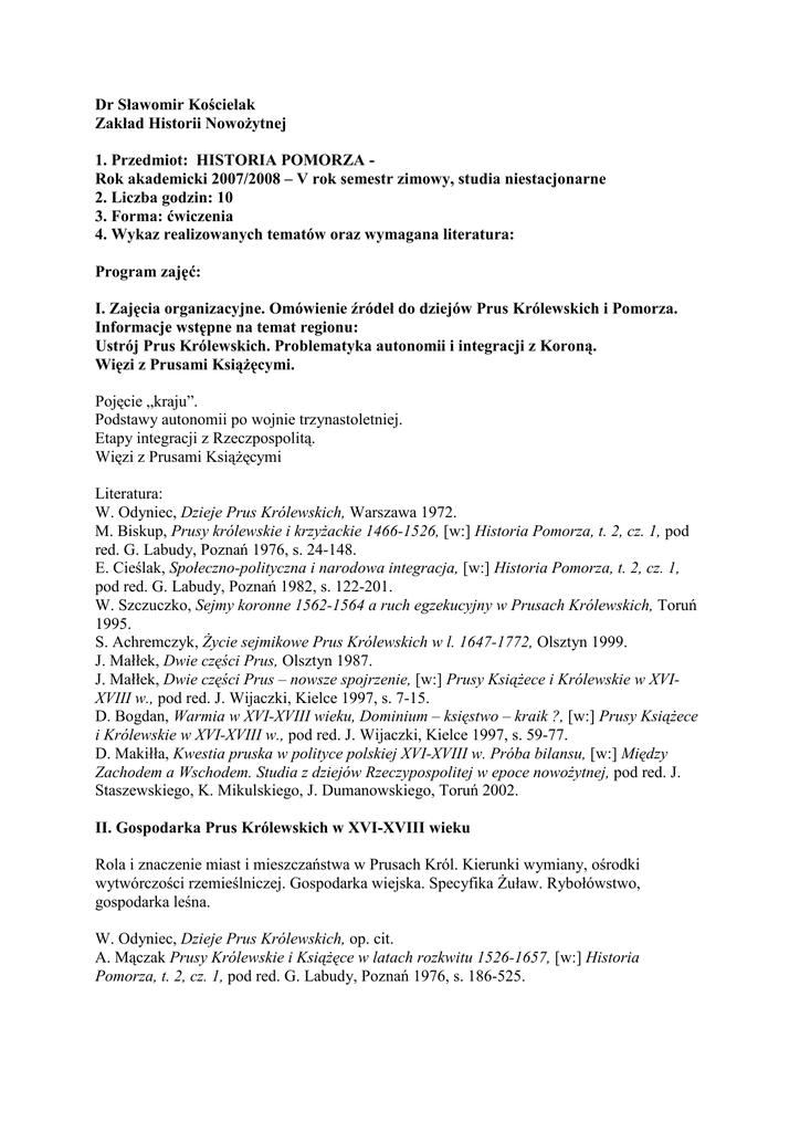Dr Sławomir Kościelak Zakład Historii NowoŜytnej 1. Przedmiot: HISTORIA POMORZA Rok akademicki 2007/2008 – V rok semestr zimowy, studia niestacjonarne 2. Liczba godzin: 10 3. Forma: ćwiczenia 4. Wykaz realizowanych tematów oraz wymagana literatura: Program zajęć: I. Zajęcia organizacyjne. Omówienie źródeł do dziejów Prus Królewskich i Pomorza. Informacje wstępne na temat regionu: Ustrój Prus Królewskich. Problematyka autonomii i integracji z Koroną. Więzi z Prusami KsiąŜęcymi. Pojęcie „kraju”. Podstawy autonomii po wojnie trzynastoletniej. Etapy integracji z Rzeczpospolitą. Więzi z Prusami KsiąŜęcymi Literatura: W. Odyniec, Dzieje Prus Królewskich, Warszawa 1972. M. Biskup, Prusy królewskie i krzyŜackie 1466-1526, [w:] Historia Pomorza, t. 2, cz. 1, pod red. G. Labudy, Poznań 1976, s. 24-148. E. Cieślak, Społeczno-polityczna i narodowa integracja, [w:] Historia Pomorza, t. 2, cz. 1, pod red. G. Labudy, Poznań 1982, s. 122-201. W. Szczuczko, Sejmy koronne 1562-1564 a ruch egzekucyjny w Prusach Królewskich, Toruń 1995. S. Achremczyk, śycie sejmikowe Prus Królewskich w l. 1647-1772, Olsztyn 1999. J. Małłek, Dwie części Prus, Olsztyn 1987. J. Małłek, Dwie części Prus – nowsze spojrzenie, [w:] Prusy KsiąŜece i Królewskie w XVIXVIII w., pod red. J. Wijaczki, Kielce 1997, s. 7-15. D. Bogdan, Warmia w XVI-XVIII wieku, Dominium – księstwo – kraik ?, [w:] Prusy KsiąŜece i Królewskie w XVI-XVIII w., pod red. J. Wijaczki, Kielce 1997, s. 59-77. D. Makiłła, Kwestia pruska w polityce polskiej XVI-XVIII w. Próba bilansu, [w:] Między Zachodem a Wschodem. Studia z dziejów Rzeczypospolitej w epoce nowoŜytnej, pod red. J. Staszewskiego, K. Mikulskiego, J. Dumanowskiego, Toruń 2002. II. Gospodarka Prus Królewskich w XVI-XVIII wieku Rola i znaczenie miast i mieszczaństwa w Prusach Król. Kierunki wymiany, ośrodki wytwórczości rzemieślniczej. Gospodarka wiejska. Specyfika śuław. Rybołówstwo, gospodarka leśna. W. Odyniec, Dzieje Prus Królewskich, op. cit. A. Mączak Prusy Królewskie i KsiąŜęce w latach rozkwitu 1526-1657, [w:] Historia Pomorza, t. 2, cz. 1, pod red. G. Labudy, Poznań 1976, s. 186-525. K. Ciesielska, Osadnictwo olęderskie w Prusach Królewskich i na Kujawach w świetle kontraktów osadniczych, [w:] Studia i Materiały do Dziejów Wielkopolski i Pomorza, t. 4, 1958, s. 220-255. S. Cackowski, Gospodarstwo wiejskie w dobrach biskupstwa i kapituły chełmińskiej w XVIIXVIII wieku, Część 1 – Gospodarstwo chłopskie, „Roczniki TNT”, R. 64, 1959, z. 2, s. 65236. K. Mikulski, Osadnictwo wiejskie województwa pomorskiego od połowy XVI do końca XVII w., „Roczniki TNT”, R. 86, z.2, Toruń 1994. M. Kanior, Z badań nad strukturą dochodów wielkiej własności. Dobra pomorskie biskupstwa włocławskiego w drugiej połowie XVIII w., Wrocław-Warszawa-Kraków 1990. III. Reformacja i kontrreformacja w Prusach Królewskich. Stosunki wyznaniowe Pozycja Kościoła katolickiego na Pomorzu u progu kryzysu na przełomie XV/XVI wieku. Początki reformacji w latach 20-tych XVI wieku. Sukces protestantyzmu w połowie XVI wieku. Zjawisko tzw. „drugiej” i „trzeciej” reformacji. Przeciwdziałanie Kościoła katolickiego – kontrreformacja, reforma struktur kościelnych. Grupy wyznaniowe na obszarze Prus Królewskich w XVI-XVIII wieku. A. Mączak, Reformacja i kontrreformacja w Prusach Królewskich, [w:] Historia Pomorza, t. 2, cz. 1, pod red. G. Labudy, Poznań 1976, s. 405-432. M. Kosman, Stosunki wyznaniowe, [w:] Historia Pomorza, t. 2, cz. 1, pod red. G. Labudy, Poznań 1982, s. 221-270. K. Cieślak, Między Rzymem, Wittenbergą a Genewą. Sztuka Gdańska jako miasta podzielonego wyznaniowo, Wrocław 2000. S. Kościelak, Jezuici w Gdańsku od drugiej połowy XVI do końca XVIII w., Gdańsk-Kraków 2003. (zwłaszcza strony 20-44, 259-334) W. Szulist, Przeszłość obecnych obszarów diecezji pelplińskiej do 1772 r., Pelplin 2000. M. Pawlak, Reformacja i kontrreformacja w Elblągu w XVI-XVIII wieku, Bydgoszcz 1994. A. Klemp, Protestanci w dobrach prywatnych w Prusach Królewskich od drugiej połowy XVI do połowy XVIII wieku, Gdańsk 1994. E. Kizik, Mennonici w Gdańsku, Elblągu i na śuławach Wiślanych w drugiej połowie XVII i w XVIII w., Gdańsk 1994. J. Tazbir, Antytrynitaryzm w Gdańsku i okolicach, „Odrodzenie i reformacja w Polsce”, t. XXI, 1976, s. 57-82. M. Wajsblum, Quakers and Poland 1661-1919, „The Polish Review”, Vol. XI, No 2, 1966, s. 11-22. Z. H. Nowak, Dzieje śydów w Prusach Królewskich do roku 1772. Charakterystyka, [w:] śydzi w dawnej Rzeczypospolitej. Materiały z konferencji „Autonomia śydów w Rzeczypospolitej szlacheckiej”. Międzywydziałowy Zakład Historii i Kultury śydów w Polsce, Uniwersytet Jagielloński, 22-26 IX 1986, red. Nauk. A. Link-Lenczowski, T. Polański, Wrocław – Warszawa – Kraków 1991, s. 137-143. IV. Kultura, obyczajowość, Ŝycie codzienne Centra kulturotwórcze Prus Królewskich. Osiągnięcia, zdobycze, wzloty i upadki. Kultura dnia codziennego. Obyczajowość szlachecka, miejska, wiejska. Mentalność mieszczanina gdańskiego, toruńskiego. W. Odyniec, śycie i obyczaje ludu pomorskiego w XVII i XVIII w., Gdynia 1966. S. Salmonowicz, Toruń w czasach Baroku i Oświecenia, Toruń 1982. Elity mieszczańskie i szlacheckie Prus Królewskich i Kujaw w XIV-XVIII w., zbiór studiów pod red. J. Staszewskiego, Toruń 1995. Mieszczaństwo gdańskie, pod red. S. Salmonowicza, Gdańsk 1997. M. Bogucka, śyć w dawnym Gdańsku, Warszawa 1997. L. Mokrzecki, Wokół staropolskiej nauki i oświaty. Gdańsk – Prusy Królewskie – Rzeczpospolita, Gdańsk 2001. E. Kizik, Wesele, kilka chrztów i pogrzebów, Gdańsk 2001. S. Salmonowicz, Prusy Królewskie w XVII-XVIII wieku. Studia z dziejów kultury, Toruń 2002. V. Prusy KsiąŜęce jako lenno Korony – Rzeczpospolitej 1525-1657. Brandenburgia – Prusy Elektorskie – Królestwo Prus. Wojna p