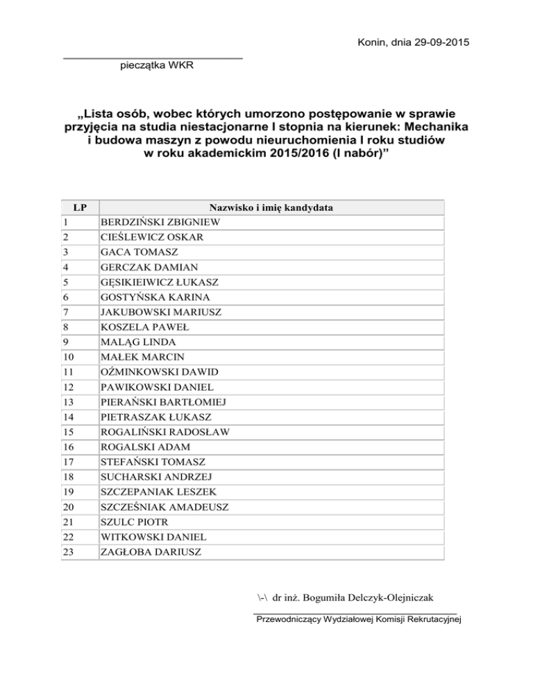 Konin, dnia 29-09-2015 ______________________________ pieczątka WKR „Lista osób, wobec których umorzono postępowanie w sprawie przyjęcia na studia niestacjonarne I stopnia na kierunek: Mechanika i budowa maszyn z powodu nieuruchomienia I roku studiów w roku akademickim 2015/2016 (I nabór)” LP Nazwisko i imię kandydata 1 BERDZIŃSKI ZBIGNIEW 2 CIEŚLEWICZ OSKAR 3 GACA TOMASZ 4 GERCZAK DAMIAN 5 GĘSIKIEIWICZ ŁUKASZ 6 GOSTYŃSKA KARINA 7 JAKUBOWSKI MARIUSZ 8 KOSZELA PAWEŁ 9 MALĄG LINDA 10 MAŁEK MARCIN 11 OŹMINKOWSKI DAWID 12 PAWIKOWSKI DANIEL 13 PIERAŃSKI BARTŁOMIEJ 14 PIETRASZAK ŁUKASZ 15 ROGALIŃSKI RADOSŁAW 16 ROGALSKI ADAM 17 STEFAŃSKI TOMASZ 18 SUCHARSKI ANDRZEJ 19 SZCZEPANIAK LESZEK 20 SZCZEŚNIAK AMADEUSZ 21 SZULC PIOTR 22 WITKOWSKI DANIEL 23 ZAGŁOBA DARIUSZ \-\ dr inż. Bogumiła Delczyk-Olejniczak __________________________________ Przewodniczący Wydziałowej Komisji Rekrutacyjnej Uwaga! Wyżej wymienione osoby mają możliwość złożenia dokumentów rekrutacyjnych na inny kierunek studiów pierwszego stopnia oferowany przez Uczelnię w roku akademickim 2015/2016 (dotyczy kandydatów, którzy zadeklarowali wyłącznie powyższy – nieuruchomiony kierunek studiów). W przypadku dokonania wyboru innego kierunku studiów, kandydat jest zobowiązany do ponownego przystąpienia do procesu rekrutacji w dodatkowym naborze oraz dostarczenia do Centrum Rekrutacji i Karier PWSZ w Koninie wydrukowanego podania w sprawie przyjęcia na studia na zadeklarowany przez siebie nowy kierunek studiów. Wszystkie pozostałe dokumenty złożone przez kandydata w procesie rekrutacji na nieuruchomiony kierunek studiów, w tym również uiszczona opłata rekrutacyjna – w przypadku wyboru innego kierunku studiów w dodatkowym naborze rekrutacji – zostaną przekazane odpowiedniej Wydziałowej Komisji Rekrutacyjnej. Ponadto w przypadku deklaracji na kierunki studiów: bezpieczeństwo wewnętrzne, fizjoterapia, wychowanie fizyczne – kandydat jest zobowiązany dostarczyć dodatkowo zaświadczenie od lekarza medycyny pracy o braku przeciwwskazań do podjęcia studiów na ww. kierunkach studiów, natomiast na kierunek dietetyka – zaświadczenie o braku przeciwskazań do podjęcia nauki na tym kierunku. Termin rekrutacji upływa w dniu 30 października 2015 roku. W przypadku rezygnacji z podjęcia kształcenia na innym kierunku studiów oferowanym przez Uczelnię, kandydatowi przysługuje zwrot uiszczonej opłaty rekrutacyjnej. Aby otrzymać zwrot opłaty rekrutacyjnej należy w terminie do 30 października 2015 r. złożyć pisemny wniosek o zwrot opłaty rekrutacyjnej (wzór wniosku do pobrania ze strony internetowej Uczelni www.pwsz.konin.edu.pl (dział „Rekrutacja”, zakładka „Opłata rekrutacyjna”). Wniosek należy złożyć w Uczelni – Centrum Rekrutacji i Karier PWSZ w Koninie lub przesłać drogą pocztową na adres: Państwowa Wyższa Szkoła Zawodowa w Koninie – Centrum Rekrutacji i Karier, ul. Wyszyńskiego 3C, 62-510 Konin. Wnioski złożone po ww. terminie nie będą rozpatrywane.