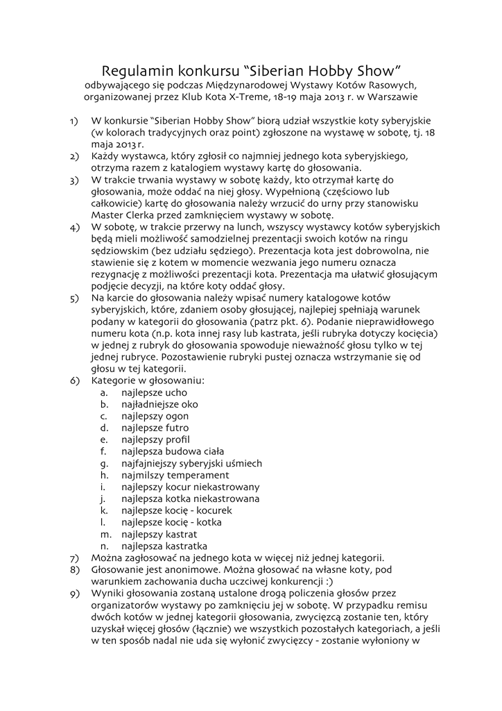 Regulamin konkursu “Siberian Hobby Show” odbywającego się podczas Międzynarodowej Wystawy Kotów Rasowych, organizowanej przez Klub Kota X-Treme, 18-19 maja 2013 r. w Warszawie 1) 2) 3) 4) 5) 6) 7) 8) 9) W konkursie “Siberian Hobby Show” biorą udział wszystkie koty syberyjskie (w kolorach tradycyjnych oraz point) zgłoszone na wystawę w sobotę, tj. 18 maja 2013 r. Każdy wystawca, który zgłosił co najmniej jednego kota syberyjskiego, otrzyma razem z katalogiem wystawy kartę do głosowania. W trakcie trwania wystawy w sobotę każdy, kto otrzymał kartę do głosowania, może oddać na niej głosy. Wypełnioną (częściowo lub całkowicie) kartę do głosowania należy wrzucić do urny przy stanowisku Master Clerka przed zamknięciem wystawy w sobotę. W sobotę, w trakcie przerwy na lunch, wszyscy wystawcy kotów syberyjskich będą mieli możliwość samodzielnej prezentacji swoich kotów na ringu sędziowskim (bez udziału sędziego). Prezentacja kota jest dobrowolna, nie stawienie się z kotem w momencie wezwania jego numeru oznacza rezygnację z możliwości prezentacji kota. Prezentacja ma ułatwić głosującym podjęcie decyzji, na które koty oddać głosy. Na karcie do głosowania należy wpisać numery katalogowe kotów syberyjskich, które, zdaniem osoby głosującej, najlepiej spełniają warunek podany w kategorii do głosowania (patrz pkt. 6). Podanie nieprawidłowego numeru kota (n.p. kota innej rasy lub kastrata, jeśli rubryka dotyczy kocięcia) w jednej z rubryk do głosowania spowoduje nieważność głosu tylko w tej jednej rubryce. Pozostawienie rubryki pustej oznacza wstrzymanie się od głosu w tej kategorii. Kategorie w głosowaniu: a. najlepsze ucho b. najładniejsze oko c. najlepszy ogon d. najlepsze futro e. najlepszy profil f. najlepsza budowa ciała g. najfajniejszy syberyjski uśmiech h. najmilszy temperament i. najlepszy kocur niekastrowany j. najlepsza kotka niekastrowana k. najlepsze kocię - kocurek l. najlepsze kocię - kotka m. najlepszy kastrat n. najlepsza kastratka Można zagłosować na jednego kota w więcej niż jednej kategorii. Głosowanie jest anonimowe. Można głosować na własne koty, pod warunkiem zachowania ducha uczciwej konkurencji :) Wyniki głosowania zostaną ustalone drogą policzenia głosów przez organizatorów wystawy po zamknięciu jej w sobotę. W przypadku remisu dwóch kotów w jednej kategorii głosowania, zwycięzcą zostanie ten, który uzyskał więcej głosów (łącznie) we wszystkich pozostałych kategoriach, a jeśli w ten sposób nadal nie uda się wyłonić zwycięzcy - zostanie wyłoniony w 10) 11) 12) 13) 14) drodze losowania. Wyniki zostaną ogłoszonę w niedzielę, tj. 19 maja 2013, podczas przerwy na lunch. Zwycięzcy kategorii otrzymają następujące wyróżnienia: ⁃ zwycięzcy każdej kategorii - pamiątkową rozetę ⁃ zwycięzcy kategorii pkt. 6 lit. i do n - nagrody rzeczowe. Odbiór nagród rzeczowych możliwy jest wyłącznie na wystawie, nieodebrane nagrody ulegają przepadkowi na rzecz klubu organizatora. Nieodebrane rozety zostaną wysłane pocztą do zwycięzców. Organizator zastrzega sobie prawo do zmiany podziału nagród rzeczowych, jeśli wystąpią ku temu istotne powody. Organizator zastrzega sobie prawo do anulowania konkursu, jeżeli: a) na wystawę w dniu 18 maja będzie zgłoszonych mniej niż 10 kotów syberyjskich; b) mniej niż połowa rozdanych kart do głosowania zostanie wrzucona do urny c) mniej niż połowa kart do głosowania będzie wypełniona w sposób prawidłowy (za kartę wypełnioną prawidłowo uważa się taką, gdzie w co najmniej 2/3 kategorii został oddany ważny głos, nie wstrzymujący się).