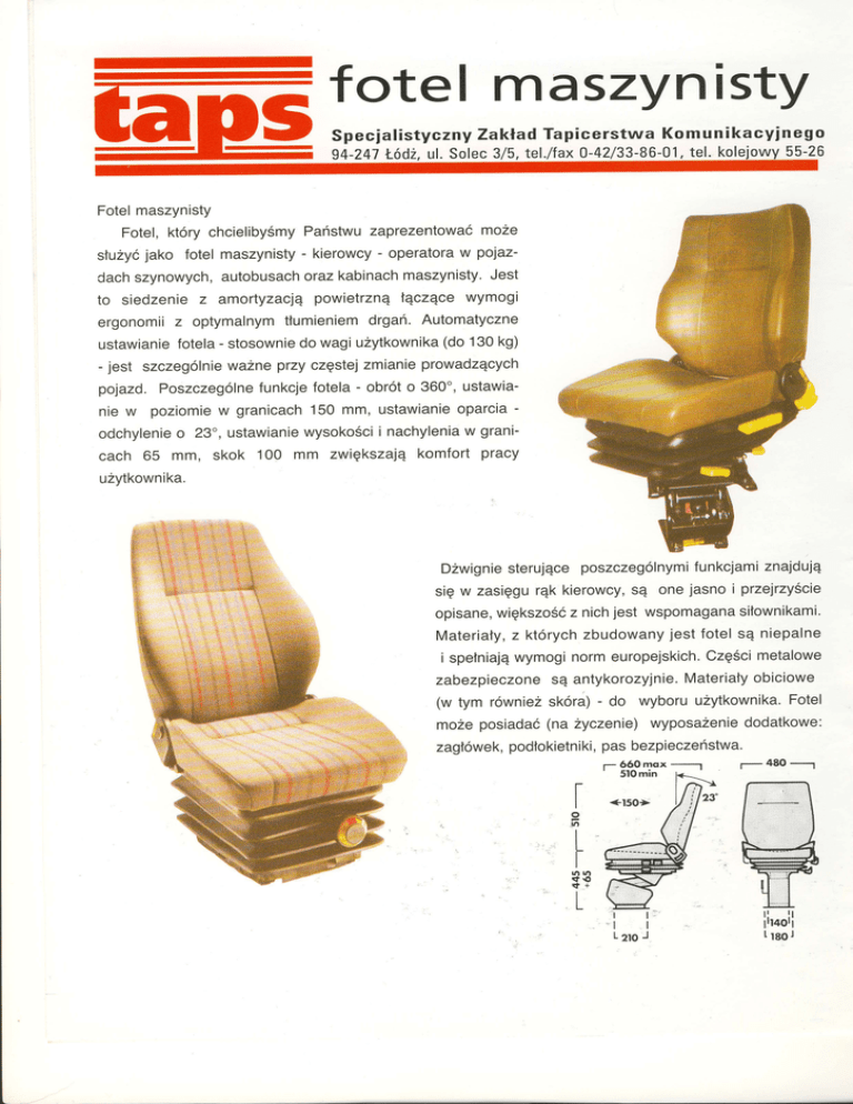 fotel maszynisty S p ecja I istyczny Zaklad Tapi c erstwa Ko m u n i ka cyi n e g o 55-26 94-247t-6d2,ul. Solec3/5, tel.ltax 0-42/33-86-01,tel. Fotelmaszynisty Fotel, kt6ry chcieliby5myPanstwu zaprezentowaimoze stuzycjako fotel maszynisty- kierowcy- operatoraw pojazdachszynowych,autobusachorazkabinachmaszynisty.Jest to siedzenie z amortyzacj4powietrzn4 l4czqce wymogi ergonomiiz optymalnymtlumieniemdrgan. Automatyczne (do 130 kg) ustawianiefotela- stosowniedo wagi uzytkownika - jest szczeg6lnie wa2neprzy czgstejzmianieprowadz4cych funkcjefotela- obr6t o 360o,ustawiapojazd. Poszczeg6lne oparcianie w poziomiew granicach150 mm, ustawianie odchylenieo 23o,ustawianiewysoko6cii nachyleniaw granicach 65 ffiffi, skok 100 mm zwigkszaj4 komfort pracy uzytkownika. funkcjamiznajduj4 Dzwigniesteruj4ce poszczeg6lnymi sig w zasiggurqk kierowcy,sq one jasno i przejrzy6cie sitownikami' z nichjest wspomagana opisane,wiqkszo66 Materialy,z kt6rychzbudowanyjest fotel sE niepalne CzgScimetalowe i spetniaj4wymoginormeuropejskich. zabezpieczonesA antykorozyjnie. Materiafyobiciowe (w tym rowniezsk6ra)- Oo wyboruuzytkownika.Fotel moze posiada6(na 2yczenie) wyposazeniedodatkowe: pas bezpieczefstwa. zagl6wek,podfokietniki, ------r r' 66Omox SlOmin kI I I o ro II l- I 1'! v! (l€ T + IL r- 48O--r