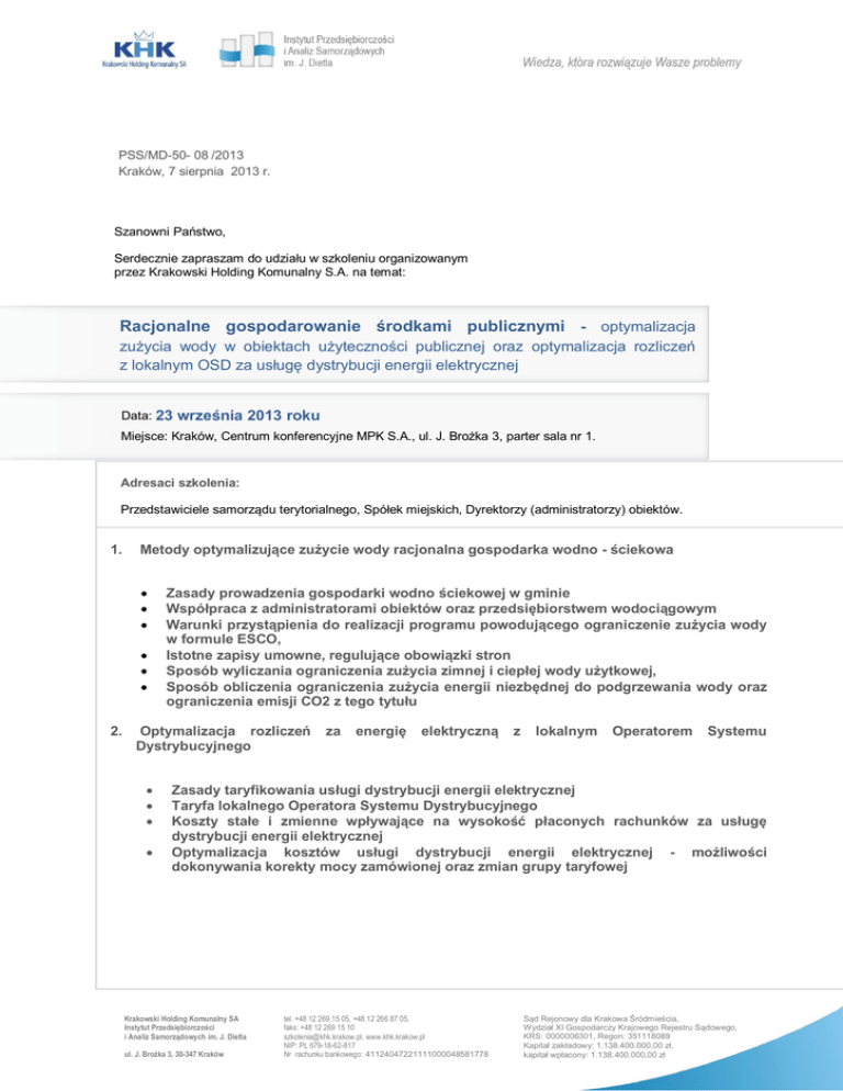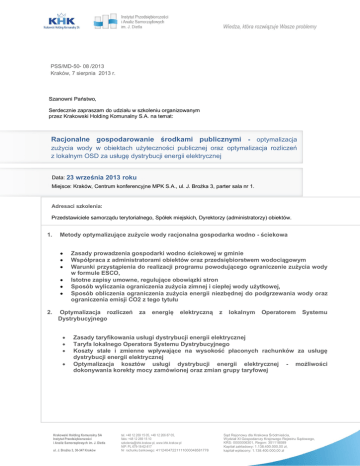 PSS/MD-50- 08 /2013 Kraków, 7 sierpnia 2013 r. Szanowni Państwo, Serdecznie zapraszam do udziału w szkoleniu organizowanym przez Krakowski Holding Komunalny S.A. na temat: Racjonalne gospodarowanie środkami publicznymi - optymalizacja zużycia wody w obiektach użyteczności publicznej oraz optymalizacja rozliczeń z lokalnym OSD za usługę dystrybucji energii elektrycznej Data: 23 września 2013 roku Miejsce: Kraków, Centrum konferencyjne MPK S.A., ul. J. Brożka 3, parter sala nr 1. Adresaci szkolenia: Przedstawiciele samorządu terytorialnego, Spółek miejskich, Dyrektorzy (administratorzy) obiektów. 1. Metody optymalizujące zużycie wody racjonalna gospodarka wodno - ściekowa Zasady prowadzenia gospodarki wodno ściekowej w gminie Współpraca z administratorami obiektów oraz przedsiębiorstwem wodociągowym Warunki przystąpienia do realizacji programu powodującego ograniczenie zużycia wody w formule ESCO, – procedura wprowadzenia i zmiany regulujące porozumieniaobowiązki zbiorowego,stron Istotne zapisy umowne, – klauzule zabezpieczające interes pracodawcy w porozumieniu w szczególności Sposób wyliczania ograniczenia zużycia zimnej zbiorowym, i ciepłej wody użytkowej,w zakresie jego Sposób obliczenia ograniczenia zużycia energii niezbędnej do podgrzewania wody oraz ograniczenia emisji CO2 z tego tytułu 2. Optymalizacja rozliczeń Dystrybucyjnego za energię elektryczną z lokalnym Operatorem Systemu Zasady taryfikowania usługi dystrybucji energii elektrycznej Taryfa lokalnego Operatora Systemu Dystrybucyjnego Koszty stałe i zmienne wpływające na wysokość płaconych rachunków za usługę dystrybucji energii elektrycznej Optymalizacja kosztów usługi dystrybucji energii elektrycznej - możliwości dokonywania korekty mocy zamówionej oraz zmian grupy taryfowej Krakowski Holding Komunalny SA Instytut Przedsiębiorczości i Analiz Samorządowych im. J. Dietla ul. J. Brożka 3, 30-347 Kraków tel. +48 12 269 15 05, +48 12 266 87 05, faks: +48 12 269 15 10 [email protected], www.khk.krakow.pl NIP: PL 679-18-62-817 Nr rachunku bankowego: 41124047221111000048581778 Sąd Rejonowy dla Krakowa Śródmieścia, Wydział XI Gospodarczy Krajowego Rejestru Sądowego, KRS: 0000006301, Regon: 351118089 Kapitał zakładowy: 1.138.400.000,00 zł, kapitał wpłacony: 1.138.400.000,00 zł Wykładowca: mgr inż. Bożena Herbuś Naczelnik Wydziału Komunalnego Inżynier Miejski Urzędu Miasta w Częstochowie, Przewodnicząca Komisji ds. Lokalnej Polityki Energetycznej przy Śląskim Związku Gmin i Powiatów, Członek Doradczej Rady Biznesu przy Wydziale Zarządzania Politechniki Częstochowskiej, Sekretarz Regionalnej Rady ds. Energii w województwie śląskim działającej przy Śląskim Związku Gmin i Powiatów. Warunki uczestnictwa: koszt udziału w szkoleniu dla jednej osoby to 443 zł netto ( tj. 544,89 zł brutto w tym 23% VAT) i obejmuje udział w szkoleniu, materiały szkoleniowe, zaświadczenie o uczestnictwie w szkoleniu oraz wyżywienie. 17 września 2013 r. Kiedy w 1996 r. powołano Krakowski Holding Komunalny - spółkę łączącą miejskie przedsiębiorstwa w Krakowie - od początku było wiadomo, jak ważne jest pozyskiwanie najlepszej wiedzy i dzielenie się naszym doświadczeniem. Instytut Przedsiębiorczości i Analiz Samorządowych im. J. Dietla to jednostka działająca w ramach KHK, która łączy doświadczenie kadry zarządzającej i wiedzę wybitnych ekspertów, z którymi współpracujemy na co dzień Chcemy dostarczać wiedzę, która prowadzi do rozwiązania problemów z jakimi borykają się menadżerowie, aby wspomagać rozwój sektora przedsiębiorstw i usług publicznych. Dziesiątki zmian prawnych, problemy z kadrami, nowoczesne rozwiązania technologiczne to masa informacji, przez którą trudno przebrnąć menadżerom. Docieramy do najlepszych trenerów i poszukujemy rozwiązań rzeczywistych problemów, angażując w ten proces wszystkie nasze środki. Stajemy w szranki z wielkimi graczami rynku szkoleń, ponieważ nie jesteśmy obojętni wobec losu naszego sektora. Dziś możemy powiedzieć, że zebraliśmy grupę ludzi dzięki którym oferujemy wiedzę, która pozwala rozwiązać Państwa problemy. Nasze usługi kierujemy do: przedsiębiorstw komunalnych i państwowych, jednostek samorządu terytorialnego oraz podmiotów prywatnych zainteresowanych współpracą z samorządami. Mam nadzieję, że nasza propozycja zainteresuje Państwa i zachęci do skorzystania z naszych usług. W razie dodatkowych pytań i sugestii prosimy o kontakt. Serdecznie zapraszam. Z wyrazami szacunku Urszula Ropa Kierownik Działu Szkoleń i Promocji Krakowski Holding Komunalny SA Instytut Przedsiębiorczości i Analiz Samorządowych im. J. Dietla ul. J. Brożka 3, 30-347 Kraków tel. +48 12 269 15 05, +48 12 266 87 05, faks: +48 12 269 15 10 [email protected], www.khk.krakow.pl NIP: PL 679-18-62-817 Nr rachunku bankowego: 41124047221111000048581778 Sąd Rejonowy dla Krakowa Śródmieścia, Wydział XI Gospodarczy Krajowego Rejestru Sądowego, KRS: 0000006301, Regon: 351118089 Kapitał zakładowy: 1.138. 400.000,00 zł, kapitał wpłacony: 1.138.400.000,00 zł Racjonalne gospodarowanie środkami publicznymi - optymalizacja zużycia wody w obiektach użyteczności publicznej oraz optymalizacja rozliczeń z lokalnym OSD za usługę dystrybucji energii elektryczne Kraków, 23 września 2013 roku (zajęcia rozpoczynają się o godzinie 9:00 i kończą o 15:00, około godziny 13:00 planowana jest przerwa obiadowa) * W związku z wejściem w życie 10 marca 2003 r. ustawy z dnia 18 lipca 2002 r. o świadczeniu usług drogą elektroniczną (Dz. U. z 2002 r. Nr 144, poz. 1204 z późn. zm.) niniejszym wyrażam zgodę na otrzymywanie za pomocą poczty elektronicznej (e-mail) materiałów marketingowych i ofert handlowych przygotowywanych przez Krakowski Holding Komunalny S.A. w Krakowie ul. Brożka 3, 30-347 Kraków. 20 września 2013 roku Nieobecność zgłoszon