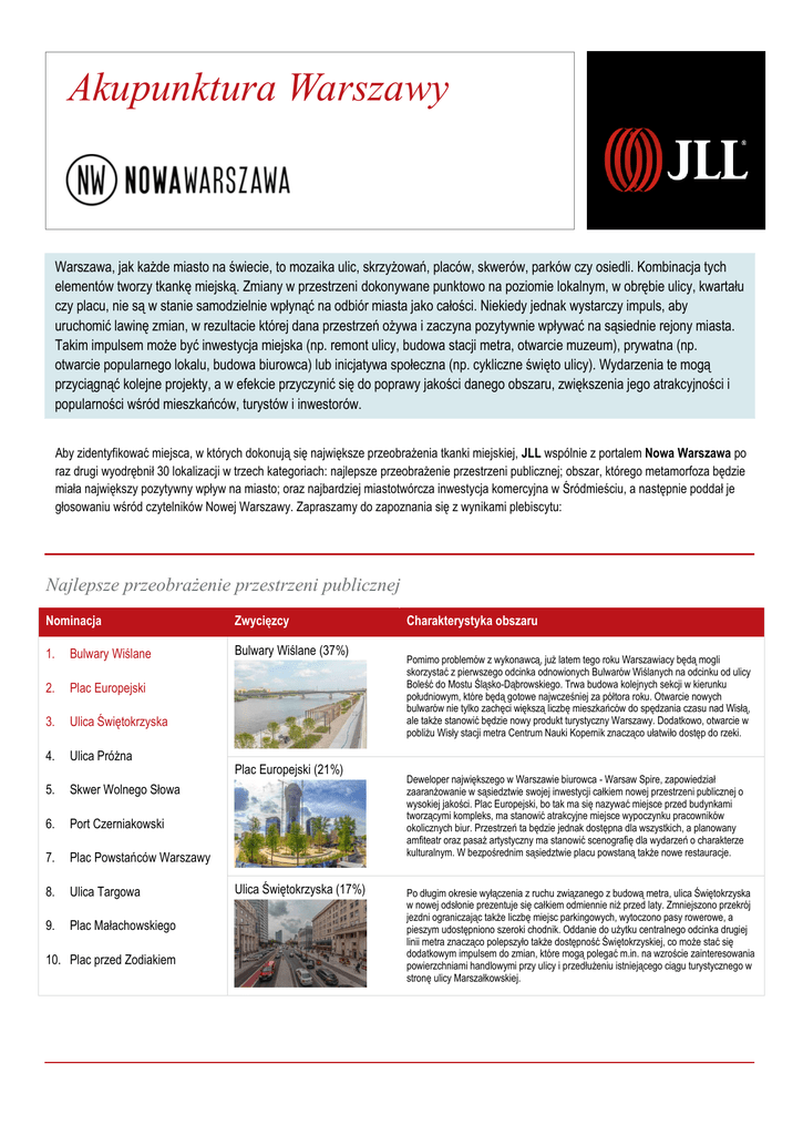 Akupunktura Warszawy Warszawa, jak każde miasto na świecie, to mozaika ulic, skrzyżowań, placów, skwerów, parków czy osiedli. Kombinacja tych elementów tworzy tkankę miejską. Zmiany w przestrzeni dokonywane punktowo na poziomie lokalnym, w obrębie ulicy, kwartału czy placu, nie są w stanie samodzielnie wpłynąć na odbiór miasta jako całości. Niekiedy jednak wystarczy impuls, aby uruchomić lawinę zmian, w rezultacie której dana przestrzeń ożywa i zaczyna pozytywnie wpływać na sąsiednie rejony miasta. Takim impulsem może być inwestycja miejska (np. remont ulicy, budowa stacji metra, otwarcie muzeum), prywatna (np. otwarcie popularnego lokalu, budowa biurowca) lub inicjatywa społeczna (np. cykliczne święto ulicy). Wydarzenia te mogą przyciągnąć kolejne projekty, a w efekcie przyczynić się do poprawy jakości danego obszaru, zwiększenia jego atrakcyjności i popularności wśród mieszkańców, turystów i inwestorów. Aby zidentyfikować miejsca, w których dokonują się największe przeobrażenia tkanki miejskiej, JLL wspólnie z portalem Nowa Warszawa po raz drugi wyodrębnił 30 lokalizacji w trzech kategoriach: najlepsze przeobrażenie przestrzeni publicznej; obszar, którego metamorfoza będzie miała największy pozytywny wpływ na miasto; oraz najbardziej miastotwórcza inwestycja komercyjna w Śródmieściu, a następnie poddał je głosowaniu wśród czytelników Nowej Warszawy. Zapraszamy do zapoznania się z wynikami plebiscytu: Najlepsze przeobrażenie przestrzeni publicznej Nominacja Zwycięzcy 1. Bulwary Wiślane Bulwary Wiślane (37%) 2. Plac Europejski 3. Ulica Świętokrzyska 4. Ulica Próżna 5. Skwer Wolnego Słowa 6. Port Czerniakowski 7. Plac Powstańców Warszawy 8. Ulica Targowa 9. Plac Małachowskiego 10. Plac przed Zodiakiem Plac Europejski (21%) Ulica Świętokrzyska (17%) Charakterystyka obszaru Pomimo problemów z wykonawcą, już latem tego roku Warszawiacy będą mogli skorzystać z pierwszego odcinka odnowionych Bulwarów Wiślanych na odcinku od ulicy Boleść do Mostu Śląsko-Dąbrowskiego. Trwa budowa kolejnych sekcji w kierunku południowym, które będą gotowe najwcześniej za półtora roku. Otwarcie nowych bulwarów nie tylko zachęci większą liczbę mieszkańców do spędzania czasu nad Wisłą, ale także stanowić będzie nowy produkt turystyczny Warszawy. Dodatkowo, otwarcie w pobliżu Wisły stacji metra Centrum Nauki Kopernik znacząco ułatwiło dostęp do rzeki. Deweloper największego w Warszawie biurowca - Warsaw Spire, zapowiedział zaaranżowanie w sąsiedztwie swojej inwestycji całkiem nowej przestrzeni publicznej o wysokiej jakości. Plac Europejski, bo tak ma się nazywać miejsce przed budynkami tworzącymi kompleks, ma stanowić atrakcyjne miejsce wypoczynku pracowników okolicznych biur. Przestrzeń ta będzie jednak dostępna dla wszystkich, a planowany amfiteatr oraz pasaż artystyczny ma stanowić scenografię dla wydarzeń o charakterze kulturalnym. W bezpośrednim sąsiedztwie placu powstaną także nowe restauracje. Po długim okresie wyłączenia z ruchu związanego z budową metra, ulica Świętokrzyska w nowej odsłonie prezentuje się całkiem odmiennie niż przed laty. Zmniejszono przekrój jezdni ograniczając także liczbę miejsc parkingowych, wytoczono pasy rowerowe, a pieszym udostępniono szeroki chodnik. Oddanie do użytku centralnego odcinka drugiej linii metra znacząco polepszyło także dostępność Świętokrzyskiej, co może stać się dodatkowym impulsem do zmian, które mogą polegać m.in. na wzroście zainteresowania powierzchniami handlowymi przy ulicy i przedłużeniu istniejącego ciągu turystycznego w stronę ulicy Marszałkowskiej. Obszar, którego metamorfoza będzie miała największy pozytywny wpływ na miasto Nominacja 1. Port Praski 2. Kampus Politechniki Warszawskiej 3. Żoliborz Przemysłowy 4. Miasteczko Wilanów 5. Łuk Siekierkowski 6. Odolany 7. Zielona Białołęka 8. Chrzanów 9. Rejon pod Skocznią Zwycięzcy Charakterystyka obszaru Port Praski (56%) Od lat opuszczony i zaniedbany rejon Portu Praskiego za kilka lat zmieni się nie do poznania. Na terenie basenów portowych i w ich okolicy pojawi się gęsta zabudowa mieszkaniowo-usługowa oraz kilka wysokościowców. Zabudowane mają być także same nabrzeża, przy których będzie też możliwość cumowania. Według koncepcji zagospodarowania, obszar ten ma stanowić przedłużenie istniejącego układu urbanistycznego Pragi. Biorąc pod uwagę inne podobne realizacje w Europie, można liczyć na to, że nowa dzielnica zacznie pozytywnie oddziaływać na sąsiednie rejony, przyczyniając się być może do poprawy jakości przestrzeni na Starej Pradze. Kampus Politechniki Warszawskiej (12%) Znajdujący się w Śródmieściu Południowym kampus Politechniki Warszawskiej ma przejść metamorfozę. Na terenie o powierzchni czterech hektarów uczelnia planuje budowę nowych gmachów oraz uporządkowanie przestrzeni. Konkurs na koncepcję architektoniczną rozstrzygnięto w październiku 2014, nie przyznając jednak pierwszej nagrody. Tak duża inwestycja w samym Śródmieściu Warszawy z pewnością odmieni charakter tej dzielnicy, a biorąc pod uwagę fakt, że inwestorem jest najlepsza uczelnia techniczna w kraju kształcąca m.in. architektów, można spodziewać się wysokiej jakości architektury i urbanistyki. Żoliborz Przemysłowy (10%) Zabudowa rejonu południowo-zachodniego Żoliborza to jedna z największych przemian dokonujących się w ostatnich latach w centralnych dzielnicach miasta. Powstają tu osiedla o rozmaitej skali i rynkowym pozycjonowaniu. Nowych mieszkańców przyciąga bliskość centrum oraz zielonego Żoliborza. Z pewnością ten dawny przemysłowy obszar został w dużym stopniu odzyskany dla miasta. 10. Zawady Najbardziej miastotwórcza inwestycja komercyjna w Śródmieściu Nominacja Zwycięzcy 1. Q22 Q22 (22%) 2. The Tides 3. Centrum Marszałkowska 4. Plac Zamkowy