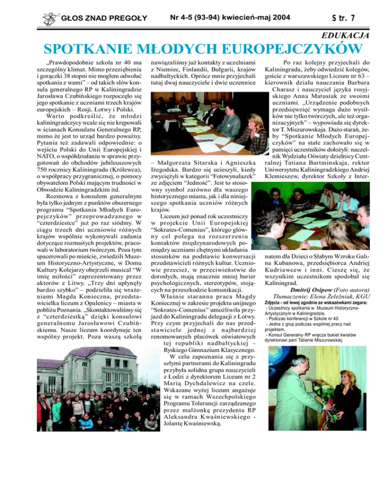 GŁOS ZNAD PREGOŁY Nr 4-5 (93-94) kwiecień-maj 2004 Str. 7 EDUKACJA SPOTKANIE MŁODYCH EUROPEJCZYKÓW „Prawdopodobnie szkoła nr 40 ma szczególny klimat. Mimo przeziębienia i gorączki 38 stopni nie mogłem odwołać spotkania z wami” – od takich słów konsula generalnego RP w Kaliningradzie Jarosława Czubińskiego rozpoczęło się jego spotkanie z uczniami trzech krajów europejskich – Rosji, Łotwy i Polski. Warto podkreślić, że młodzi kaliningradczycy wcale się nie krępowali w ścianach Konsulatu Generalnego RP, mimo że jest to urząd bardzo poważny. Pytania też zadawali odpowiednie: o wejściu Polski do Unii Europejskiej i NATO, o współdziałaniu w sprawie przygotowań do obchodów jubileuszowych 750 rocznicy Kaliningradu (Królewca), o współpracy przygranicznej, o pomocy obywatelom Polski mającym trudności w Obwodzie Kaliningradzkim itd. Rozmowa z konsulem generalnym była tylko jednym z punktów obszernego programu “Spotkania Młodych Europejczyków” przeprowadzanego w “czterdziestce” już po raz siódmy. W ciągu trzech dni uczniowie różnych krajów wspólnie wykonywali zadania dotyczące rozmaitych projektów, pracowali w laboratorium twórczym. Poza tym spacerowali po mieście, zwiedzili Muzeum Historyczno-Artystyczne, w Domu Kultury Kolejarzy obejrzeli musical “W imię miłości” zaprezentowany przez aktorów z Litwy. „Trzy dni upłynęły bardzo szybko” – podzieliła się wrażeniami Magda Konieczna, przedstawicielka liceum z Opalenicy – miasta w pobliżu Poznania. „Skontaktowaliśmy się z “czterdziestką” dzięki konsulowi generalnemu Jarosławowi Czubińskiemu. Nasze liceum koordynuje ten wspólny projekt. Poza waszą szkołą nawiązaliśmy już kontakty z uczelniami z Niemiec, Finlandii, Bułgarii, krajów nadbałtyckich. Oprócz mnie przyjechali tutaj dwaj nauczyciele i dwie uczennice – Małgorzata Sitarska i Agnieszka Iżegodska. Bardzo się ucieszyli, kiedy zwyciężyli w kategorii “Fotowynalazek” ze zdjęciem “Jedność”. Jest to stosowny symbol zarówno dla waszego historycznego miasta, jak i dla niniejszego spotkania uczniów różnych krajów. Liceum już ponad rok uczestniczy w projekcie Unii Europejskiej “Sokrates-Comenius”, którego główny cel polega na rozszerzeniu kontaktów międzynarodowych pomiędzy uczniami chętnymi układania stosunków na podstawie konwersacji przedstawicieli różnych kultur. Uczniowie przecież, w przeciwieństwie do dorosłych, mają znacznie mniej barier psychologicznych, stereotypów, stojących na przeszkodzie komunikacji. Właśnie staranna praca Magdy Koniecznej w zakresie projektu unijnego “Sokrates-Comenius” umożliwiła przyjazd do Kaliningradu delegacji z Łotwy. Przy czym przyjechali do nas przedstawiciele jednej z najbardziej renomowanych placówek oświatowych tej republiki nadbałtyckiej – Ryskiego Gimnazium Klasycznego. W celu zapoznania się z przyszłymi partnerami do Kaliningradu przybyła solidna grupa nauczycieli z Łodzi z dyrektorem Liceum nr 2 Marią Dychdalewicz na czele. Wskazane wyżej liceum angażuje się w ramach Wszechpolskiego Programu Tolerancji zarządzanego przez małżonkę prezydenta RP Aleksandra Kwaśniewskiego Jolantę Kwaśniewską. Po raz kolejny przyjechali do Kaliningradu, żeby odwiedzić kolegów, goście z warszawskiego Liceum nr 63 – kierownik działu nauczania Barbara Charasz i nauczyciel języka rosyjskiego Anna Matusiak ze swoimi uczniami. „Urządzenie podobnych przedsięwzięć wymaga dużo wysiłków nie tylko twórczych, ale też organizacyjnych” – wypowiada się dyrektor T. Miszurowskaja. Dużo starań, żeby “Spotkanie Młodych Europejczyków” na stałe zachowało się w pamięci uczestników dołożyli: naczelnik Wydziału Oświaty dzielnicy Centralnej Tatiana Bartminskaja, rektor Uniwersytetu Kaliningradzkiego Andriej Klemieszew, dyrektor Szkoły z Inter- natem dla Dzieci o Słabym Wzroku Galina Kubanowa, przedsiębiorca Andriej Kudriawcew i inni. Cieszę się, że wszystkim uczestnikom spodobał się Kaliningrad. Dmitrij Osipow (Foto autora) Tłumaczenie: Elena Żeleźniak, KGU Zdjęcia - od lewej zgodnie ze wskazówkami zegara: - Uczestnicy spotkania w Muzeum HistorycznoArtystycznym w Kaliningradzie. - Podczas konferencji w Szkole nr 40. - Jedna z grup podczas wspólnej pracy nad projektem. - Konsul Generalny RP wręcza bukiet kwiatów dyrektorowi pani Tatianie Miszurowskiej.