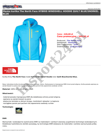 Informacje o produkcie Utworzono 04-03-2017 Męska kurtka The North Face HYBRID WINDSHELL HOODIE QUILT BLUE/SNORKEL BLUE Cena : 449,00 zł l Cena promocyjna : 349,00 zł sp or t2 4. p Producent : The North Face Dostępność : Dostępny Stan magazynowy : niski Średnia ocena : brak recenzji Kurtka firmy The North Face model Hybrid Windshell Hoodie kolor Quilt Blue/Snorkel Blue. in Nowa, hybrydowa kurtka do pieszych wędrówek z lekkiego, nylonu. Zastosowana tu impregnacja DWR chroni przed wilgocią. Kurtka posiada zapinaną na zamek kieszeń na piersi oraz rozciągliwe panele pod pachami dla zapewnienia swobody ruchów. Materiał: 100% nylon 50-60 g/m / DWR Właściwości: materiał posiada impregnację DWR dla dodatkowej ochrony przed wilgocią zapinana na zamek kieszeń na piersi elastyczna lamówka w dolnym brzegu, mankietach rękawów i w kapturze rozciągliwe panele pod pachami dla zapewnienia swobody ruchów Technologia: DWR Wytrzymałe i wodoodporne wykończenia DWR na materiałach i zamkach stanowią uzupełnienie technologii wodoodpornych. Dodatkowe hydrofobiczne obróbki pozwalają, by technologia DWR dodawana do materiałów i zamków wytrzymywała próbę czasu. Wygenerowano w programie www.oscGold.com Nylon to handlowa nazwa poliamidów produkowanych przez firmę DuPont. Są to syntetyczne polimery zawierające grupę amidową służące m.in. do wytwarzania włókien syntetycznych o bardzo dużej wytrzymałości na rozciąganie i łatwo dającego się barwić. Stosowany przede wszystkim do produkcji dzianin, tkanin, lin i żyłek. Jest materiałem niezwykle lekkim, stosowanym w produktach, w których priorytetem jest waga. Kolekcja: 2015 l Dostępne opcje Męska kurtka The North Face HYBRID WINDSHELL HOODIE QUILT BLUE/SNORKEL BLUE in sp or t2 4. p rozmiar: L.