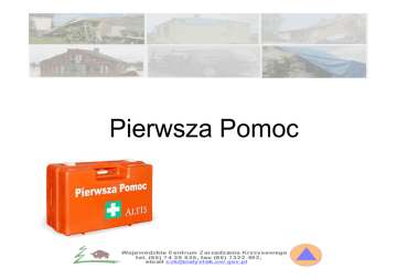 Pierwsza Pomoc Obowiązek udzielania pierwszej pomocy • Kto człowiekowi znajdującemu się w położeniu grożącym niebezpieczeństwem utraty życia lub zdrowia nie udziela pomocy, mogąc jej udzielić bez narażenia siebie na niebezpieczeństwo utraty życia albo ciężkiego uszczerbku na zdrowiu-podlega karze pozbawienia wolności do lat trzech Obowiązek udzielania pierwszej pomocy • Nie popełnia przestępstwa ten, kto nie udziela pomocy, do której jest konieczne poddanie się zabiegowi lekarskiemu, albo w warunkach, w któ-rych możliwa jest niezwłoczna pomoc ze strony instytucji lub osoby bardziej do tego powołanej. Czynności początkowe ratownika • Zabezpieczenie miejsca wypadku • Segregacja rannych • Ocena stanu poszkodowanych • Ewentualna ewakuacja z zagrożonego terenu Wzywanie pomocy • Pamiętaj, aby jak najszybciej wezwać pomoc. Jeżeli jest co najmniej dwóch ratujących, jeden • z nich udaje się po pomoc zaraz po stwierdzeniu, że poszkodowany nie oddycha. Gdy na miejscu • wypadku jest tylko jeden ratujący, a poszkodowany jest osobą dorosłą, która nie oddycha • prawdopodobnie w wyniku choroby serca, należy natychmiast wezwać pomoc. W przypadku • prawdopodobieństwa utraty przytomności w wyniku braku oddechu, np. spowodowanego urazem, • tonięciem, zadławieniem, zatruciem, oraz gdy poszkodowanym jest niemowlę lub dziecko, ratujący • powinien przez blisko 1 minutę wykonywać zabiegi przywracające podstawowe czynności życiowe • (oddech, praca serca). • Meldunek o wypadku powinien zawierać następujące dane (dotyczy wszystkich numerów • ratunkowych): • CO? – rodzaj wypadku (np. zderzenie samochodów, upadek z drabiny, utonięcie, itp.), • GDZIE? – miejsce wypadku, • ILE? – liczba poszkodowanych, • JAK? – stan poszkodowanych, • CO ROBISZ? – informacje o udzielonej dotychczas pomocy, • KIM JESTEŚ? – dane personalne osoby wzywającej pomoc (numer telefonu, z którego dzwonisz). • Gdy istnieje dodatkowe niebezpieczeństwo (np. cysterna) – poinformuj o tym. • Nigdy pierwszy nie odkładaj słuchawki!!! Złamania Złamaniem nazywamy całkowite przerwanie ciągłości tkanki kostnej w wyniku urazu mechanicznego Złamania Otwarte Zamknięte Żeber Kregosłupa Obojczyka Miednicy Kończyn górnych Kończyn dolnych Unieruchomienie złamań • Usztywnić kończynę deseczką, nartami, kijem itp. • Materiał usztywniający obłożyć miękką tkaniną • Całość obwinąć bandażem • Zawsze unieruchamiamy złamaną kończynę i dwa sąsiednie stawy Wstrząs i jego rodzaje Wstrząs to zespół zaburzeń ogóloustrojowych powstały z niedotlenienia tkanek ważnych dla życia narządów wskutek niedostatecznego przepływu krwi • Wstrząs pooparzeniowy • Wstrząs pourazowy • Wstrząs kardiogenny • Wstrząs aseptyczny • Wstrząs uczuleniowy Objawy wstrząsu • Silne osłabienie • Niepokój • Bladość • Chłód i wilgotność skóry • Dreszcze • Osłabienie tętna • Zaburzenia świadomości Zwalczanie wstrząsu • Ułożenie poszkodowanego na wznak • Uniesienie nóg nad poziom głowy • Okrywanie kocem płaszczem itp.. • Kontrola czynności życiowych • Wezwanie karetki pogotowia Opatrywanie ran -zasady ogólne • Zadbać o bezpieczeństwo ratowanego oraz własne (nałożyć gumowe rękawiczki) • Ochrona rannego przed wtórnymi zranieniami i zakażeniami • Rany nie dotykać ani przemywać • Jeśli zranienie jest skąpe ranę zdezynfekować • Nie usuwać ciał obcych tkwiących w ranie Opatrywanie ran -pokaz czynności Miejsce zranienia Uniesienie kończyny Opatrywanie ran -pokaz czynności Nałożenie opatrunku Bandażowanie Wypadki z klejem Utrata przytomności • Utrata przytomności jest zewnętrznym objawem zaburzenia centralnego układu nerwowego • Następuje zniesienie niektórych odruchów obronnych np. kaszel, odruch połykowy • U nieprzytomnego może dojść do zatrzymania oddechu na wskutek zatkania dróg oddechowych nasadą języka lub ciałem obcym • Dlatego nieprzytomny musi być ułożony w pozycji bocznej ustalonej-bezpiecznej. Pozycja boczna ustalona Układanie poszkodowanego w pozycji bocznej ustalonej 1 3 2 4 Reanimacja krążeniowo- oddechowa • Podczas reanimacji dorosłego chory leży na plecach, na twardym podłożu ( w przypadku kobiet w zaawansowanej ciąży podkładamy klin pod prawy bok – aby nie utrudniać dopływu krwi do płodu). Zaczynamy od odgięcia głowy do tyłu i dwukrotnego wdmuchnięcia powietrza do płuc. • Na wybranym miejscu ucisku kładzie się dłoń, przy czym palce powinny być odgięte ku górze, by nie dotykać klatki piersiowej. Druga dłoń kładziemy na grzbiet dolnej ręki. Ramiona muszą znajdować się w pozycji prostopadłej do klatki piersiowej. Przy wyprostowanych łokciach, na zasadzie dźwigni, naciskamy na mostek, wciskając go na odpowiednią głębokość w kierunku kręgosłupa z częstotliwością około 100 razy na minutę. W przypadku dziecka masaż serca wykonujemy jedną ręką, a u niemowlaka – dwoma palcami. Reanimacja krążeniowo- oddechowa Krwotok z nosa • Każ pacjentowi usiąść z głową pochyloną do przodu i siedzieć spokojnie przez dłuższy czas. • Połóż mu na nasadzie nosa i karku zimny, mokry ręcznik lub lód. Jeśli krwawienie nie ustaje, włóż • w obie dziurki od nosa tampony z gazy. Oparzenie • Drobniejsze oparzenia jak najszybciej ozięb zimną wodą lub przyłóż kostki lodu i trzymaj, • dopóki ból nie ustąpi. Nie stosuj żadnych maści ani tłuszczów. Pęcherze na skórze przykryj sterylnym opatrunkiem. Nie przebijaj ich ani nie wyciskaj. Płonące ubranie Połknięcie chemikaliów Substancja chemiczna w oku Zasłabnięcie Zatrucia • Jeśli kogoś bardzo boli brzuch, ma biegunkę, wymioty lub zawroty głowy albo gorączkę, wezwij natychmiast lekarza. Poinformuj, czym najprawdopodobniej ofiara się zatruła – nim przyjedzie, powie Ci, c