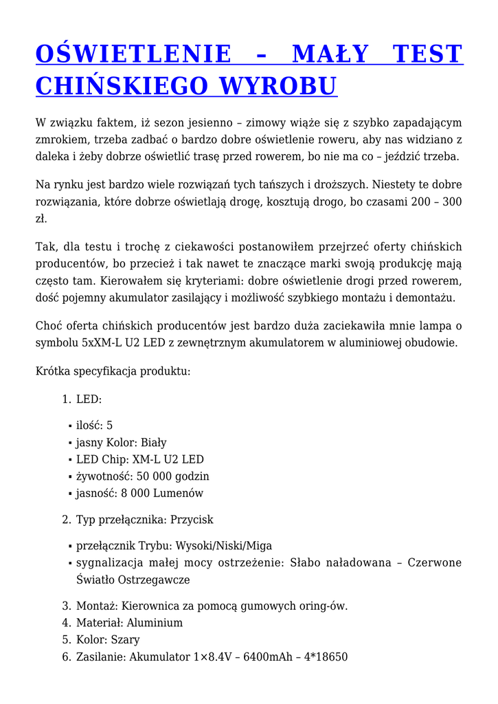 OŚWIETLENIE – MAŁY CHIŃSKIEGO WYROBU TEST W związku faktem, iż sezon jesienno – zimowy wiąże się z szybko zapadającym zmrokiem, trzeba zadbać o bardzo dobre oświetlenie roweru, aby nas widziano z daleka i żeby dobrze oświetlić trasę przed rowerem, bo nie ma co – jeździć trzeba. Na rynku jest bardzo wiele rozwiązań tych tańszych i droższych. Niestety te dobre rozwiązania, które dobrze oświetlają drogę, kosztują drogo, bo czasami 200 – 300 zł. Tak, dla testu i trochę z ciekawości postanowiłem przejrzeć oferty chińskich producentów, bo przecież i tak nawet te znaczące marki swoją produkcję mają często tam. Kierowałem się kryteriami: dobre oświetlenie drogi przed rowerem, dość pojemny akumulator zasilający i możliwość szybkiego montażu i demontażu. Choć oferta chińskich producentów jest bardzo duża zaciekawiła mnie lampa o symbolu 5xXM-L U2 LED z zewnętrznym akumulatorem w aluminiowej obudowie. Krótka specyfikacja produktu: 1. LED: ilość: 5 jasny Kolor: Biały LED Chip: XM-L U2 LED żywotność: 50 000 godzin jasność: 8 000 Lumenów 2. Typ przełącznika: Przycisk przełącznik Trybu: Wysoki/Niski/Miga sygnalizacja małej mocy ostrzeżenie: Słabo naładowana – Czerwone Światło Ostrzegawcze 3. 4. 5. 6. Montaż: Kierownica za pomocą gumowych oring-ów. Materiał: Aluminium Kolor: Szary Zasilanie: Akumulator 1×8.4V – 6400mAh – 4*18650 7. Wymiary samej lampy: 50mmx50mmx55mm 8. Marka: no name Oczywiście specyfikacja producenta to jedno, praktyka to drugie. Zestaw zawiera: 1. 1 x Lampa 5xXM-L U2 LED 2. 2 x Pierścienie gumowe do instalacji 3. 1 x Pałąk w celu przekształcenia lampy w czołówkę 4. 1xAkumulator – 6400 mAh (4*18650) 5. 1x Etui na akumulator 6. 1x Ładowarka Koszt takiego zestawu z przesyłką do Polski to 17,25 $. Przyjmując , że dolara liczymy po 4 zł to wychodzi 69 zł. Identyczne lampy znalazłem na naszym rodzimym portalu aukcyjnym za kwotę 190 -250 zł. Różnica była dość duża więc postanowiłem zakupić taka lampę w „Państwie Środka”. Niestety coś za coś. Czas oczekiwania na lampę według informacji sprzedającego to 25 – 45 dni. Więc cierpliwie czekałem na przesyłkę. Przyszła, o dziwo w przeciągu dwóch tygodni. Opakowanie przesyłki w kopercie bez pudełka, bardzo dobrze owinięte wszystkie elementy w folię bąbelkową. Wszystkie elementy w całości. Lampka sprawna i powiem nawet bardzo jasno świeci. Lecz, żeby nie było tak różowo to był jeden ZONK. Mimo, że podczas finalizowania zamówienia jasno określiłem, że ładowarka ma być w wersji europejskiej to niestety dostałem w wersji amerykańskiej. Problem do rozwiązania, bo w każdym większym sklepie elektrycznym można kupić przejściówkę ale to podnosi koszt lampy o całe 4,50 zł (bo za tyle kupiłem przejściówkę). Montaż lampy bardzo łatwy, ponieważ rozwiązanie stosowane takie samo jak w wielu akcesoriach rowerowych umieszczanych na kierownicy. Montaż akumulatora także, gdyż etui mocowane jest na ramie za pomocą dość mocnego rzepa. W etui jest także szlufka do paska, wykorzystywana pewnie, gdy przekształcimy lampę w czołówkę. Przewód długi w zupełności wystarczy aby umieścić akumulator w dowolnym miejscu ramy roweru. Ja zamocowałem na w górnej jej części. Obudowa faktycznie aluminiowa wygląda na solidną. W tylnej jej części znajduje się przycisk który służy do włączania oraz przełączania miedzy trybami pracy: 1światło bardzo mocne,2-światło o mniejszej mocy, 3-światło pulsacyjne. Przycisk podświetlany jest odpowiednim kolorem w zależności od stopnia naładowania akumulatora: zielony – akumulator naładowany, czerwony – akumulator o niskim stopniu naładowania. Obudowa według zapewnień producenta jest wodoodporna. Czas na testy praktyczne. Temperatura w jakim odbył się test to około 5 stopni Celsjusza. Wiadomo, ze czym niższa temperatura tym wydajność akumulatora mniejsza. Chciałem sprawdzić jak lampa sprawuje się na trasie (asfalt i ścieżka w lesie). Lampka bardzo dobrze oświetla drogę przed rowerem na najmocniejszej mocy światła. Kąt oświetlenia i zasięg jest wystarczający nawet przy szybkiej jeździe na asfalcie. Na leśnych ścieżkach widoczność tez dość dobra. Podczas jazdy ze światłem ustawionym na małą moc też nie jest źle, spokojnie można jeździć i widać wszystkie dziury na drodze. Uważam, że opcja pulsacyjna jest trochę niedopracowana, gdyż korzysta z największej mocy lampy, co przy tym ustawieniu chyba jest nie potrzebne mogło być o mniejszej mocy. Także minusem jest, że sygnalizacja rozładowania jest także niedopracowana, ponieważ pokazanie stanu rozładowania (kolor czerwony przełącznika) jest dość późno sygnalizowany – około dwóch minut przed kompletnym rozładowaniem. Przy dużej mocy lampka się trochę nagrzewa. No i teraz najważniejsze. 1. Czas użytkowania tylko na najmocniejszej mocy w praktyce i temperaturze otoczenia około 5oC to około 1 godzina 10 minut. 2. Czas użytkowania na słabszej mocy w praktyce i temperaturze otoczenia 5oC około 2 godzin 30 minut. 3. Czas użytkowania lampy z ustawieniem pulsacyjnym 1 godzina 50 minut 4. Czas ładowania akumulator do pełnej wydajności: około 5 godzin. Niestety nie mogę nic powiedzieć o żywotności akumulatora, bo to się okaże dopiero po dłuższym użytkowaniu. Można zakupić także akumulator o większej pojemności – 10000 mAh – 6*18650, większy koszt 2-3 $. Przez ostatni tydzień lampa przejeździła ze mną na moim rowerku MTB praktycznie codziennie. Przy aurze jaka jest teraz, nawet dobrze się sprawdziła i dzięki niej można spokojnie jeździć nawet późnym wieczorem. Doskonale sprawdza się jako doświetlenie drogi. Czy warto wydać 75 zł na taki chiński sprzęt? Nie wiem, zobaczę czy przetrzyma sezon. Ale jest to jakaś alternatywa na dobre oświetlenie trasy za dość nieduże pienią