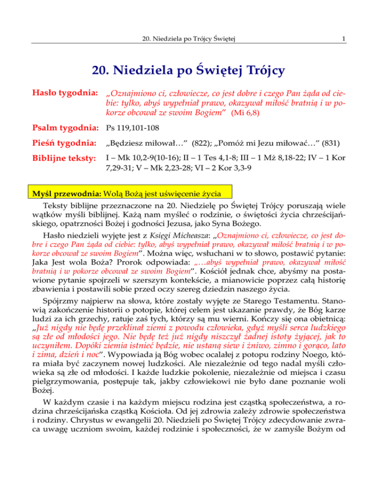 20. Niedziela po Trójcy Świętej 1 20. Niedziela po Świętej Trójcy Hasło tygodnia: „Oznajmiono ci, człowiecze, co jest dobre i czego Pan żąda od ciebie: tylko, abyś wypełniał prawo, okazywał miłość bratnią i w pokorze obcował ze swoim Bogiem” (Mi 6,8) Psalm tygodnia: Ps 119,101-108 Pieśń tygodnia: „Będziesz miłował…” (822); „Pomóż mi Jezu miłować…” (831) Biblijne teksty: I – Mk 10,2-9(10-16); II – 1 Tes 4,1-8; III – 1 Mż 8,18-22; IV – 1 Kor 7,29-31; V – Mk 2,23-28; VI – 2 Kor 3,3-9 Myśl przewodnia: Wolą Bożą jest uświęcenie życia Teksty biblijne przeznaczone na 20. Niedzielę po Świętej Trójcy poruszają wiele wątków myśli biblijnej. Każą nam myśleć o rodzinie, o świętości życia chrześcijańskiego, opatrzności Bożej i godności Jezusa, jako Syna Bożego. Hasło niedzieli wyjęte jest z Księgi Micheasza: „Oznajmiono ci, człowiecze, co jest dobre i czego Pan żąda od ciebie: tylko, abyś wypełniał prawo, okazywał miłość bratnią i w pokorze obcował ze swoim Bogiem”. Można więc, wsłuchani w to słowo, postawić pytanie: Jaka Jest wola Boża? Prorok odpowiada: „…abyś wypełniał prawo, okazywał miłość bratnią i w pokorze obcował ze swoim Bogiem”. Kościół jednak chce, abyśmy na postawione pytanie spojrzeli w szerszym kontekście, a mianowicie poprzez całą historię zbawienia i postawili sobie przed oczy szereg dziedzin naszego życia. Spójrzmy najpierw na słowa, które zostały wyjęte ze Starego Testamentu. Stanowią zakończenie historii o potopie, której celem jest ukazanie prawdy, że Bóg karze ludzi za ich grzechy, ratuje zaś tych, którzy są mu wierni. Kończy się ona obietnicą: „Już nigdy nie będę przeklinał ziemi z powodu człowieka, gdyż myśli serca ludzkiego są złe od młodości jego. Nie będę też już nigdy niszczył żadnej istoty żyjącej, jak to uczyniłem. Dopóki ziemia istnieć będzie, nie ustaną siew i żniwo, zimno i gorąco, lato i zima, dzień i noc”. Wypowiada ją Bóg wobec ocalałej z potopu rodziny Noego, która miała być zaczynem nowej ludzkości. Ale niezależnie od tego nadal myśli człowieka są złe od młodości. I każde ludzkie pokolenie, niezależnie od miejsca i czasu pielgrzymowania, postępuje tak, jakby człowiekowi nie było dane poznanie woli Bożej. W każdym czasie i na każdym miejscu rodzina jest cząstką społeczeństwa, a rodzina chrześcijańska cząstką Kościoła. Od jej zdrowia zależy zdrowie społeczeństwa i rodziny. Chrystus w ewangelii 20. Niedzieli po Świętej Trójcy zdecydowanie zwraca uwagę uczniom swoim, każdej rodzinie i społeczności, że w zamyśle Bożym od 2 20. Niedziela po Trójcy Świętej samego początku małżeństwo jest monogamiczne i nierozerwalne. „Opuści człowiek ojca swego oraz matkę i połączy się z żoną swoją. I będą ci dwoje jednym ciałem. A tak już nie są dwoje, lecz jedno ciało. Co tedy Bóg złączył, człowiek niechaj nie rozłącza”. Mojżesz dopuszczał rozwód, ale Jezus jest radykalny w swoim żądaniu. Jeśli z jakichś powodów dochodzi do rozwodu, wówczas obowiązuje zasada: „Ktokolwiek by rozwiódł się z żoną swoją i poślubił inną, popełnia wobec niej cudzołóstwo. A jeśliby sama rozwiodła się z mężem swoim i poślubiła innego, dopuszcza się cudzołóstwa”. W Starym Testamencie bogactwem rodziny były dzieci. Jezus błogosławiąc dzieci, nie tylko potwierdza to przekonanie, ale otwiera przed dziećmi, niezależnie od tego, kim są ich rodzice Królestwo Boże: „Pozwólcie dziatkom przychodzić do mnie i nie zabraniajcie im, albowiem takich jest Królestwo Boże”. Czy Jezus miał prawo zmienić przyzwolenie Mojżesza na rozwód małżonków? Ewangelista Marek pośrednio na to pytanie odpowiada. Pisze on, że faryzeusze gorszyli się z tego, że uczniowie w sabat rwali kłosy i jedli ziarno, bowiem tego nie godziło się czynić w dzień spoczynku. Wtedy Jezus powiedział do nich: „Sabat jest ustanowiony dla człowieka, a nie człowiek dla sabatu. Tak więc Syn Człowieczy jest Panem również i sabatu”. A więc Chrystus jest Panem sabatu, dnia ustanowionego przez samego Boga. Przeto tym bardziej ma On prawo wypowiadać się na temat ustanowionego przez Mojżesza zwyczaju, dotyczącego rozwodu. Na straży świętości małżeństwa stoi szóste przykazanie: „Nie cudzołóż!”, oraz dziewiąte: „Nie pożądaj żony bliźniego swego…!”. Apostoł Paweł chce, aby życie chrześcijanina w rodzinie i poza nią, było nienaganne. Przypomina członkom Kościoła w Tesalonikach przykazanie, które dał im podczas swojego pobytu wśród nich, przykazanie, które nie jest jego przykazaniem, lecz Pana: „Wszak wiecie, jakie przy- kazania daliśmy wam w imieniu Pana Jezusa. Taka jest bowiem wola Boża: uświęcenie wasze, żebyście się powstrzymywali od wszeteczeństwa, aby każdy z was umiał utrzymać swe ciało w czystości i w poszanowaniu, nie z namiętności żądzy, jak poganie, którzy nie znają Boga, aby nikt nie dopuszczał się wykroczenia i nie oszukiwał w jakiejkolwiek sprawie swego brata”. Wielki Apostoł uzasadnia to żądanie: „Albowiem nie powołał nas Bóg do nieczystości, ale do uświęcenia”. A zmusza ono do refleksji: „Kto odrzuca to, odrzuca nie człowieka, lecz Boga, który nam też daje Ducha swego Świętego” Święte, nienaganne życie w domu i poza nim jest wizytówką nie tylko poszczególnych ludzi, ale także parafii i Kościoła. „Wiadomo przecież, że jesteście listem Chrystusowym sporządzonym przez nasze usługiwanie, napisanym nie atramentem, ale Duchem Boga żywego, nie na tablicach kamiennych, lecz na tablicach serc ludzkich”. Kościół jest taki jacy są jego członkowie. Świętość Kościoła to także świętość ludzi, którzy do niego należą. Uświęcenie, do którego jesteśmy powołani nie jest z nas, ani naszym wyłącznie dziełem, lec