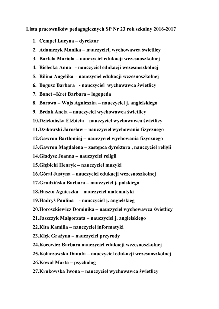 Lista pracowników pedagogicznych SP Nr 23 rok szkolny 2016