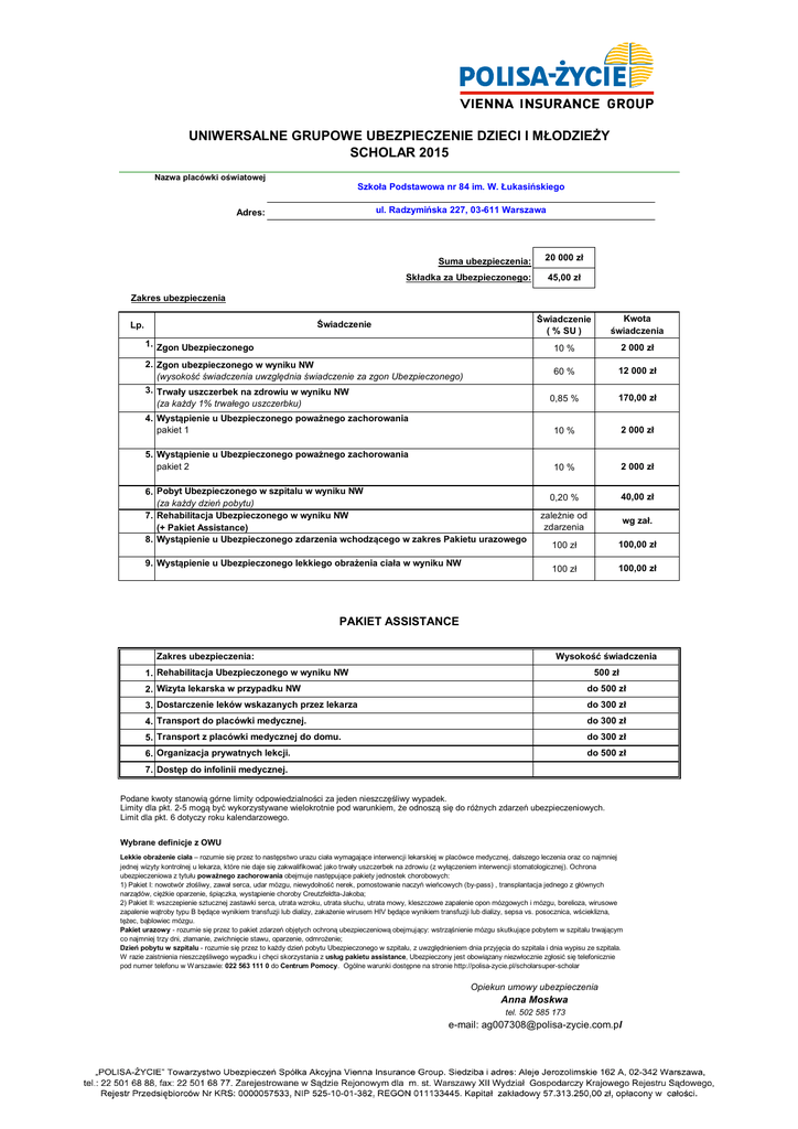 UNIWERSALNE GRUPOWE UBEZPIECZENIE DZIECI I MŁODZIEŻY SCHOLAR 2015 Nazwa placówki oświatowej Szkoła Podstawowa nr 84 im. W. Łukasińskiego ul. Radzymińska 227, 03-611 Warszawa Adres: Suma ubezpieczenia: 20 000 zł Składka za Ubezpieczonego: 45,00 zł Zakres ubezpieczenia Świadczenie ( % SU ) Kwota świadczenia 10 % 2 000 zł 60 % 12 000 zł 0,85 % 170,00 zł 4. Wystąpienie u Ubezpieczonego poważnego zachorowania pakiet 1 10 % 2 000 zł 5. Wystąpienie u Ubezpieczonego poważnego zachorowania pakiet 2 10 % 2 000 zł Świadczenie Lp. 1. Zgon Ubezpieczonego 2. Zgon ubezpieczonego w wyniku NW (wysokość świadczenia uwzględnia świadczenie za zgon Ubezpieczonego) 3. Trwały uszczerbek na zdrowiu w wyniku NW (za każdy 1% trwałego uszczerbku) 6. Pobyt Ubezpieczonego w szpitalu w wyniku NW (za każdy dzień pobytu) 7. Rehabilitacja Ubezpieczonego w wyniku NW (+ Pakiet Assistance) 8. Wystąpienie u Ubezpieczonego zdarzenia wchodzącego w zakres Pakietu urazowego 9. Wystąpienie u Ubezpieczonego lekkiego obrażenia ciała w wyniku NW 0,20 % 40,00 zł zależnie od zdarzenia wg zał. 100 zł 100,00 zł 100 zł 100,00 zł PAKIET ASSISTANCE Zakres ubezpieczenia: Wysokość świadczenia 1. Rehabilitacja Ubezpieczonego w wyniku NW 500 zł 2. Wizyta lekarska w przypadku NW do 500 zł 3. Dostarczenie leków wskazanych przez lekarza do 300 zł 4. Transport do placówki medycznej. do 300 zł 5. Transport z placówki medycznej do domu. do 300 zł 6. Organizacja prywatnych lekcji. do 500 zł 7. Dostęp do infolinii medycznej. Podane kwoty stanowią górne limity odpowiedzialności za jeden nieszczęśliwy wypadek. Limity dla pkt. 2-5 mogą być wykorzystywane wielokrotnie pod warunkiem, że odnoszą się do różnych zdarzeń ubezpieczeniowych. Limit dla pkt. 6 dotyczy roku kalendarzowego. Wybrane definicje z OWU Lekkie obrażenie ciała – rozumie się przez to następstwo urazu ciała wymagające interwencji lekarskiej w placówce medycznej, dalszego leczenia oraz co najmniej jednej wizyty kontrolnej u lekarza, które nie daje się zakwalifikować jako trwały uszczerbek na zdrowiu (z wyłączeniem interwencji stomatologicznej). Ochrona ubezpieczeniowa z tytułu poważnego zachorowania obejmuje następujące pakiety jednostek chorobowych: 1) Pakiet I: nowotwór złośliwy, zawał serca, udar mózgu, niewydolność nerek, pomostowanie naczyń wieńcowych (by-pass) , transplantacja jednego z głównych narządów, ciężkie oparzenie, śpiączka, wystąpienie choroby Creutzfeldta-Jakoba; 2) Pakiet II: wszczepienie sztucznej zastawki serca, utrata wzroku, utrata słuchu, utrata mowy, kleszczowe zapalenie opon mózgowych i mózgu, borelioza, wirusowe zapalenie wątroby typu B będące wynikiem transfuzji lub dializy, zakażenie wirusem HIV będące wynikiem transfuzji lub dializy, sepsa vs. posocznica, wścieklizna, tężec, bąblowiec mózgu. Pakiet urazowy - rozumie się przez to pakiet zdarzeń objętych ochroną ubezpieczeniową obejmujący: wstrząśnienie mózgu skutkujące pobytem w szpitalu trwającym co najmniej trzy dni, złamanie, zwichnięcie stawu, oparzenie, odmrożenie; Dzień pobytu w szpitalu - rozumie się przez to każdy dzień pobytu Ubezpieczonego w szpitalu, z uwzględnieniem dnia przyjęcia do szpitala i dnia wypisu ze szpitala. W razie zaistnienia nieszczęśliwego wypadku i chęci skorzystania z usług pakietu assistance, Ubezpieczony jest obowiązany niezwłocznie zgłosić się telefonicznie pod numer telefonu w Warszawie: 022 563 111 0 do Centrum Pomocy. Ogólne warunki dostępne na stronie http://polisa-zycie.pl/scholarsuper-scholar Opiekun umowy ubezpieczenia Anna Moskwa tel. 502 585 173 e-mail: [email protected]