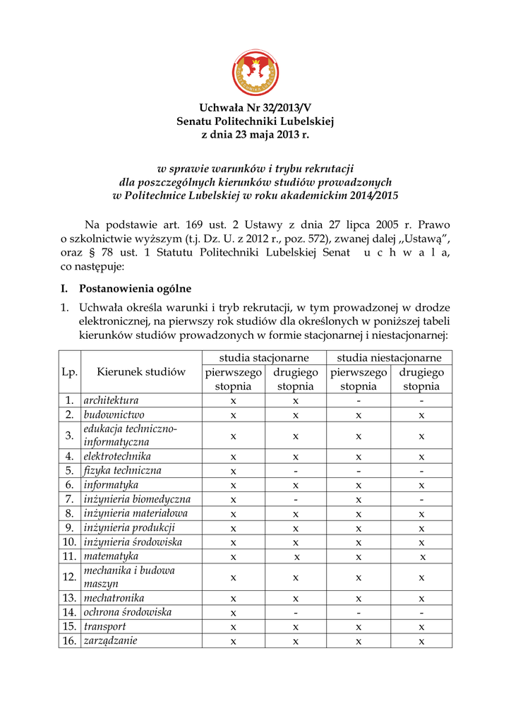 Uchwała Nr 32/2013/V Senatu Politechniki Lubelskiej z dnia 23 maja 2013 r. w sprawie warunków i trybu rekrutacji dla poszczególnych kierunków studiów prowadzonych w Politechnice Lubelskiej w roku akademickim 2014/2015 Na podstawie art. 169 ust. 2 Ustawy z dnia 27 lipca 2005 r. Prawo o szkolnictwie wyższym (t.j. Dz. U. z 2012 r., poz. 572), zwanej dalej ,,Ustawą”, oraz § 78 ust. 1 Statutu Politechniki Lubelskiej Senat u c h w a l a, co następuje: I. Postanowienia ogólne 1. Uchwała określa warunki i tryb rekrutacji, w tym prowadzonej w drodze elektronicznej, na pierwszy rok studiów dla określonych w poniższej tabeli kierunków studiów prowadzonych w formie stacjonarnej i niestacjonarnej: Lp. Kierunek studiów 1. architektura 2. budownictwo edukacja techniczno3. informatyczna 4. elektrotechnika 5. fizyka techniczna 6. informatyka 7. inżynieria biomedyczna 8. inżynieria materiałowa 9. inżynieria produkcji 10. inżynieria środowiska 11. matematyka mechanika i budowa 12. maszyn 13. mechatronika 14. ochrona środowiska 15. transport 16. zarządzanie studia stacjonarne pierwszego drugiego stopnia stopnia x x x x studia niestacjonarne pierwszego drugiego stopnia stopnia x x x x x x x x x x x x x x x x x x x x x x x x x x x x x x x x x x x x x x x x x x x x x x x x x x 17. zarządzanie i inżynieria produkcji x x x x 2. Przyjęcia na studia odbywają się w ramach planowanej liczby przyjęć, określonej dla poszczególnych kierunków studiów odrębną uchwałą Senatu Politechniki Lubelskiej. 3. Postępowanie rekrutacyjne na pierwszy rok studiów ma charakter konkursowy. 4. Wyniki postępowania rekrutacyjnego są jawne. 5. W postępowaniu rekrutacyjnym na studia pierwszego stopnia będą uwzględniane skale ocen w zależności od posiadanego przez kandydata świadectwa dojrzałości. 6. Warunki i tryb rekrutacji na studia prowadzonej w drodze elektronicznej określa Załącznik nr 1 do niniejszej Uchwały. 7. Warunki rekrutacji na pierwszy rok studiów stacjonarnych i niestacjonarnych pierwszego stopnia określa Załącznik nr 2 do niniejszej Uchwały. 8. O przyjęcie na studia pierwszego stopnia, na warunkach określonych w niniejszej Uchwale, mogą ubiegać się kandydaci, którzy posiadają alternatywnie: a) polskie świadectwo dojrzałości lub maturalne, uzyskane w wyniku złożenia egzaminu maturalnego („nowa matura”) lub odpowiednio egzaminu dojrzałości („stara matura”); b) dyplom IB wydany przez organizację International Baccalaureat Organization z siedzibą w Genewie, uzyskany w wyniku złożenia egzaminu przeprowadzonego w ramach programu Matury Międzynarodowej; c) świadectwo ukończenia szkoły lub świadectwo maturalne wydane za granicą, uznane za równorzędne polskiemu świadectwu dojrzałości. 9. Warunki rekrutacji na pierwszy rok studiów stacjonarnych i niestacjonarnych drugiego stopnia określa Załącznik nr 3 do niniejszej Uchwały. 10. O przyjęcie na studia drugiego stopnia, w zależności od kierunku studiów, mogą ubiegać się kandydaci, którzy posiadają tytuł zawodowy magistra, licencjata, inżyniera lub równorzędny i spełniają warunki określone niniejszą Uchwałą. 11. O przyjęcie na studia, na warunkach określonych w niniejszej Uchwale, mogą ubiegać się cudzoziemcy, o których mowa w art. 43 Ustawy. 2 12. Zasady przyjmowania cudzoziemców na studia określa Załącznik nr 4 do niniejszej Uchwały. 13. Warunki i tryb postępowania rekrutacyjnego w stosunku do kandydatów na studia będących osobami niepełnosprawnymi w przypadku egzaminów wstępnych określa Załącznik nr 5 do niniejszej Uchwały. 14. Zasady przyjmowania na pierwszy rok studiów pierwszego stopnia laureatów i finalistów olimpiad stopnia centralnego oraz laureatów konkursów międzynarodowych oraz ogólnopolskich, w tym organizowanych przez Politechnikę Lubelską, określa odrębna uchwała Senatu Politechniki Lubelskiej. II. Organy prowadzące postępowanie rekrutacyjne 1. Rekrutację na studia przeprowadzają wydziałowe komisje rekrutacyjne powołane przez dziekanów. 2. Przewodniczącym wydziałowej komisji rekrutacyjnej jest dziekan lub prodziekan. 3. Do zadań wydziałowej komisji rekrutacyjnej należy w szczególności: a) prowadzenie bieżącej obsługi i nadzorowanie procesu rekrutacji z wykorzystaniem elektronicznej rejestracji kandydatów, zwanej dalej ERK; b) zapoznanie kandydatów z warunkami rekrutacji oraz zawiadamianie o terminie postępowania rekrutacyjnego; c) przeprowadzanie postępowania rekrutacyjnego; d) przyjmowanie dokumentów; e) weryfikacja danych kandydatów zakwalifikowanych do przyjęcia z danymi zamieszczonymi w systemie ERK; f) podejmowanie decyzji o przyjęciu lub nieprzyjęciu kandydata na studia; g) zawiadamianie kandydatów o wynikach postępowania rekrutacyjnego; h) sporządzanie protokołów indywidualnych i zbiorczych z postępowania rekrutacyjnego; i) przygotowywanie wszelkich doraźnych informacji i danych liczbowych z przebiegu rekrutacji dla potrzeb Uczelnianej Komisji Rekrutacyjnej; j) składanie sprawozdań Uczelnianej Komisji Rekrutacyjnej z przebiegu postępowania rekrutacyjnego; k) wydawanie, na prośbę kandydatów, zaświadczeń o uzyskanych wynikach w postępowaniu rekrutacyjnym. 4. Od decyzji wydziałowych komisji rekrutacyjnych przysługuje kandydatom odwołanie do Uczelnianej Komisji Rekrutacyjnej w terminie 3 14 dni od daty doręczenia decyzji. Podstawą odwołania może być jedynie wskazanie naruszenia warunków i trybu rekrutacji na studia, określonych zgodnie z art. 169 ust. 2 Ustawy. 5. Odwołania do Uczelnianej Komisji Rekrutacyjnej kandydaci składają za pośrednictwem wydziałowych komisji rekrutacyjnych. Uczelniana Komisja Rekrutacyjna po rozpatrzeniu odwołania podejmuje ostateczną decyzję. 6. Przewodniczącym Uczelnianej Komisji Rekrutacyjnej jest Prorektor ds. Studenckich. 7. Do zadań Uczelnianej Komisji Rekrutacyjnej należy w szczególności: a) koordynacja i nadzór nad p