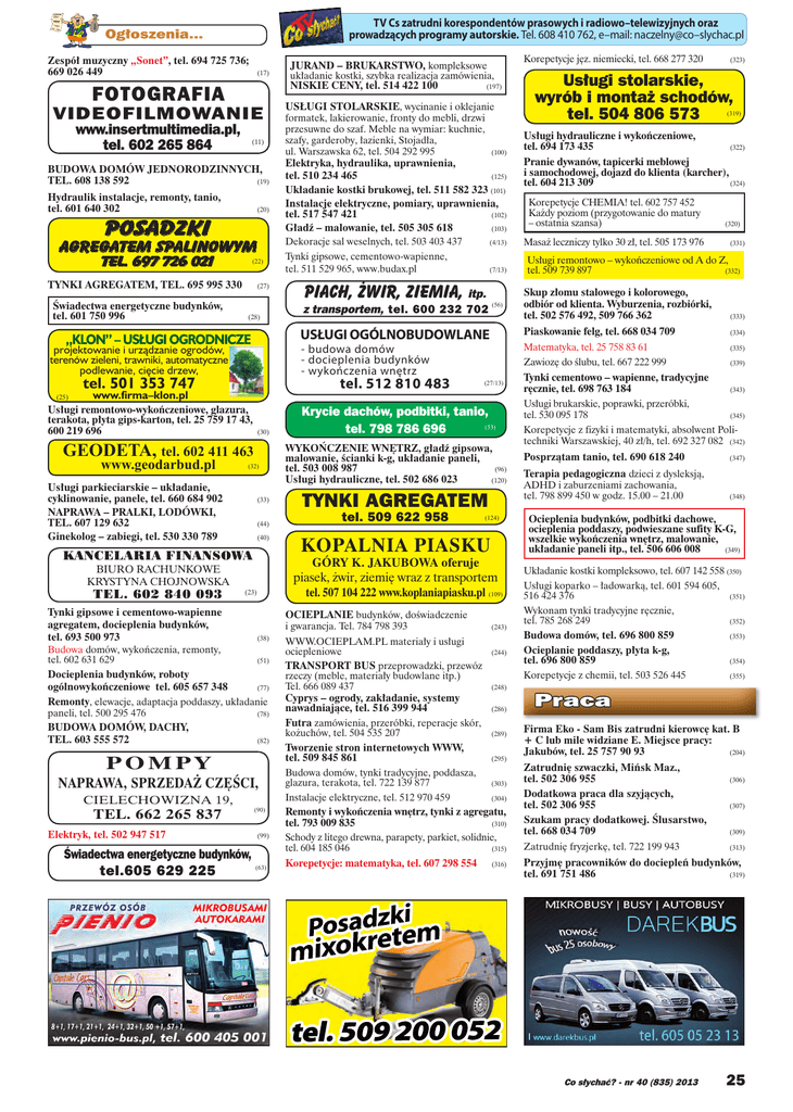 TV Cs zatrudni korespondentów prasowych i radiowo–telewizyjnych oraz prowadzących programy autorskie. Tel. 608 410 762, e–mail: naczelny@co–slychac.pl Ogłoszenia... Zespół muzyczny „Sonet”, tel. 694 725 736; 669 026 449 (17) fotografia VIDEOFILMOWANIE www.insertmultimedia.pl, tel. 602 265 864 (11) Budowa domów jednorodzinnych, (19) tel. 608 138 592 Hydraulik instalacje, remonty, tanio, tel. 601 640 302 (20) Posadzki agregatem spalinowym tel. 697 726 021 (22) TYNKI AGREGATEM, TEL. 695 995 330 Świadectwa energetyczne budynków, tel. 601 750 996 (27) (28) „KLON” – USŁUGI OGRODNICZE tel. 501 353 747 Usługi remontowo-wykończeniowe, glazura, terakota, płyta gips-karton, tel. 25 759 17 43, 600 219 696 (30) Geodeta, tel. 602 411 463 (32) Usługi parkieciarskie – układanie, cyklinowanie, panele, tel. 660 684 902 Naprawa – pralki, lodówki, tel. 607 129 632 Ginekolog – zabiegi, tel. 530 330 789 (33) (44) (40) Kancelaria finansowa biuro rachunkowe Krystyna Chojnowska tel. 602 840 093 Tynki gipsowe, cementowo-wapienne, tel. 511 529 965, www.budax.pl (7/13) Tynki gipsowe i cementowo-wapienne agregatem, docieplenia budynków, tel. 693 500 973 Budowa domów, wykończenia, remonty, tel. 602 631 629 Docieplenia budynków, roboty ogólnowykończeniowe tel. 605 657 348 Remonty, elewacje, adaptacja poddaszy, układanie (78) paneli, tel. 500 295 476 BUDOWA DOMÓW, DACHY, TEL. 603 555 572 (82) POMPY NAPRAWA, SPRZEDAŻ CZĘŚCI, CIELECHOWIZNA 19, TEL. 662 265 837 Elektryk, tel. 502 947 517 Świadectwa energetyczne budynków, tel.605 629 225 (90) (99) (63) Usługi hydrauliczne i wykończeniowe, tel. 694 173 435 (322) Pranie dywanów, tapicerki meblowej i samochodowej, dojazd do klienta (karcher), (324) tel. 604 213 309 Korepetycje CHEMIA! tel. 602 757 452 Każdy poziom (przygotowanie do matury – ostatnia szansa) Masaż leczniczy tylko 30 zł, tel. 505 173 976 (320) (331) Usługi remontowo – wykończeniowe od A do Z, (332) tel. 509 739 897 (333) Usługi ogólnobudowlane Matematyka, tel. 25 758 83 61 (335) Zawiozę do ślubu, tel. 667 222 999 (339) Tynki cementowo – wapienne, tradycyjne ręcznie, tel. 698 763 184 (343) Usługi brukarskie, poprawki, przeróbki, tel. 530 095 178 (345) (27/13) Krycie dachów, podbitki, tanio, (53) tel. 798 786 696 Wykończenie wnętrz, gładź gipsowa, malowanie, ścianki k-g, układanie paneli, tel. 503 008 987 (96) Usługi hydrauliczne, tel. 502 686 023 (120) Tynki agregatem tel. 509 622 958 (124) KOPALNIA PIASKU OCIEPLANIE budynków, doświadczenie i gwarancja. Tel. 784 798 393 (77) (319) (334) tel. 507 104 222 www.koplaniapiasku.pl (109) (51) Usługi stolarskie, wyrób i montaż schodów, tel. 504 806 573 Piaskowanie felg, tel. 668 034 709 GÓRY K. JAKUBOWA oferuje (38) (323) Skup złomu stalowego i kolorowego, odbiór od klienta. Wyburzenia, rozbiórki, tel. 502 576 492, 509 766 362 piasek, żwir, ziemię wraz z transportem (23) Korepetycje jęz. niemiecki, tel. 668 277 320 PIACH, ŻWIR, ZIEMIA, itp. (56) z transportem, tel. 600 232 702 tel. 512 810 483 www.firma–klon.pl www.geodarbud.pl Usługi stolarskie, wycinanie i oklejanie formatek, lakierowanie, fronty do mebli, drzwi przesuwne do szaf. Meble na wymiar: kuchnie, szafy, garderoby, łazienki, Stojadła, (100) ul. Warszawska 62, tel. 504 292 995 Elektryka, hydraulika, uprawnienia, tel. 510 234 465 (125) Układanie kostki brukowej, tel. 511 582 323 (101) Instalacje elektryczne, pomiary, uprawnienia, (102) tel. 517 547 421 Gładź – malowanie, tel. 505 305 618 (103) Dekoracje sal weselnych, tel. 503 403 437 (4/13) - budowa domów - docieplenia budynków - wykończenia wnętrz projektowanie i urządzanie ogrodów, terenów zieleni, trawniki, automatyczne podlewanie, cięcie drzew, (25) JuranD – Brukarstwo, kompleksowe układanie kostki, szybka realizacja zamówienia, niskie ceny, tel. 514 422 100 (197) WWW.OCIEPLAM.PL materiały i usługi ociepleniowe TRANSPORT BUS przeprowadzki, przewóz rzeczy (meble, materiały budowlane itp.) Tel. 666 089 437 Cyprys – ogrody, zakładanie, systemy nawadniające, tel. 516 399 944 (243) (244) (248) (286) Futra zamówienia, przeróbki, reperacje skór, kożuchów, tel. 504 535 207 (289) Tworzenie stron internetowych WWW, tel. 509 845 861 (295) Budowa domów, tynki tradycyjne, poddasza, glazura, terakota, tel. 722 139 877 (303) Instalacje elektryczne, tel. 512 970 459 (304) Remonty i wykończenia wnętrz, tynki z agregatu, (310) tel. 793 009 835 Schody z litego drewna, parapety, parkiet, solidnie, (315) tel. 604 185 046 Korepetycje: matematyka, tel. 607 298 554 (316) Korepetycje z fizyki i matematyki, absolwent Politechniki Warszawskiej, 40 zł/h, tel. 692 327 082 (342) Posprzątam tanio, tel. 690 618 240 (347) Terapia pedagogiczna dzieci z dysleksją, ADHD i zaburzeniami zachowania, tel. 798 899 450 w godz. 15.00 – 21.00 (348) Ocieplenia budynków, podbitki dachowe, ocieplenia poddaszy, podwieszane sufity K-G, wszelkie wykończenia wnętrz, malowanie, układanie paneli itp., tel. 506 606 008 (349) Układanie kostki kompleksowo, tel. 607 142 558 (350) Usługi koparko – ładowarką, tel. 601 594 605, 516 424 376 (351) Wykonam tynki tradycyjne ręcznie, tel. 785 268 249 (352) Budowa domów, tel. 696 800 859 (353) Ocieplanie poddaszy, płyta k-g, tel. 696 800 859 (354) Korepetycje z chemii, tel. 503 526 445 (355) Praca Firma Eko - Sam Bis zatrudni kierowcę kat. B + C lub mile widziane E. Miejsce pracy: (204) Jakubów, tel. 25 757 90 93 Zatrudnię szwaczki, Mińsk Maz., tel. 502 306 955 (306) Dodatkowa praca dla szyjących, tel. 502 306 955 (307) Szukam pracy dodatkowej. Ślusarstwo, tel. 668 034 709 (309) Zatrudnię fryzjerkę, tel. 722 199 943 (313) Przyjmę pracowników do dociepleń budynków, (319) tel. 691 751 486 Co słychać? - nr 40 (835) 2013 25