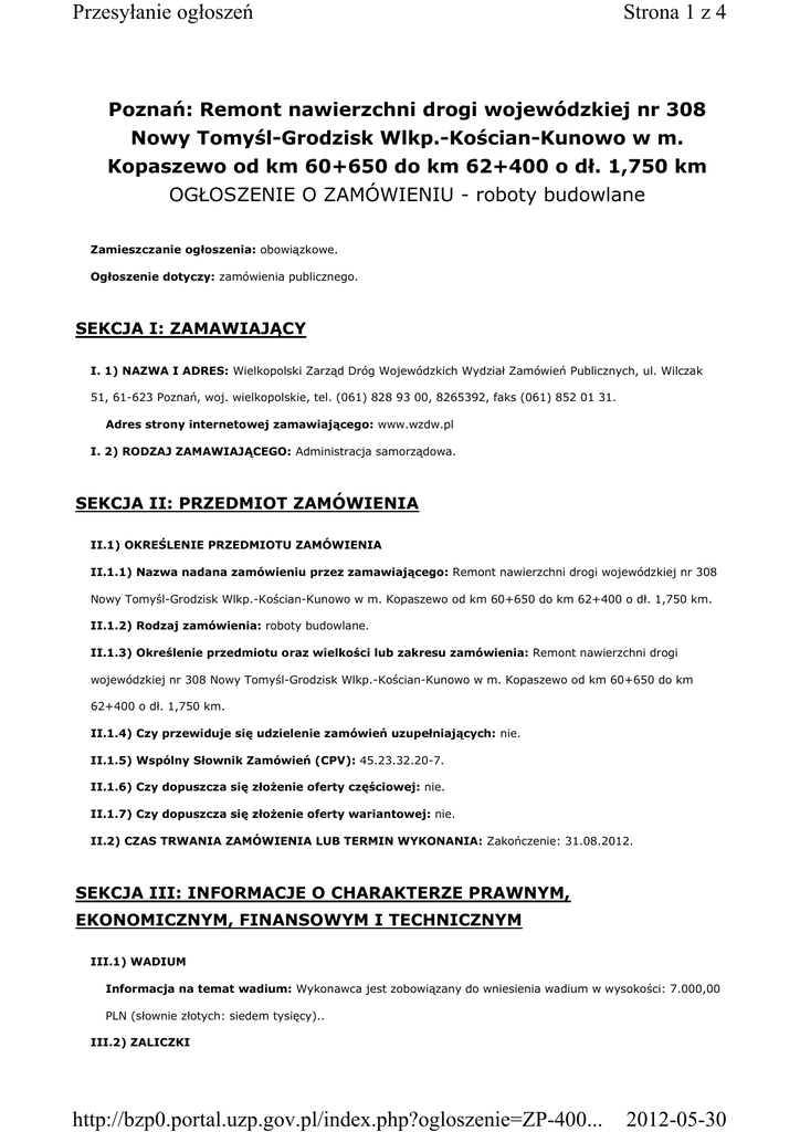 Przesyłanie ogłoszeń Strona 1 z 4 Poznań: Remont nawierzchni drogi wojewódzkiej nr 308 Nowy Tomyśl-Grodzisk Wlkp.-Kościan-Kunowo w m. Kopaszewo od km 60+650 do km 62+400 o dł. 1,750 km OGŁOSZENIE O ZAMÓWIENIU - roboty budowlane Zamieszczanie ogłoszenia: obowiązkowe. Ogłoszenie dotyczy: zamówienia publicznego. SEKCJA I: ZAMAWIAJĄCY I. 1) NAZWA I ADRES: Wielkopolski Zarząd Dróg Wojewódzkich Wydział Zamówień Publicznych, ul. Wilczak 51, 61-623 Poznań, woj. wielkopolskie, tel. (061) 828 93 00, 8265392, faks (061) 852 01 31. Adres strony internetowej zamawiającego: www.wzdw.pl I. 2) RODZAJ ZAMAWIAJĄCEGO: Administracja samorządowa. SEKCJA II: PRZEDMIOT ZAMÓWIENIA II.1) OKREŚLENIE PRZEDMIOTU ZAMÓWIENIA II.1.1) Nazwa nadana zamówieniu przez zamawiającego: Remont nawierzchni drogi wojewódzkiej nr 308 Nowy Tomyśl-Grodzisk Wlkp.-Kościan-Kunowo w m. Kopaszewo od km 60+650 do km 62+400 o dł. 1,750 km. II.1.2) Rodzaj zamówienia: roboty budowlane. II.1.3) Określenie przedmiotu oraz wielkości lub zakresu zamówienia: Remont nawierzchni drogi wojewódzkiej nr 308 Nowy Tomyśl-Grodzisk Wlkp.-Kościan-Kunowo w m. Kopaszewo od km 60+650 do km 62+400 o dł. 1,750 km. II.1.4) Czy przewiduje się udzielenie zamówień uzupełniających: nie. II.1.5) Wspólny Słownik Zamówień (CPV): 45.23.32.20-7. II.1.6) Czy dopuszcza się złoŜenie oferty częściowej: nie. II.1.7) Czy dopuszcza się złoŜenie oferty wariantowej: nie. II.2) CZAS TRWANIA ZAMÓWIENIA LUB TERMIN WYKONANIA: Zakończenie: 31.08.2012. SEKCJA III: INFORMACJE O CHARAKTERZE PRAWNYM, EKONOMICZNYM, FINANSOWYM I TECHNICZNYM III.1) WADIUM Informacja na temat wadium: Wykonawca jest zobowiązany do wniesienia wadium w wysokości: 7.000,00 PLN (słownie złotych: siedem tysięcy).. III.2) ZALICZKI http://bzp0.portal.uzp.gov.pl/index.php?ogloszenie=ZP-400... 2012-05-30 Przesyłanie ogłoszeń Strona 2 z 4 Czy przewiduje się udzielenie zaliczek na poczet wykonania zamówienia: nie III.3) WARUNKI UDZIAŁU W POSTĘPOWANIU ORAZ OPIS SPOSOBU DOKONYWANIA OCENY SPEŁNIANIA TYCH WARUNKÓW III.3.1) Uprawnienia do wykonywania określonej działalności lub czynności, jeŜeli przepisy prawa nakładają obowiązek ich posiadania Opis sposobu dokonywania oceny spełniania tego warunku 1.W postępowaniu mogą brać udział Wykonawcy niepodlegający wykluczeniu z powodu niespełnienia warunków o których mowa w art.24 ust.1 i 2 ustawy Pzp oraz spełniający warunki o których mowa w art. 22 ust 1 ustawy Pzp i określonych w SIWZ. 2.Zamawiający dokona oceny spełniania warunków udziału w postępowaniu na podstawie oświadczeń i dokumentów na zasadzie spełnia/nie spełnia. III.3.2) Wiedza i doświadczenie Opis sposobu dokonywania oceny spełniania tego warunku Wykonawca musi wykazać, Ŝe zrealizował (zakończył) , jako strona umowy w okresie ostatnich 5 lat przed upływem terminu składania ofert, a jeŜeli okres prowadzenia działalności jest krótszy- w tym okresie co najmniej trzy zadania związane z budową, przebudową lub remontem dróg, kaŜde o wartości nie mniejszej niŜ 700.000,00 PLN W przypadku gdy wartość wykazywanego zamówienia określona została w walucie innej niŜ wskazana przez Zamawiającego Wykonawca przeliczy ją według średniego kursu NBP na dzień zatwierdzenia protokołu odbioru robót lub równowaŜnego dokumentu, podając datę zatwierdzenia protokołu/ dokumentu i kurs walut III.3.3) Potencjał techniczny Opis sposobu dokonywania oceny spełniania tego warunku nie dotyczy III.3.4) Osoby zdolne do wykonania zamówienia Opis sposobu dokonywania oceny spełniania tego warunku nie dotyczy III.3.5) Sytuacja ekonomiczna i finansowa Opis sposobu dokonywania oceny spełniania tego warunku nie dotyczy III.4) INFORMACJA O OŚWIADCZENIACH LUB DOKUMENTACH, JAKIE MAJĄ DOSTARCZYĆ WYKONAWCY W CELU POTWIERDZENIA SPEŁNIANIA WARUNKÓW UDZIAŁU W POSTĘPOWANIU ORAZ NIEPODLEGANIA WYKLUCZENIU NA PODSTAWIE ART. 24 UST. 1 USTAWY III.4.1) W zakresie wykazania spełniania przez wykonawcę warunków, o których mowa w art. 22 ust. 1 ustawy, oprócz oświadczenia o spełnieniu warunków udziału w postępowaniu, naleŜy przedłoŜyć: wykaz robót budowlanych w zakresie niezbędnym do wykazania spełniania warunku wiedzy i doświadczenia, wykonanych w okresie ostatnich pięciu lat przed upływem terminu składania ofert http://bzp0.portal.uzp.gov.pl/index.php?ogloszenie=ZP-400... 2012-05-30 Przesyłanie ogłoszeń Strona 3 z 4 albo wniosków o dopuszczenie do udziału w postępowaniu, a jeŜeli okres prowadzenia działalności jest krótszy - w tym okresie, z podaniem ich rodzaju i wartości, daty i miejsca wykonania oraz załączeniem dokumentu potwierdzającego, Ŝe roboty zostały wykonane zgodnie z zasadami sztuki budowlanej i prawidłowo ukończone III.4.2) W zakresie potwierdzenia niepodlegania wykluczeniu na podstawie art. 24 ust. 1 ustawy, naleŜy przedłoŜyć: oświadczenie o braku podstaw do wykluczenia aktualny odpis z właściwego rejestru, jeŜeli odrębne przepisy wymagają wpisu do rejestru, w celu wykazania braku podstaw do wykluczenia w oparciu o art. 24 ust. 1 pkt 2 ustawy, wystawiony nie wcześniej niŜ 6 miesięcy przed upływem terminu składania wniosków o dopuszczenie do udziału w postępowaniu o udzielenie zamówienia albo składania ofert, a w stosunku do osób fizycznych oświadczenie w zakresie art. 24 ust. 1 pkt 2 ustawy III.4.3) Dokumenty podmiotów zagranicznych JeŜeli wykonawca ma siedzibę lub miejsce zamieszkania poza terytorium Rzeczypospolitej Polskiej, przedkłada: III.4.3.1) dokument wystawiony w kraju, w którym ma siedzibę lub miejsce zamieszkania potwierdzający, Ŝe: nie otwarto jego likwidacji ani nie ogłoszono upadłości - wystawiony nie wcześniej niŜ 6 miesięcy przed upływem terminu składania wniosków o dopuszczenie do udziału w postępowaniu o udzielenie zamówienia albo składania ofert III.7) Czy ogranicza się moŜliwość ubiegania się o zamówienie