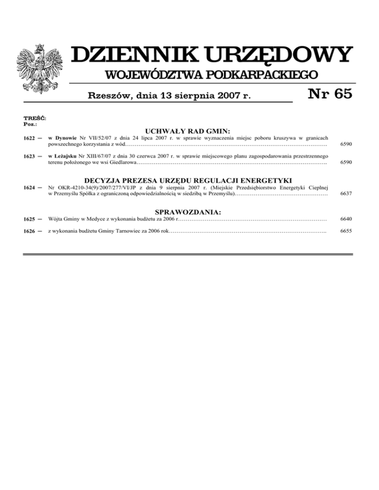 DZIENNIK URZĘDOWY WOJEWÓDZTWA PODKARPACKIEGO Rzeszów, dnia 13 sierpnia 2007 r. Nr 65 TREŚĆ: Poz.: UCHWAŁY RAD GMIN: 1622 ─ 1623 ─ w Dynowie Nr VII/52/07 z dnia 24 lipca 2007 r. w sprawie wyznaczenia miejsc poboru kruszywa w granicach powszechnego korzystania z wód……………………………………………………………………………………………. 6590 w Leżajsku Nr XIII/67/07 z dnia 30 czerwca 2007 r. w sprawie miejscowego planu zagospodarowania przestrzennego terenu położonego we wsi Giedlarowa………………………………………………………………………………………. 6590 DECYZJA PREZESA URZĘDU REGULACJI ENERGETYKI 1624 ─ Nr OKR-4210-34(9)/2007/277/VI/JP z dnia 9 sierpnia 2007 r. (Miejskie Przedsiębiorstwo Energetyki Cieplnej w Przemyślu Spółka z ograniczoną odpowiedzialnością w siedzibą w Przemyślu)…………………………………………. 6637 SPRAWOZDANIA: 1625 ─ Wójta Gminy w Medyce z wykonania budżetu za 2006 r…………………………………………………………………… 6640 1626 ─ z wykonania budżetu Gminy Tarnowiec za 2006 rok……………………………………………………………………….. 6655 Dziennik Urzędowy Województwa Podkarpackiego - 6590 - Poz. 1622 i 1623 1622 UCHWAŁA Nr VII/52/07 RADY GMINY W DYNOWIE z dnia 24 lipca 2007 r. w sprawie wyznaczenia miejsc poboru kruszywa w granicach powszechnego przystania z wód Na podstawie art. 18 ust. 2 pkt. 15 ustawy z dnia 8 marca 1990 roku o samorządzie gminnym (Dz. U. z 2001 roku Nr 142, poz.1591 z późn. zm.) oraz art. 34 ust. 4 ustawy z dnia 18 lipca 2001 roku - Prawo wodne (Dz. U. z 2005 roku Nr 239, poz. 2019 z późn. zm.) po uzyskaniu zgody przez Dyrektora Regionalnego Zarządu Gospodarki Wodnej w Krakowie - Rada Gminy w Dynowie uchwala co następuje: w km: 230, 100-230,000 brzeg: lewy § 2. Wykonanie uchwały powierza się Wójtowi Gminy. § 3. Uchwała wchodzi w życie po upływie 14 dni od dnia ogłoszenia w Dzienniku Urzędowym Województwa Podkarpackiego. § 1. Wyznacza się miejsce poboru kruszywa w granicach powszechnego korzystania z wód w niżej wymienionym miejscu zlokalizowanym na terenie Gminy Dynów: PRZEWODNICZĄCY RADY GMINY z rzeki: San w miejscowości: Bachórz Tadeusz Paździorny 1623 UCHWAŁA Nr XIII/67/07 RADY GMINY LEŻAJSK z dnia 30 czerwca 2007 r. w sprawie miejscowego planu zagospodarowania przestrzennego terenu położonego we wsi Giedlarowa Na podstawie art. 18 ust. 2 pkt. 5 ustawy z dnia 8 marca 1990 r. o samorządzie gminnym (Dz. U. z 2001 r. Nr 142, poz. 1591; zmiana Dz. U. z 2002 r. Nr 23, poz. 220, Nr 62, poz. 558, Nr 113, poz. 984, Nr 153, poz. 1271, Nr 214, poz. 1806, Dz. U. z 2003 r. Nr 80, poz. 717, Nr 162, poz. 1568, Dz. U. z 2004 r. Nr 102, poz. 1055, Nr 116, poz. 1203, Dz. U. z 2005 r. Nr 172, poz.1441, Nr 175 poz. 1457, Dz. U. z 2006 r. Nr 17, poz. 128, Nr 181 poz. 1337, Dz. U. z 2007 r. Nr 48, poz. 327) oraz art. 20 ust. 1 ustawy z dnia 27 marca 2003 r. o planowaniu i zagospodarowaniu przestrzennym (Dz. U. Nr 80, poz. 717, zmiana Dz. U. z 2004 r. Nr 6, poz. 41, Nr 141, poz. 1492, Dz. U. z 2005 r. Nr 113, poz. 954, Nr 130, poz. 1087, Dz. U. z 2006 r. Nr 45, poz. 319, Nr 225 poz. 1635) i po stwierdzeniu zgodności projektu planu z ustaleniami Studium uwarunkowań i kierunków zagospodarowania przestrzennego Gminy Leżajsk (uchwała Rady Gminy Leżajsk Nr XV/146/00 z dnia 28 kwietnia 2000 r.), Rada Gminy uchwala, co następuje: Rozdział I Ustalenia ogólne § 1. 1. Uchwala się miejscowy plan zagospodarowania przestrzennego terenu położonego we wsi Giedlarowa, z wyłączeniem terenu projektowanej obwodnicy drogowej Miasta Leżajska, objętego uchwałą Nr XXIV/216/01 Rady Gminy Leżajsk z dnia 29 czerwca 2001 roku w sprawie przystąpienia do sporządzania miejscowego planu zagospodarowania przestrzennego. 2. Integralną częścią planu jest rysunek planu w skali 1:2000 (34 arkusze), stanowiący załącznik Nr 1 do niniejszej uchwały. 3. Załącznikiem Nr 2 do uchwały jest rozstrzygnięcie sposobu realizacji zapisanych w planie inwestycji z zakresu infrastruktury technicznej, które należą do zadań własnych gminy oraz zasadach ich finansowania.* 4. Następujące oznaczenia oznaczeniami obowiązującymi: na rysunku planu są 1) granice obszaru opracowania, 2) linie rozgraniczające tereny o różnym przeznaczeniu lub różnych zasadach zagospodarowania wraz z symbolami identyfikacyjnymi tych terenów, 3) nieprzekraczalne linie zabudowy, Dziennik Urzędowy Województwa Podkarpackiego - 6591 - Poz. 1623 4) obiekty objęte ochroną konserwatorską (wpisane do rejestru), 5) obiekty wpisane do ewidencji zabytków, 6) obiekty objęte ochroną archeologiczną (wpisane do rejestru), 7) stanowiska archeologiczne, 4) UP, UP1 - tereny usług publicznych, 8) obszary objęte ochroną przyrody, 5) U, U1, U2 - tereny zabudowy usługowej, 9) granica Obszaru Chronionego Krajobrazu, 6) US1, US2 - tereny sportu i rekreacji, 10) strefy ochrony konserwatorskiej, 7) UR - tereny urządzeń rekreacyjnych, 11) strefy ochronne ujęć wody pitnej, 12) strefa ochronna Głównego Zbiornika Wód Podziemnych, 13) strefy ochronne wokół cmentarzy, 14) granica obszaru i terenu górniczego „Żołynia - Leżajsk” dla złoża gazu ziemnego. 1) RMN - tereny zabudowy zagrodowej i mieszkaniowej jednorodzinnej, 2) MN - tereny zabudowy mieszkaniowej jednorodzinnej, 3) RM - tereny zabudowy zagrodowej w gospodarstwach rolnych, hodowlanych i ogrodniczych, 8) P i magazynów, tereny obiektów produkcyjnych, składów 9) PE - tereny eksploatacji złoża piasku, 10) R - tereny rolnicze, 11) ZN - tereny zieleni objęte ochroną, 5. Następujące oznaczenia na rysunku planu są ustaleniami informacyjnymi: 12) ZL - tereny lasów, 13) RZ - tereny do zalesienia, 1) strefy techniczne linii elektroenergetycznych, 2) strefy techniczne i kontrolowane gazociągów wysokiego ciśnienia. 15) ZR - tereny zi