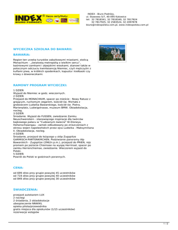 INDEX - Biuro Podróży, ul. Stawowa 5/7, 40-095 Katowice tel: 32 7818341, 32 7818340, 32 7817924 32 7817925, 32 2583524, 32 2097878 [email protected], www.indexpolska.com.pl WYCIECZKA SZKOLNA DO BAWARII: BAWARIA: Region ten urzeka turystów zabytkowymi miastami, stolicą Monachium - „światową metropolią o wielkim sercu”, baśniowymi zamkami i alpejskimi wioskami, stanowi także w potocznym odczuciu kwintesencję Niemiec, czyli mężczyźni z kuflami piwa, w krótkich spodenkach, kapusta i kiełbaski czy krowy z dzwoneczkami. RAMOWY PROGRAM WYCIECZKI: 1 DZIEŃ Wyjazd do Niemiec w godz. wieczornych. 2 DZIEŃ Przejazd do MONACHIUM, spacer po mieście - Nowy Ratusz z grającym, ruchomym zegarem, kościół św. Michała z grobowcem Ludwika Bawarskiego, kościół św. Piotra, Marienplatz, Ludwigstrasse, muzeum BMW. Obiadokolacja, nocleg. 3 DZIEŃ Śniadanie. Wyjazd do FUSSEN, zwiedzanie Zamku Neuschwenstein - stanowiącego inspiracje dla twórców bajkowego pałacu w "Cudownym świecie" W.Disneya. Hohenschwangau - zamek odbudowany po zniszczeniach z okresu wojen napoleońskich przez ojca Ludwika - Maksymiliana II. Obiadokolacja, nocleg. 4 DZIEŃ Śniadanie, przejazd do leżącego u stóp Zugspitze GARMISCH-PARTENKIRCHEN. Podziwianie panoramy Alp Bawarskich - Zugspitze (2962n.p.m.), przejazd do PRIEN, rejs promem po jeziorze Chiemsee na wyspę Herrinsel, spacer po zamku Herrenchiemse, zwiedzanie. Wieczorem wyjazd do Polski. 5 DZIEŃ Powrót do Polski w godzinach porannych. CENA: od 699 zł/os przy grupie powyżej 45 uczestników od 719 zł/os przy grupie powyżej 40 uczestników od 849 zł/os przy grupie powyżej 30 uczestników ŚWIADCZENIA: przejazd autokarem LUX 2 noclegi 2 śniadania, 2 obiadokolacje ubezpieczenie NNWiKL opieka pilota/przewodnika gratis miejsca dla opiekunów (1/15 uczestników) rezerwacje wstępów 1/2 wszystkie opłaty drogowe i parkingi podatek VAT WSTĘPY: Cena nie zawiera biletów wstępu - ok. 50 Euro. ORIENTACYJNE CENY: Monachium - wieża olimpijska 5 EUR , Świat BMW ( bezpłatnie ) ZAMEK NEUSCHWANSTEIN 2 EUR ZAMEK HERRENCHIEMSEE gratis Wyjazd kolejką na ECKBAUER (14 EUR- normalny, 10 EURulgowy ) Rejs statkiem po Jeziorze Chiemsee na Wyspę Herreninsel, 8 EUR , dzieci do 15 lat 6 EUR Zestawy słuchawkowe 6 Eur/os Ceny biletów wstępu są cenami orientacyjnymi i mogą one ulec zmianie niezależnie od Biura Podróży Index, dlatego prosimy o powiększenie funduszu na pokrycie ewentualnych podwyżek cen biletów. 2/2 Powered by TCPDF (www.tcpdf.org)