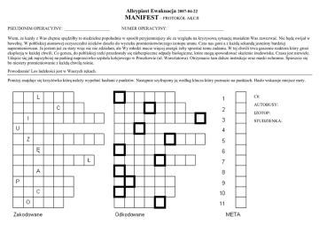 Alleypiast Ewakuacja 2007-04-22 MANIFEST – PROTOKÓŁ AKCJI PSEUDONIM OPERACYJNY: _____________________ NUMER OPERACYJNY: _____________________ Wiem, że każdy z Was chętnie spędziłby to niedzielne popołudnie w sposób przyjemniejszy ale ze względu na kryzysową sytuację musiałem Was zawezwać. Nie będę owijał w bawełnę. W pobliskiej atomowej oczyszczalni ścieków doszło do wycieku promieniotwórczego izotopu uranu. Czas nas goni a z każdą sekundą jesteśmy bardziej napromieniowani. Ja jestem już za stary więc nic nie zdziałam, ale Wy młodzi macie więcej energii żeby sprostać temu zadaniu. W tej chwili trwa gaszenie reaktora który grozi eksplozją w każdej chwili. Co gorsza, do pobliskiej rzeki przedostały się niebezpieczne odpady biologiczne, które mogą spowodować skażenie środowiska. Czasu jest niewiele. Udajcie się jak najszybciej na parking naprzeciwko szpitala kolejowego w Pruszkowie (ul. Warsztatowa). Otrzymacie tam dalsze instrukcje oraz maski ochronne. Śpieszcie się bo niestety promieniowanie z każdą chwilą rośnie. Powodzenia! Los ludzkości jest w Waszych rękach. Poniżej znajduje się krzyżówka którą należy wypełnić hasłami z punktów. Następnie szyfrujemy ją według klucza który poznacie na punktach. Hasło wskazuje miejsce mety. C6: AUTOBUSY: IZOTOP: STUDZIENKA: