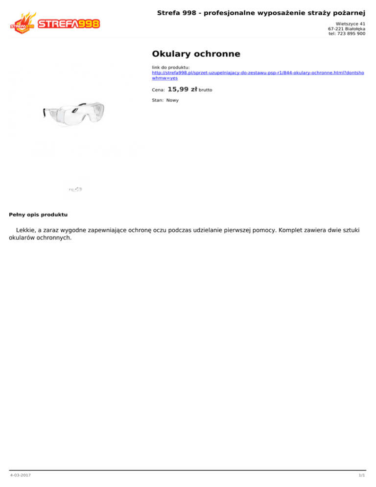 Strefa 998 - profesjonalne wyposażenie straży pożarnej Wietszyce 41 67-221 Białołęka tel: 723 895 900 Okulary ochronne link do produktu: http://strefa998.pl/sprzet-uzupelniajacy-do-zestawu-psp-r1/844-okulary-ochronne.html?dontsho whmw=yes Cena: 15,99 zł brutto Stan: Nowy Pełny opis produktu Lekkie, a zaraz wygodne zapewniające ochronę oczu podczas udzielanie pierwszej pomocy. Komplet zawiera dwie sztuki okularów ochronnych. 4-03-2017 1/1