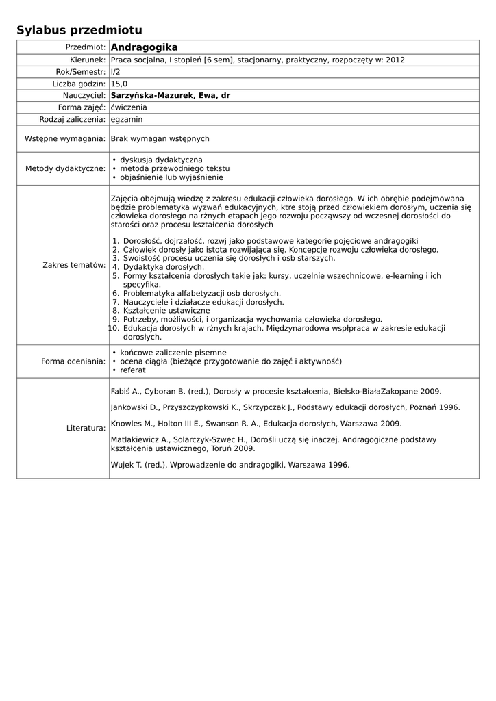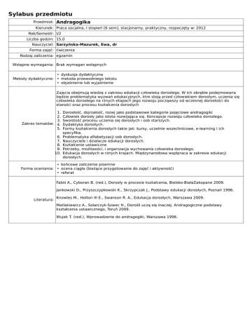 Sylabus przedmiotu Przedmiot: Andragogika Kierunek: Praca socjalna, I stopień [6 sem], stacjonarny, praktyczny, rozpoczęty w: 2012 Rok/Semestr: I/2 Liczba godzin: 15,0 Nauczyciel: Sarzyńska-Mazurek, Ewa, dr Forma zajęć: ćwiczenia Rodzaj zaliczenia: egzamin Wstępne wymagania: Brak wymagan wstępnych • dyskusja dydaktyczna Metody dydaktyczne: • metoda przewodniego tekstu • objaśnienie lub wyjaśnienie Zajęcia obejmują wiedzę z zakresu edukacji człowieka dorosłego. W ich obrębie podejmowana będzie problematyka wyzwań edukacyjnych, ktre stoją przed człowiekiem dorosłym, uczenia się człowieka dorosłego na rżnych etapach jego rozwoju począwszy od wczesnej dorosłości do starości oraz procesu kształcenia dorosłych 1. 2. 3. Zakres tematów: 4. 5. 6. 7. 8. 9. 10. Dorosłość, dojrzałość, rozwj jako podstawowe kategorie pojęciowe andragogiki Człowiek dorosły jako istota rozwijająca się. Koncepcje rozwoju człowieka dorosłego. Swoistość procesu uczenia się dorosłych i osb starszych. Dydaktyka dorosłych. Formy kształcenia dorosłych takie jak: kursy, uczelnie wszechnicowe, e-learning i ich specyfika. Problematyka alfabetyzacji osb dorosłych. Nauczyciele i działacze edukacji dorosłych. Kształcenie ustawiczne Potrzeby, możliwości, i organizacja wychowania człowieka dorosłego. Edukacja dorosłych w rżnych krajach. Międzynarodowa wspłpraca w zakresie edukacji dorosłych. • końcowe zaliczenie pisemne Forma oceniania: • ocena ciągła (bieżące przygotowanie do zajęć i aktywność) • referat Fabiś A., Cyboran B. (red.), Dorosły w procesie kształcenia, Bielsko-BiałaZakopane 2009. Jankowski D., Przyszczypkowski K., Skrzypczak J., Podstawy edukacji dorosłych, Poznań 1996. Literatura: Knowles M., Holton III E., Swanson R. A., Edukacja dorosłych, Warszawa 2009. Matlakiewicz A., Solarczyk-Szwec H., Dorośli uczą się inaczej. Andragogiczne podstawy kształcenia ustawicznego, Toruń 2009. Wujek T. (red.), Wprowadzenie do andragogiki, Warszawa 1996.