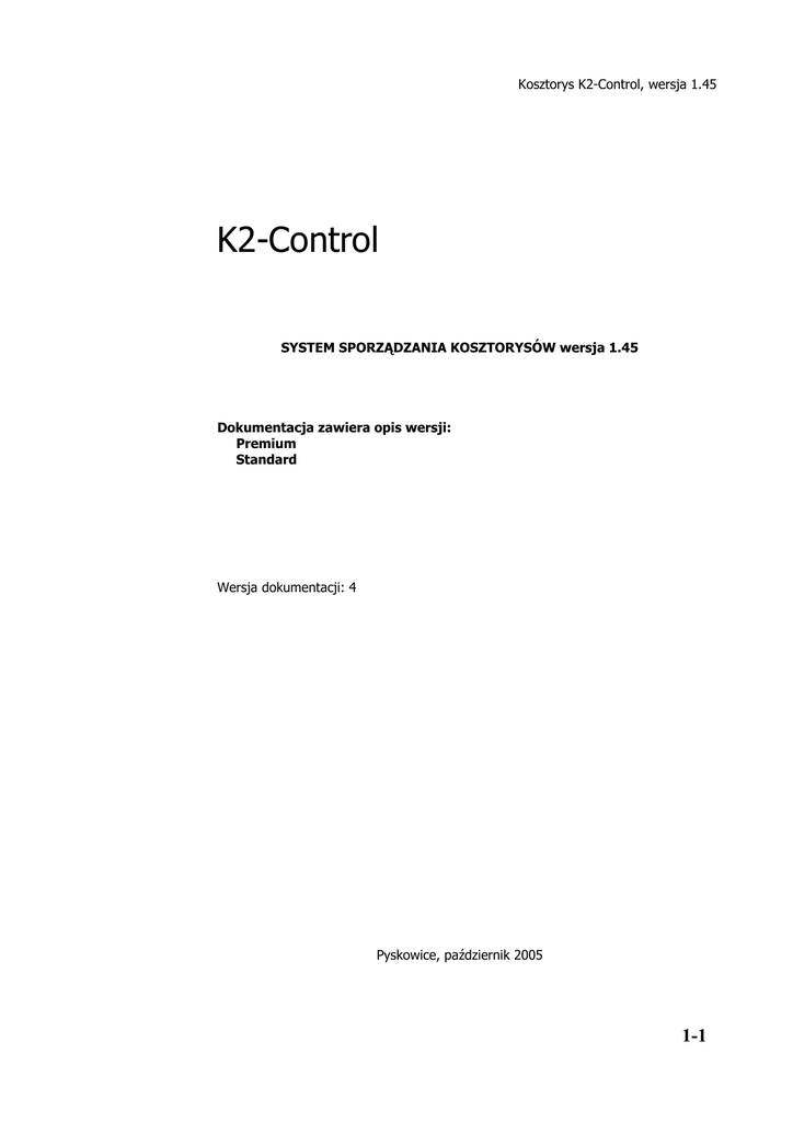 Kosztorys K2-Control, wersja 1.45 K2-Control SYSTEM SPORZĄDZANIA KOSZTORYSÓW wersja 1.45 Dokumentacja zawiera opis wersji: Premium Standard Wersja dokumentacji: 4 Pyskowice, październik 2005 1-1 Kosztorysy K2-Control, wersja 1.45 Spis treści 1 INFORMACJE OGÓLNE. .............................................................................................................. 3 2 DODATKOWE USTALENIA LICENCYJNE. ...................................................................................... 3 3 CYKL PRZETWARZANIA KOSZTORYSU......................................................................................... 5 3.1 TWORZENIE NOWEGO KOSZTORYSU. ........................................................................................... 5 3.1.1 Wprowadzanie nowych rozdziałów. ............................................................................. 5 3.1.2 Okno edycji danych pozycji kosztorysowej. .................................................................. 5 3.1.3 Wprowadzanie nowych pozycji do kosztorysu............................................................... 6 3.1.4 Wyszukiwanie pozycji w katalogach KNR. .................................................................... 6 3.1.5 Modyfikacja połoŜenia pozycji. .................................................................................... 7 3.1.6 Modyfikacja nakładów w pozycji kosztorysowej. ........................................................... 7 3.1.7 Dodawanie pustej pozycji kosztorysowej...................................................................... 7 3.1.8 Kopiowanie pozycji..................................................................................................... 7 3.1.9 Modyfikacja właściwości pozycji. ................................................................................. 7 3.2 CENNIKI .............................................................................................................................. 8 3.3 WPROWADZANIE CEN. ............................................................................................................ 9 3.4 OBLICZENIA. ........................................................................................................................ 9 3.5 WYDRUKI. ..........................................................................................................................10 3.6 RUSZTOWANIA.....................................................................................................................10 3.7 OTWIERANIE „STARYCH” KOSZTORYSÓW (Z WERSJI DOS PROGRAMU). ..............................................11 4 NARZUTY. ................................................................................................................................11 5 WIELOPOZIOMOWY SYSTEM CEN..............................................................................................11 5.1 6 OBSŁUGA BAZY KATALOGÓW NAKŁADÓW RZECZOWYCH. ..........................................................15 6.1 6.2 6.3 6.4 6.5 6.6 6.7 7 WCZYTYWANIE CEN Z DYSKIETEK. .............................................................................................12 MODYFIKACJE REJESTRU KATALOGÓW. .......................................................................................15 DODAWANIE/MODYFIKACJA DANYCH OGÓLNYCH KATALOGU..............................................................15 WCZYTYWANIE KATALOGÓW Z PLIKÓW ZEWNĘTRZNYCH. .................................................................15 ZAPISYWANIE KATALOGU DO PLIKU............................................................................................16 EDYCJA STRUKTURY KATALOGU.................................................................................................16 EDYCJA ZAWARTOŚCI KOLUMN W TABELACH KATALOGU. ..................................................................17 PARAMETRYZOWANIE POZYCJI (WARIANTY, GRUPY, WYBORY). .........................................................19 OBSŁUGA WARIANTÓW. ...........................................................................................................20 7.1 7.2 7.3 SKREŚLANIE I PRZYDZIELANIE POZYCJI KOSZTORYSOWEJ DO WARIANTÓW............................................20 DEFINIOWANIE WARIANTÓW KOSZTORYSU I ZAKRESU OBLICZEŃ........................................................21 ANALIZA WARIANTÓW. ...........................................................................................................22 8 EKSPORT KOSZTORYSU W FORMACIE HTML (STRONY SIECI WEB). ............................................23 9 KONFIGURACJA PROGRAMU......................................................................................................24 9.1 10 PRACA PROGRAMU W ŚRODOWISKU SIECIOWYM. .................................................................25 10.1 11 KONFIGURACJA KOLORÓW.......................................................................................................24 WSPÓLNA BAZA CEN, NAKŁADÓW RMS I KATALOGÓW STANDARDOWYCH.............................................25 DOSTĘP DO KATALOGÓW KNR Z WERSJI DOS. ......................................................................25 1-2 Kosztorys K2-Control, wersja 1.45 1 Informacje ogólne. Program K2-Control w wersji Premium umoŜliwia między innymi: - tworzenie kosztorysów o róŜnym zakresie szczegółowości, przeliczanie utworzonych kosztorysów w celu uzyskania wydruków kosztorysów, przeglądania utworzonych zestawień przed końcowym wydrukiem, korzystanie z kilku baz cenowych jednocześnie z moŜliwością wyboru algorytmu wyboru cen. Program K2-Control w wersji Standard umoŜliwia ponadto: - skreślanie pozycji kosztorysowych bez konieczności ich usuwania, tworzenie wariantów i przydzielanie do nich wybranych pozycji kosztorysowych, zmianę bieŜącego wariantu obliczeń, analizę róŜnych wariantów kosztorysu. 2 Dodatkowe ustalenia licencyjne. Program oraz jego składniki podlegają ochronie prawnej w