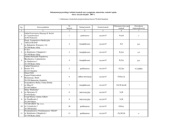 Dokumentacja przebiegu i efektów kontroli oraz wystąpienia, stanowiska, wnioski i opinie. okres: styczeń-sierpień 2007 r. 1. Informacja o kontrolach przeprowadzonych przez Wydział Inspekcji: Lp. Nazwa podmiotu 1 2 1 2 3 4 5 6 7 8 9 10 11 Zakład Przetwórstwa Mięsnego R. Hochel ul. Częstochowska 6 26-065 Piekoszów Przed. Transportowo-Spedycyjne "MEGATRANS" ul. Bohaterów Warszawy 116 28-100 Busko Zdrój P. H.U. ul. Batalionów Chłopskich 3 28-100 Busko Zdrój Zakład Mechaniki Pojazdowej Blacharstwo i Lakiernictwo ul. Sienkieicza 3 28-100 Busko Zdrój Zakład Piekarniczy Kozów 34 b 26-212 Smyków Stacja Paliw Zajazd Wiśniewskich Resteuracja i Hotel 28-520 Opatowiec, Kraśniów Gospodarstwo Rolne, Ferma Drobiu ul. Dług 43 28-305 Sobków Sklep "Biedronka" ul. Meissnera 22 25-634 Kielce Urząd Miasta i Gminy Fałków ul. Przedborska 2 26-260 Fałków "STAR-GRES" Sp. z o.o. ul. Ceramiczna 5 26-200 Końskie Przedsiębiorstwo Wielobranżowe "REGO" ul. Batalionów Chłopskich 3 28-100 Busko Zdrój 5 Dokumenty dotyczące kontroli 6 Stwierdzone nieprawidłowości 7 problemowa styczeń 07 P,Is,M ś 2 kompleksowa styczeń 07 P,Z p,o 3 kompleksowa styczeń 07 P,Z,Is o,ś 4 kompleksowa styczeń 07 P,Z,Is p,o 5 problemowa styczeń 07 P,Z,Irz w,ś,opłaty 6 odbior inwestycji styczeń 07 P,Post.,Is 7 kompleksowa styczeń 07 P,Z,W,Irz,M 8 interwencyjna styczeń 07 N,W 9 interwencyjna styczeń 07 N,W 10 problemowa styczeń 07 P,Post. 11 problemowa styczeń 07 P,Z,W,M Nr kontroli 3 Rodzaj kontroli Termin kontroli 4 1 o 12 13 14 15 16 17 18 19 20 21 22 23 24 25 "Nowa Dolina Nidy" Sp. z o.o. Produkcja Suchych Mieszanek Leszcze 15 28-400 Pińczów P.P.U.H. ul. Spacerowa 90 26-200 Końskie F.H.U."MARDI 2" Stacja Demontażu Pojazdów ul. Armii Krajowej 12 28-300 Końskie Gospodarstwo rolne. Ferma Trzody Chlewnej ul. Krótka 4 27-230 Brody DRIMPOL Sp.j. ul. Graniczna 26 25-649 Kielce PSS Społem ul. Piłsudskiego 26 26-200 Końskie "Power Beat" s.c. Ul. Młyńska 11 26-200 Końskie P.P.H.U. " MARCO" ul. Piłsudskiego 40 29-100 Włoszczowa "Auto MAKRO" Naprawa, Blacharstwo i Lakiernictwo ul. Bodzentyńska 33 26-130 Suchedniów Miejski Ośrodek Sportu i Rekreacji ul. Żytnia 1 25-018 Kielce Ceramika GRESS S.A. Kopaliny 26-200 Końskie "SMALSKWAR" ul. Różana 35 26-200 Końskie Gospodarstwo rolne Pawłowice 28-340 Sędziszów Piekarnia "Jan Szostak" ul. Wojska Polskiego 19 28-100 Busko Zdrój 12 odbior inwestycji styczeń 07 P,Z,Post. 13 interwencyjna styczeń 07 P,In 14 interwencyjna styczeń 07 P,Is o 15 problemowa styczeń 07 P,Z,Is,M o 16 problemowa styczeń 07 N 17 problemowa styczeń 07 P 18 problemowa styczeń 07 P 19 problemowa styczeń 07 P,Z,In,M h,o 20 problemowa styczeń 07 P,Z,In,M p,o 21 interwencyjna styczeń 07 P,Z,In,M h,o 22 problemowa styczeń 07 P,WER 23 interwencyjna styczeń 07 P,Z,Is,In o, opak. 24 kompleksowa styczeń/luty 2007 P,Z,Post. o,p,w,ś 25 kompleksowa luty 07 P,Z,Is o,p 26 27 28 29 30 31 32 33 34 35 36 37 38 Urząd Miasta i Gminy Busko Zdrój ul. Mickiewicza 10 28-100 Busko Zdrój P.P.U.H. "Remont" ul. Krakowska 36 Zbludowice 28-100 Busko Zdrój Myjnia Samochodowa "Kropla" ul. Dewońska 20A 25-637 Kielce "Stowarzyszenie Delta" (dot. stoku narciarskiego) ul. Sandomierska 4 27-423 Bałtów Urząd Gminy Łopuszno (dot. oczyszczalni ścieków) ul. Konecka 12 26-065 Łopuszno "WIR" Przetwórstwo Mięsa s.j. ul. Konecka 7A 26-070 Łopuszno "Vive Textile Recycling" Sp. z o.o. ul. Olszewskiego 6 25-663 Kielce MPEC Sp. z o.o ul. Mielczarskiego 139/143 Ciepłownia, ul. Hauke Bosaka 25-611 Kielce Ciepłownia C1-ul. Kościelna Zakład Energetyki Cieplnej ul. Radomska 10 27-200 Starachowice Ciepłownia C1-ul. Ostrowiecka Zakład Energetyki Cieplnej ul. Radomska 10 27-200 Starachowice "Market Plus" Sklep Firmowy" Avans" ul. Głowackiego 3 28-300 Jędrzejów "AWEX" s.j. ul. Kościuszki 59 26-021 Daleszyce "TECHMŁOT" Krasna 44 26-220 Stąporków 26 kompleksowa styczeń 07 P,W o 27 kompleksowa styczeń 07 P,Z o,opłaty 28 interwencyjna styczeń 07 P,Z,Is,In o 29 odbior inwestycji styczeń 07 P,Z,Post. o,ś 30 interwencyjna styczeń 07 P,Is 31 interwencyjna styczeń 07 P,Z,M ś 32 problemowa styczeń 07 P,Z,Irz o 33 problemowa styczeń 07 P,WER. 34 problemowa styczeń 07 P,WER. 35 problemowa styczeń 07 P,WER. 36 problemowa styczeń 07 P,Z 37 problemowa styczeń 07 P,Z,Is ś,w,o 38 odbior inwestycji styczeń 07 P,Post.,Is o 39 "Moto Serwis" Zakład Blacharsko Lakierniczy ul. Mielczarskiego 149 25-611 Kielce Zakłd Gospodarki Komunalnej i Mieszkaniowej w Tarłowie ul. Sandomierska 72 27-515 Tarłów Stacja Paliw Wólka Tarłowska 27-515 Tarłów Energetyka Cieplna Sp. z o.o. ul. 11-go Listopada 7 26-110 Skarżysko Kamienna 39 problemowa styczeń 07 P,Z,Irz,M 40 problemowa styczeń 07 P,Is 41 problemowa styczeń 07 P,Is 42 problemowa styczeń 07 P,WER. 43 Zakłady Wyrobów Kamionkowych "MARYWIL" S.A. ul. Sportowa 10 26-130 Suchedniów 43 problemowa styczeń 07 P,WER. 44 Zakład Skupu i Przerobu Złomu ul. Kanałowa 3 B 27-200 Starachowice 44 odbior inwestycji styczeń 07 P,Post. 45 Zakład Energetyki Cieplnej ul. Langiewicza 14 28-200 Staszów 45 problemowa luty 07 P,WER. 46 kompleksowa styczeń 07 P 47 problemowa styczeń 07 P,WER. 48 problemowa styczeń 07 P,WER. 49 problemowa 40 41 42 46 47 48 49 Miejsko Gminny Zakład Komunalny ul. Łagiewnicka 25 28-100 Busko Zdrój DS. Smith Polska S.A. ul. Malików 150 25-639 Kielce Zakład Energetyki Cieplnej (dot. ciepłownii przy ul. Odlewniczej) ul. Armii Krajowej 5 26-200 Końskie Cegielnia "CEG-FOL" s.c. ul. Klimontowska 18 28-221 Osiek o,opłaty P,WER. 50 Cegielnia Polowa Ruszcza ul. Przemysłowa 5 28-280 Połaniec 50 problemowa luty 07 P,WER. 51 F.H.U. "ELDOM" ul. Kolejowa 21 25-200 Staszów 51 problemowa styczeń/luty 2007 P,Z o 52 53 54 55 56 57 58 59 60 61 62 F.H.U. "SPRZĘTKOM" ul. Kościuszki 31 28-200 Staszów Gminny Zakład Usługowo InwestycyjnyBrzezie oczyszczalnia ścieków w Godowie 27-225 Pawłów Przedsiębiorstwo Gospodarki K