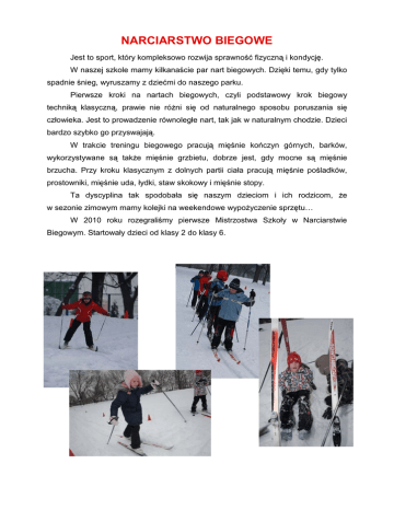NARCIARSTWO BIEGOWE Jest to sport, który kompleksowo rozwija sprawność fizyczną i kondycję. W naszej szkole mamy kilkanaście par nart biegowych. Dzięki temu, gdy tylko spadnie śnieg, wyruszamy z dziećmi do naszego parku. Pierwsze kroki na nartach biegowych, czyli podstawowy krok biegowy techniką klasyczną, prawie nie różni się od naturalnego sposobu poruszania się człowieka. Jest to prowadzenie równoległe nart, tak jak w naturalnym chodzie. Dzieci bardzo szybko go przyswajają. W trakcie treningu biegowego pracują mięśnie kończyn górnych, barków, wykorzystywane są także mięśnie grzbietu, dobrze jest, gdy mocne są mięśnie brzucha. Przy kroku klasycznym z dolnych partii ciała pracują mięśnie pośladków, prostowniki, mięśnie uda, łydki, staw skokowy i mięśnie stopy. Ta dyscyplina tak spodobała się naszym dzieciom i ich rodzicom, że w sezonie zimowym mamy kolejki na weekendowe wypożyczenie sprzętu… W 2010 roku rozegraliśmy pierwsze Mistrzostwa Szkoły w Narciarstwie Biegowym. Startowały dzieci od klasy 2 do klasy 6.