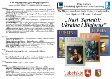 W XV Międzynarodowej Sesji Historycznoliterackiej „Nasi Sąsiedzi: Ukraina i Białoruś” udział biorą poeci, prozaicy, dramaturdzy, tłumacze i redaktorzy: Ukraina: * Olena Krysztalśka (Łuck) – poetka, tłumaczka, autorka (m. innymi) an tologii współczesnej poezji ukraińskiej „Grawitacja wzajemności” (w wersji dwujęzycznej: ukraińskopolskiej) * Teodozija Zariwna (Kijów) – poetka, prozaik, tłumaczka, dramaturg, ak torka teatralna * Switłana Krawczenko (Łuck) – literaturoznawca, profesor Uniwersyte tu im. Łesi Ukrainki w Łucku * Wasyl Hey (Łuck) – poeta, prozaik, publicysta, współpracownik czoło wych pism ukraińskich * Wasyl Słapczuk (Łuck) – poeta, prozaik, eseista, dziennikarz, autor gło śnych powieści:m.in. „Niema kukułka”, „Kobieta ze śniegu” (wyd. polskie – Lublin 2013 roku w serii „Biblioteka Literatur Naszych Sąsiadów” wydawa nej przez Stowarzyszenie Pisarzy Polskich i Zakład Filologii Ukraińskiej UMCS) * Pawlo Szczyryca (Kijów) – poeta, tłumacz poezji polskiej na ukraiński * Siergiej Ponomarenko (Kijów) – prozaik, autor popularnych powieści, m.in. „Pościg”, „Siódma świeca” (wydanie polskie – Lublin 2012 w serii „Bibliote ka Literatur Naszych Sąsiadów”) Dom Kultury Lubelskiej Spółdzielni Mieszkaniowej XV Międzynarodowa Sesja Historycznoliteracka „Nasi Sąsiedzi: Ukraina i Białoruś” „Nasi Sąsiedzi: Ukraina i Białoruś” Białoruś: * Marija Zhygalowa (Mińsk) – literaturoznawca, profesor Uniwersytetu Brze skiego im. A. Puszkina * Paweł Lachnowicz (Mińsk) – tłumacz literatury polskiej * Anatolij Rezanowicz (Mińsk) – prozaik, autor szeregu popularnych powieści * Nikołaj Aleksandrow (Brześć) – prozaik, redaktor „Kuriera Brzeskiego” * Ihor Mielniczuk (Brześć) – prozaik, publicysta * Aleksiej Fiłatow (Brześć) – poeta, prozaik, publicysta Rosja: * Wiaczesław ArSergi (Iżewsk) – poeta, prozaik, publicysta Słowacja: * Iwan Jackanin (Preszow) – czołowy prozaik ukraiński mieszkający na Sło wacji, redaktor naczelny miesięcznika literackiego „Dukla” Łotwa: * Eduards Aivars (Ryga) – poeta, tłumacz Bułgaria * Łyczezar Sielaszki (Sofia) – poeta, tłumacz literatury polskiej * Kamelia MinchevaGospodarek (Sofia) – tłumaczka, autorka przełożo nych na język polski tomów prozy Angela Wagensztajna, wybitnego prozaika bułgarskiego * Dejan Enev (Sofia) – prozaik, autor powieści, opowiadań i esejów cieszą cych się wielką popularnością. Opowiadania Dejana Eneva tłumaczyła na ję zyk polski Kamelia MinchevaGospodarek. Zrealizowano ze środków Miasta Lublin XV Międzynarodowa Sesja historycznoliteracka „Nasi Sąsiedzi: Ukraina i Białoruś” Lublin 18 maja – 30 listopada 2015 roku Dom Kultury Lubelskiej Spółdzielni Mieszkaniowej XV Międzynarodowa Sesja Historycznoliteracka „Nasi Sąsiedzi: Ukraina i Białoruś” W programie: • Spotkania z poetami, prozaikami, tłumaczami, krytykami lite rackimi i teatralnymi, naukowcami Ukrainy, Białorusi, Bułga rii, Rosji, Słowacji, Rumunii, Łotwy • Warsztaty translatorskie • Promocja najnowszych książek pisarzy środowiska lubelskiego • Promocja książek autorów ukraińskich • Promocja numerów dwumiesięcznika „Lublin. Kultura i Społe czeństwo” poświęconych związkom kulturowym Polski, Ukra iny, Litwy i Białorusi Organizatorzy: • Stowarzyszenie Pisarzy Polskich – Oddział w Lublinie • Zakład Filologii Ukraińskiej UMCS • Wydawnictwo „Polihymnia” – Lublin • Fundacja Willa Polonia – Lublin • Fundacja „Dla Pokoleń” – Lublin • Stowarzyszenie „Polska – Wschód” – Oddział w Lublinie • Redakcja dwumiesięcznika „Lublin. Kultura i Społeczeństwo” „Nasi Sąsiedzi: Ukraina i Białoruś” Wykłady inauguracyjne wygłoszą: • Prof. dr hab. Marija Zhygalowa (Uniwersytet im. A. Puszkina, Brześć) – Moje fascynacje literaturą polską • Prof. dr hab. Feliks Czyżewski (UMCS, Lublin) Świadomość językowa ludności pogranicza polskobiałorusko ukraińskiego i jej rola w kształtowaniu tożsamości narodowej na Podlasiu (w świetle inskrypcji nagrobnych) • Prof. dr hab. Jan Orłowski (UMCS, Lublin) Puszkin i Mickiewicz. Rosyjski mit dwóch poetów pod jednym płaszczem Inauguracja Sesji odbędzie się w czwartek 18 czerwca 2015 r. o godz. 17.00 w Galerii Sztuki Domu Kultury LSM w Lublinie, ul. K. Wallenroda 4a, tel. 81 743 48 29 www.domkulturylsm.pl Wstęp wolny