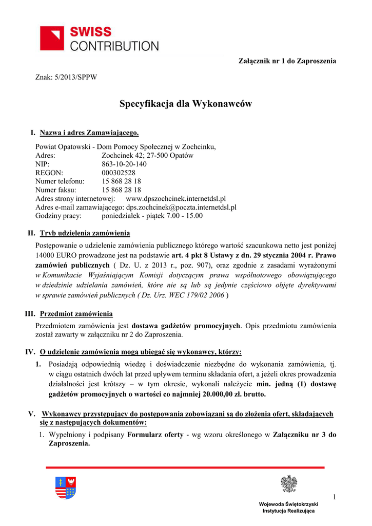 Załącznik nr 1 do Zaproszenia Znak: 5/2013/SPPW Specyfikacja dla Wykonawców I. Nazwa i adres Zamawiającego. Powiat Opatowski - Dom Pomocy Społecznej w Zochcinku, Adres: Zochcinek 42; 27-500 Opatów NIP: 863-10-20-140 REGON: 000302528 Numer telefonu: 15 868 28 18 Numer faksu: 15 868 28 18 Adres strony internetowej: www.dpszochcinek.internetdsl.pl Adres e-mail zamawiającego: [email protected] Godziny pracy: poniedziałek - piątek 7.00 - 15.00 II. Tryb udzielenia zamówienia Postępowanie o udzielenie zamówienia publicznego którego wartość szacunkowa netto jest poniżej 14000 EURO prowadzone jest na podstawie art. 4 pkt 8 Ustawy z dn. 29 stycznia 2004 r. Prawo zamówień publicznych ( Dz. U. z 2013 r., poz. 907), oraz zgodnie z zasadami wyrażonymi w Komunikacie Wyjaśniającym Komisji dotyczącym prawa wspólnotowego obowiązującego w dziedzinie udzielania zamówień, które nie są lub są jedynie częściowo objęte dyrektywami w sprawie zamówień publicznych ( Dz. Urz. WEC 179/02 2006 ) III. Przedmiot zamówienia Przedmiotem zamówienia jest dostawa gadżetów promocyjnych. Opis przedmiotu zamówienia został zawarty w załączniku nr 2 do Zaproszenia. IV. O udzielenie zamówienia mogą ubiegać się wykonawcy, którzy: 1. Posiadają odpowiednią wiedzę i doświadczenie niezbędne do wykonania zamówienia, tj. w ciągu ostatnich dwóch lat przed upływem terminu składania ofert, a jeżeli okres prowadzenia działalności jest krótszy – w tym okresie, wykonali należycie min. jedną (1) dostawę gadżetów promocyjnych o wartości co najmniej 20.000,00 zł. brutto. V. Wykonawcy przystępujący do postępowania zobowiązani są do złożenia ofert, składających się z następujących dokumentów: 1. Wypełniony i podpisany Formularz oferty - wg wzoru określonego w Załączniku nr 3 do Zaproszenia. 1 Wojewoda Świętokrzyski Instytucja Realizująca 2. Aktualny odpis z właściwego rejestru lub z centralnej ewidencji i informacji o działalności gospodarczej, jeżeli odrębne przepisy wymagają wpisu do rejestru lub ewidencji, wystawiony nie wcześniej niż 6 miesięcy przed upływem terminu składania ofert - oryginał lub kopia poświadczona za zgodność z oryginałem przez wykonawcę. 3. Oświadczenie - wg wzoru określonego w Załączniku nr 4 do Zaproszenia - oryginał lub kopia poświadczona za zgodność z oryginałem przez wykonawcę. 4. Wykaz dostaw wykonanych w okresie ostatnich dwóch lat przed upływem terminu składania ofert, a jeżeli okres prowadzenia działalności jest krótszy – w tym okresie, wraz z podaniem ich wartości, przedmiotu, dat wykonania i podmiotów, na rzecz której dostawa została wykonana wg wzoru określonego w Załączniku nr 5 do Zaproszenia oraz załączenia dokumentu potwierdzającego, że dostawa została wykonana należycie - oryginał lub kopia poświadczona za zgodność z oryginałem przez wykonawcę. 5. Oświadczenie „Klauzula antykorupcyjna” - wg wzoru określonego w Załączniku nr 6 do Zaproszenia. 6. W przypadku składania oferty przez wykonawców wspólnie ubiegających się o udzielenie zamówienia dokumenty, o których mowa w pkt. 2, 3 i 5 składane są oddzielnie, natomiast dokumenty o których mowa w pkt. 1 i 4 składane są wspólnie. VI. Informacje o sposobie porozumiewania się Zamawiającego z Wykonawcami oraz przekazywania oświadczeń i dokumentów 1. Składane przez Wykonawców oferty wraz z załącznikami wymagają formy pisemnej pod rygorem nieważności. 2. W zakresie składanych oświadczeń, wniosków, zawiadomień oraz informacji Zamawiający i Wykonawcy przekazują je za pomocą fax: 15 868 28 18, pocztą elektroniczną na adres: [email protected], przy czym zawsze dopuszczona jest forma pisemna. 3. Zamawiający wymaga, aby cała korespondencja dotycząca przedmiotowego postępowania była w języku polskim. 4. Wykonawca może zwrócić się do Zamawiającego o wyjaśnienie treści „Opisu przedmiotu zamówienia”. Zamawiający może udzielić wyjaśnień albo pozostawić wniosek bez rozpatrzenia. 5. Treść zapytań wraz z wyjaśnieniami, bez ujawnienia źródła zapytania, Zamawiający przekaże Wykonawcom, którym przekazano Zaproszenie do składania ofert. 6. Osobą upoważnioną do kontaktu z Wykonawcami w sprawach dotyczących niniejszego postępowania jest: imię i nazwisko: Aldona Szwagierczak – Stępień stanowisko: p.o. Dyrektor DPS w Zochcinku numer telefonu: 15 868 28 18 numer faksu: 15 868 28 18 adres e-mail: [email protected] – – – – – 2 Wojewoda Świętokrzyski Instytucja Realizująca VII. Opis sposobu przygotowania ofert. 1. Wymagania formalne: a) Wykonawca może złożyć tylko jedną ofertę, w której musi być zaproponowana odpowiednio tylko jedna cena i nie może jej zmienić. b) Oferta musi obejmować całość zamówienia, być sporządzona w języku polskim, w formie pisemnej pod rygorem nieważności. Treść oferty musi odpowiadać treści Zaproszenia wraz z załącznikami. c) W skład oferty powinny wchodzić wszystkie wymagane przez Zamawiającego formularze, oświadczenia i dokumenty wskazane w rozdziale VI niniejszej SIWZ. Dokumenty muszą być podpisane zgodnie z instrukcją opisaną w rozdziale V. Pełnomocnictwo do podpisywania oferty (oryginał, poświadczona notarialnie kopia) musi być załączone do oferty, o ile nie wynika z innych dokumentów dołączonych przez Wykonawcę. Pełnomocnictwo musi być podpisane przez Wykonawcę (osobę lub osoby uprawnione do składania oświadczeń woli w imieniu Wykonawcy). d) W przypadku składania oferty przez Wykonawców wspólnie ubiegających się o udzielenie zamówienia, do oferty musi być załączone pełnomocnictwo (oryginał, poświadczona notarialnie kopia) określające jego zakres, podpisane przez Wykonawcę (osobę lub osoby uprawnione do składania oświadczeń woli w imieniu każdego Wykonawcy). e) Zaleca się, aby oferta została złożona przy wykorzystaniu załączonych załączników. Za