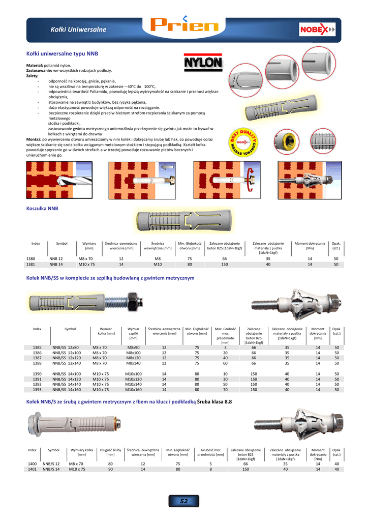 Kołki Uniwersalne Kołki uniwersalne typu NNB Materiał: poliamid nylon. Zastosowanie: we wszystkich rodzajach podłoży. Zalety: odporność na korozję, gnicie, pękanie, nie są wrażliwe na temperaturę w zakresie – 40°C do 100°C, odpowiednia twardość Poliamidu, powoduję lepszą wytrzymałość na ściskanie i przenosi większe obciążenia, stosowanie na zewnątrz budynków, bez ryzyka pękania, duża elastyczność powoduje większą odporność na rozciąganie. bezpieczne rozpieranie dzięki przeciw bieżnym strefom rozpierania ściskanym za pomocą metalowego stożka i podkładki, zastosowanie gwintu metrycznego uniemożliwia przekręcenie się gwintu jak może to bywać w kołkach z wkrętami do drewna Montaż: po wywierceniu otworu umieszczamy w nim kołek i dokręcamy śrubę lub hak, co powoduje coraz większe ściskanie się czoła kołka wciąganym metalowym stożkiem i stopującą podkładką. Kształt kołka powoduje spęczanie go w dwóch strefach a w trzeciej powoduje rozsuwanie płatów bocznych i unieruchomienie go. Koszulka NNB Index 1380 1381 Symbol Wymiary [mm] NNB 12 NNB 14 Średnica -zewnętrzna wiercenia [mm] Średnica wewnętrzna [mm] Min. Głębokość otworu [mm] Zalecane obciążenie beton B25 [1daN=1kgf) Zalecane obciążenie materiały z pustka [1daN=1kgf) Moment dokręcania [Nm] Opak. (szt.) 12 14 M8 M10 75 80 66 150 35 40 14 14 50 50 M8 x 70 M10 x 75 Kołek NNB/SS w komplecie ze szpilką budowlaną z gwintem metrycznym Index Symbol Wymiar kołka [mm] Wymiar szpilki [mm] Średnica -zewnętrzna wiercenia [mm] Min. Głębokość otworu [mm] 1385 1386 1387 1388 NNB/SS NNB/SS NNB/SS NNB/SS 12x80 12x100 12x120 12x140 M8 x 70 M8 x 70 M8 x 70 M8 x 70 M8x90 M8x100 M8x120 M8x140 12 12 12 12 75 75 75 75 1390 1391 1392 1393 NNB/SS NNB/SS NNB/SS NNB/SS 14x100 14x120 14x140 14x160 M10 x 75 M10 x 75 M10 x 75 M10 x 75 M10x100 M10x120 M10x140 M10x160 14 14 14 14 80 80 80 80 Max. Grubość moc przedmiotu [mm] Zalecane obciążenie beton B25 [1daN=1kgf) Zalecane obciążenie materiały z pustka [1daN=1kgf) Moment dokręcania [Nm] Opak. (szt.) 66 66 66 66 35 35 35 35 14 14 14 14 50 50 50 50 10 30 50 70 150 150 150 150 40 40 40 40 14 14 14 14 50 50 50 50 Moment dokręcania [Nm] Opak. (szt.) 3 20 40 60 Kołek NNB/S ze śrubą z gwintem metrycznym z łbem na klucz i podkładką Śruba klasa 8.8 Index Symbol 1400 1401 NNB/S 12 NNB/S 14 Wymiary kołka [mm] M8 x 70 M10 x 75 Długość śruby [mm] Średnica -zewnętrzna wiercenia [mm] Min. Głębokość otworu [mm] Grubość moc przedmiotu [mm] 80 90 12 14 75 80 5 8 52 Zalecane obciążenie beton B25 [1daN=1kgf) 66 150 Zalecane obciążenie materiały z pustka [1daN=1kgf) 35 40 14 14 40 40