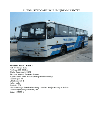 AUTOBUSY PODMIEJSKIE I MIĘDZYMIASTOWE MI DZYMIASTOWE Autosana A1010T Lider 2 Rok produkcji: 2002 Przebieg: 610 000 km Silnik: Cummins 250KM Skrzynia biegów: Eaton 6-biegowa biegowa Wyposażenie: enie: ABS, ASR,wspomaganie kierownicy, Ilość miejsc: 75 Układ drzwi: 1-2 Kolor: biały Spalanie: 23l Inne informacje: Stan bardzo dobry ,Autobus ,Autobu zarejestrowany w Polsce Ilość dostępnych pnych egzemplarzy: 15 Cena: 100 000 zł KAROSA Andere Axer LC 956 Rok produkcji: 2002 Przebieg: 780 000 km Silnik: Iveco Euro-3 Skrzynia biegów: manualna 5-biegowa biegowa Wyposażenie: enie: ABS, wspomaganie kierownicy, klimatyzacja Ilość miejsc: 51 Układ drzwi: 1-1 Kolor: biały Spalanie: 28l Inne informacje: Stan bardzo dobry bry ,Autobus zarejestrowany w Polsce Ilość dostępnych pnych egzemplarzy: 12 Cena: 90 000 zł Autosan 0909L TRAMP Rok produkcji: 2006 Przebieg: 400 000 km Silnik: Cummins 215KM Euro 3 Skrzynia biegów: manualna 5-biegowa biegowa Wyposażenie: enie: ABS, ASR, wspomaganie kierownicy, ogrzewanie postojowe Ilość miejsc siedzących/ogółem: cych/ogółem: 39/51 Układ drzwi: 1-0-1 Ilość stopni przy drzwiach: 3-3 Kolor: biały Spalanie: 18l Inne informacje: Stan bardzo dobry. Autobus zarejestrowany w Polsce. Miejsce postoju - Warszawa Ilość dostępnych egzemplarzy: 8 Cena: 160 000 zł Autosan H10-11 Rok produkcji: 1995 Przebieg: 700 000 km Wyposażenie: wspomaganie kierownicy, ogrzewanie postojowe Ilość miejsc siedzących/ogółem: cych/ogółem: 51/65 Układ drzwi: 1-0-1 Ilość stopni przy drzwiach: 3-3 Kolor: biało-niebieski Spalanie: 22l Inne informacje: Stan dobry. Autobus zarejestrowany w Polsce. Miejsce postoju - Warszawa Ilość dostępnych pnych egzemplarzy: 10 Cena: 25 000 zł Autosan H9-21 Rok produkcji: 1997 Przebieg: 800 000 km Wyposażenie: wspomaganie kierownicy, ogrzewanie postojowe Ilość miejsc siedzących/ogółem: cych/ogółem: 39/51 Układ drzwi: 1-0-1 Ilość stopni przy drzwiach: 3-3 Kolor: biało-niebieski Spalanie: 19l Inne informacje: Stan dobry. Autobus zarejestrowany w Polsce. Miejsce postoju - Warszawa Ilość dostępnych pnych egzemplarzy: 10 Cena: 10 000 zł Setra 315UL Rok produkcji: 1996-1999 Przebieg: 350 000 – 550 000 km Wyposażenie: ABS, ASR, wspomaganie kierownicy, ogrzewanie postojowe, wyświetlacz przedni Ilość miejsc siedzących/ogółem: 51/71 Układ drzwi: 1-0-2 Ilość stopni przy drzwiach: 3-3 Kolor: biały Spalanie: 27l Inne informacje: Stan bardzo dobry. Autobus zarejestrowany w Polsce. Miejsce postoju – Warszawa. Autobusy pochodzą z armii niemieckiej, bardzo mało używane, po wymianie tapicerki. Ilość dostępnych egzemplarzy: 5 sztuk z 1996 roku, 5 sztuk z 1997 roku, 7 sztuk z 1998 roku, 3 sztuki z 1999 roku. Cena: rocznik 1996 - 80 000 zł; 1997 – 85 000 zł; 1998 – 92 000 zł; 1999 – 98 000 zł Setra 215UL Rok produkcji: 1995 Przebieg: 350 000 – 450 000 km Wyposażenie: ABS, ASR, wspomaganie kierownicy, ogrzewanie postojowe, wyświetlacz przedni Ilość miejsc siedzących/ogółem: 51/80 Układ drzwi: 1-0-2 Ilość stopni przy drzwiach: 3-3 Kolor: biały Spalanie: 27l Inne informacje: Stan bardzo dobry. Autobus zarejestrowany w Polsce. Miejsce postoju – Warszawa. Autobusy pochodzą z armii niemieckiej, bardzo mało używane, po wymianie tapicerki. Ilość dostępnych egzemplarzy: 10 sztuk Cena: 65 000 zł Mercedes-Benz O550 Integro Rok produkcji: 1998-2001 Przebieg: 550 000 – 700 000 km Wyposażenie: ABS, ASR, wspomaganie kierownicy, ogrzewanie postojowe, wyświetlacz przedni Ilość miejsc siedzących/ogółem: 51/67 Układ drzwi: 1-0-2 lub 1-0-1 Ilość stopni przy drzwiach: 3-3 Kolor: biały Spalanie: 27l Inne informacje: Stan bardzo dobry. Autobus zarejestrowany w Polsce. Miejsce postoju – Warszawa. Autobusy pochodzą z Niemiec, bardzo mało używane, po wymianie tapicerki. Ilość dostępnych egzemplarzy: 4 sztuki z 1998 roku, 5 sztuk z 1999 roku, 3 sztuki z 2000 roku, 2 sztuki z 2001 roku. Cena: rocznik 1998 - 90 000 zł; 1999 – 97 000 zł; 2000 – 105 000 zł; 2001 – 115 000 zł Mercedes-Benz O350 Tourismo Rok produkcji: 1998 Przebieg: 700 000 km Wyposażenie: ABS, ASR, wspomaganie kierownicy, ogrzewanie postojowe, wyświetlacz przedni Ilość miejsc siedzących/ogółem: 51/51 Układ drzwi: 1-0-1 Ilość stopni przy drzwiach: 3-3 Kolor: biały Spalanie: 25l Inne informacje: Stan bardzo dobry. Autobus zarejestrowany w Polsce. Miejsce postoju – Warszawa. Ilość dostępnych egzemplarzy: 4 sztuki Cena: 130 000 zł Setra 315 GT-HD Rok produkcji: 1999 Przebieg: 693 000 km Wyposażenie: ABS, ASR, wspomaganie kierownicy, ogrzewanie postojowe, wyświetlacz przedni Ilość miejsc siedzących/ogółem: 51/51 Układ drzwi: 1-0-1 Ilość stopni przy drzwiach: 3-3 Kolor: biały Spalanie: 26l Inne informacje: Stan bardzo dobry. Autobus zarejestrowany w Polsce. Miejsce postoju – Warszawa. Ilość dostępnych egzemplarzy: 3 sztuki Cena: 155 000 zł Scania Irizar Century Rok produkcji: 2001 Przebieg: 751 300 km Wyposażenie: ABS, ASR, wspomaganie kierownicy, ogrzewanie postojowe, wyświetlacz przedni Ilość miejsc siedzących/ogółem: 51/51 Układ drzwi: 1-0-1 Ilość stopni przy drzwiach: 3-3 Kolor: biały Spalanie: 25l Inne informacje: Stan bardzo dobry. Autobus zarejestrowany w Polsce. Miejsce postoju – Warszawa. Ilość dostępnych egzemplarzy: 2 sztuki Cena: 190 000 zł