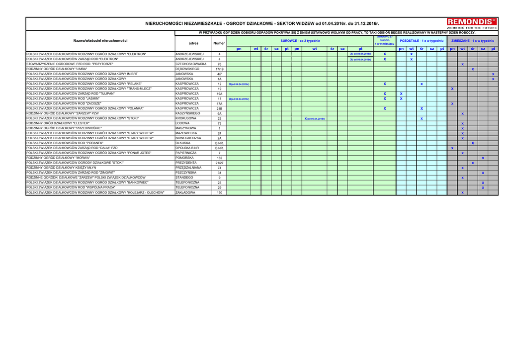 NIERUCHOMOŚCI NIEZAMIESZKAŁE - OGRODY DZIAŁKOWE - SEKTOR WIDZEW od 01.04.2016r. do 31.12.2016r. W PRZYPADKU GDY DZIEŃ ODBIORU ODPADÓW POKRYWA SIĘ Z DNIEM USTAWOWO WOLNYM OD PRACY, TO TAKI ODBIÓR BĘDZIE REALIZOWANY W NASTĘPNY DZIEŃ ROBOCZY. Nazwa/właścciel nieruchomości adres SUROWCEIGLOO1 x w miesiącu SUROWCE - co 2 tygodnie Numer pn wt śr cz pt pn wt śr cz pt 4 x( od 08.04.2016r) ANDRZEJEWSKIEJ 4 x( od 08.04.2016r) CZECHOSŁOWACKA 76 POLSKI ZWIĄZEK DZIAŁKOWCÓW RODZINNY OGRÓD DZIAŁKOWY "ELEKTRON" ANDRZEJEWSKIEJ POLSKI ZWIĄZEK DZIAŁKOWCÓW ZARZĄD ROD "ELEKTRON" STOWARZYSZENIE OGRODOWE PZD ROD. "PRZYTORZE" RODZINNY OGRÓD DZIAŁKOWY "LIMBA" DĘBOWSKIEGO POLSKI ZWIĄZEK DZIAŁKOWCÓW RODZINNY OGRÓD DZIAŁKOWY IM.BRT JANOWSKA 4/7 POLSKI ZWIĄZEK DZIAŁKOWCÓW RODZINNY OGRÓD DZIAŁKOWY JANOWSKA 1A POLSKI ZWIĄZEK DZIAŁKOWCÓW RODZINNY OGRÓD DZIAŁKOWY "RELAKS" KASPROWICZA 12 POLSKI ZWIĄZEK DZIAŁKOWCÓW RODZINNY OGRÓD DZIAŁKOWY "TRANS-MLECZ" KASPROWICZA 19 POLSKI ZWIĄZEK DZIAŁKOWCÓW ZARZĄD ROD "TULIPAN" KASPROWICZA 19A POLSKI ZWIĄZEK DZIAŁKOWCÓW ROD "JAŚMIN" KASPROWICZA 17 POLSKI ZWIĄZEK DZIAŁKOWCÓW ROD "ZACISZE" KASPROWICZA 17A POLSKI ZWIĄZEK DZIAŁKOWCÓW RODZINNY OGRÓD DZIAŁKOWY 'POLANKA" KASPROWICZA 21B RODZINNY OGRÓD DZIAŁKOWY "ZARZEW" PZW KASZYŃSKIEGO 6A POLSKI ZWIĄZEK DZIAŁKOWCÓW RODZINNY OGRÓD DZIAŁKOWY "STOKI" KROKUSOWA 23 RODZINNY ORÓD DZIAŁKOWY "ELESTER" LODOWA 73 RODZINNY OGRÓD DZIAŁKOWY "PRZEDWIOŚNIE" MASZYNOWA 1 POLSKI ZWIĄZEK DZIAŁKOWCÓW RODZINNY OGRÓD DZIAŁKOWY "STARY WIDZEW" MAZOWIECKA 24 POLSKI ZWIĄZEK DZIAŁKOWCÓW RODZINNY OGRÓD DZIAŁKOWY "STARY WIDZEW" NOWOGRODZKA 2A POZOSTAŁE - 1 x w tygodniu pn X X wt x x śr cz pt ZMIESZANE - 1 x w tygodniu pn wt OLKUSKA B.NR. POLSKI ZWIĄZEK DZIAŁKOWCÓW ZARZĄD ROD "DALIA" PZD OPOLSKA B.NR B.NR. POLSKI ZWIĄZEK DZIAŁKOWCÓW RODZINNY OGRÓD DZIAŁKOWY "PONAR JOTES" PAPIERNICZA RODZINNY OGRÓD DZIAŁKOWY "MORWA" POMORSKA POLSKI ZWIĄZEK DZIAŁKOWCÓW OGRODY DZIAŁKOWE "STOKI" PREZYDENTA RODZINNY OGRÓD DZIAŁKOWY KSIĘŻY MŁYN PRZĘDZALNIANA 74 POLSKI ZWIĄZEK DZIAŁKOWCÓW ZARZĄD ROD "ZIMOWIT" PSZCZYŃSKA 31 RODZINNE GORÓDKI DZIAŁKOWE "ZARZEW" POLSKI ZWIĄZEK DZIAŁKOWCÓW STANDEGO 9 POLSKI ZWIĄZEK DZIAŁKOWCÓW RODZINNY OGRÓD DZIAŁKOWY "BANKOWIEC" TELEFONICZNA 23 POLSKI ZWIĄZEK DZIAŁKOWCÓW ROD "WSPÓLNA PRACA" TELEFONICZNA 29 POLSKI ZWIĄZEK DZIAŁKOWCÓW RODZINNY OGRÓD DZIAŁKOWY "KOLEJARZ - OLECHÓW" ZAKŁADOWA 150 7 cz pt x x 17/19 POLSKI ZWIĄZEK DZIAŁKOWCÓW ROD "PORANEK" śr x x x(od 04.04.2016r) X x(od 04.04.2016r) X X x X X X X X X x x(od 05.04.2016r) x x x x x X x x x 182 x 21/27 x x x x x x