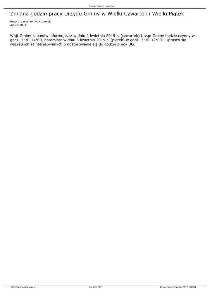 Strona Gminy Łapanów Zmiana godzin pracy Urzędu Gminy w Wielki Czwartek i Wielki Piątek Autor: Jarosław Nowojowski 30.03.2015. Wójt Gminy Łapanów informuje, iż w dniu 2 kwietnia 2015 r. (czwartek) Urząd Gminy będzie czynny w godz. 7:30-14:00, natomiast w dniu 3 kwietnia 2015 r. (piątek) w godz. 7:30-12:00. Uprasza się wszystkich zainteresowanych o dostosowanie się do godzin pracy UG. http://www.lapanow.pl Kreator PDF Utworzono 4 March, 2017, 07:58