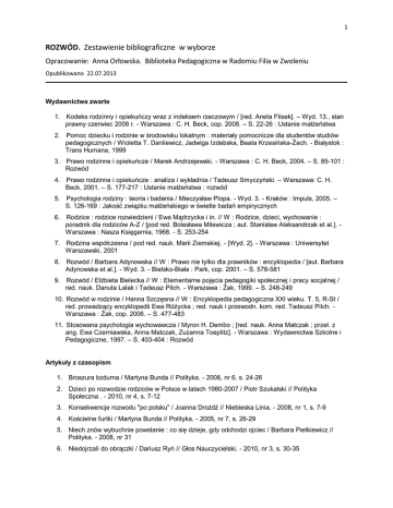 1 ROZWÓD. Zestawienie bibliograficzne w wyborze Opracowanie: Anna Orłowska. Biblioteka Pedagogiczna w Radomiu Filia w Zwoleniu Opublikowano 22.07.2013 Wydawnictwa zwarte 1. Kodeks rodzinny i opiekuńczy wraz z indeksem rzeczowym / [red. Aneta Flisek]. – Wyd. 13., stan prawny czerwiec 2008 r. - Warszawa : C. H. Beck, cop. 2008. – S. 22-26 : Ustanie małżeństwa 2. Pomoc dziecku i rodzinie w środowisku lokalnym : materiały pomocnicze dla studentów studiów pedagogicznych / Wioletta T. Danilewicz, Jadwiga Izdebska, Beata Krzesińska-Żach. - Białystok : Trans Humana, 1999 3. Prawo rodzinne i opiekuńcze / Marek Andrzejewski. - Warszawa : C. H. Beck, 2004. – S. 85-101 : Rozwód 4. Prawo rodzinne i opiekuńcze : analiza i wykładnia / Tadeusz Smyczyński. – Warszawa: C. H. Beck, 2001. – S. 177-217 : Ustanie małżeństwa : rozwód 5. Psychologia rodziny : teoria i badania / Mieczysław Plopa. - Wyd. 3. - Kraków : Impuls, 2005. – S. 126-169 : Jakość związku małżeńskiego w świetle badań empirycznych 6. Rodzice : rodzice rozwiedzieni / Ewa Mądrzycka i in. // W : Rodzice, dzieci, wychowanie : poradnik dla rodziców A-Z / [pod red. Bolesława Milewicza ; aut. Stanisław Aleksandrzak et al.]. Warszawa : Nasza Księgarnia, 1968. - S. 253-254 7. Rodzina współczesna / pod red. nauk. Marii Ziemskiej. - [Wyd. 2]. - Warszawa : Uniwersytet Warszawski, 2001 8. Rozwód / Barbara Adynowska // W : Prawo nie tylko dla prawników : encyklopedia / [aut. Barbara Adynowska et al.]. - Wyd. 3. - Bielsko-Biała : Park, cop. 2001. – S. 578-581 9. Rozwód / Elżbieta Bielecka // W : Elementarne pojęcia pedagogiki społecznej i pracy socjalnej / red. nauk. Danuta Lalak i Tadeusz Pilch. - Warszawa : Żak, 1999. – S. 248-249 10. Rozwód w rodzinie / Hanna Szczęsna // W : Encyklopedia pedagogiczna XXI wieku. T. 5, R-St / red. prowadzący encyklopedii Ewa Różycka ; red. nauk i przewodn. kom. red. Tadeusz Pilch. Warszawa : Żak, cop. 2006. – S. 477-483 11. Stosowana psychologia wychowawcza / Myron H. Dembo ; [red. nauk. Anna Matczak ; przeł. z ang. Ewa Czerniawska, Anna Matczak, Zuzanna Toeplitz]. - Warszawa : Wydawnictwa Szkolne i Pedagogiczne, 1997. – S. 403-404 : Rozwód Artykuły z czasopism 1. Broszura bzdurna / Martyna Bunda // Polityka. - 2008, nr 6, s. 24-26 2. Dzieci po rozwodzie rodziców w Polsce w latach 1980-2007 / Piotr Szukalski // Polityka Społeczna . - 2010, nr 4, s. 7-12 3. Konsekwencje rozwodu "po polsku" / Joanna Drożdż // Niebieska Linia. - 2008, nr 1, s. 7-9 4. Kościelne furtki / Martyna Bunda // Polityka. - 2005, nr 7, s. 26-29 5. Niech znów wybuchnie powstanie : co się dzieje, gdy odchodzi ojciec / Barbara Pietkiewicz // Polityka. - 2008, nr 31 6. Niedojrzali do obrączki / Dariusz Ryń // Głos Nauczycielski. - 2010, nr 3, s. 30-35 2 7. Perspektywa psychologiczna dziecka w sytuacji okołorozwodowej : zwróćcie na mnie uwagę! / Ewa Kiliszek // Niebieska Linia. - 2009, nr 4, s. 18-21 8. Rodzice się rozwodzą / Aleksandra Denst-Sadura // Głos Nauczycielski. - 2011, nr 31, s. 16 9. Rozdarte dzieci rozwodników / Joanna Cieśla // Polityka . - 2012, nr 16, s. 32-34 10. Rozwody małżeństw młodocianych / Urszula Kempińska // Problemy OpiekuńczoWychowawcze. - 2010, nr 10 s. 23-28 11. Rozwód - jak pomóc? / Kinga Kuszak // Życie Szkoły. - 2009, nr 3, s. 38-42 12. Z dzieckiem nie można się rozwieść / Dorota Ziółkowska-Maciaszek // Świat Problemów. - 2010, nr 9, s. 21-25 13. Zanim dojdzie do rozwodu / Dorota Ziółkowska-Maciaszek // Świat Problemów. - 2010, nr 6, s. 27-30 14. Zespół Gardnera sposobem radzenia sobie z konfliktem rodziców / Izabela Owczaruk // Problemy Opiekuńczo-Wychowawcze. - 2008, nr 7, s. 12-17 15. Życie po życiu / Barbara Pietkiewicz // Polityka. - 2006, nr 34, s. 66-69