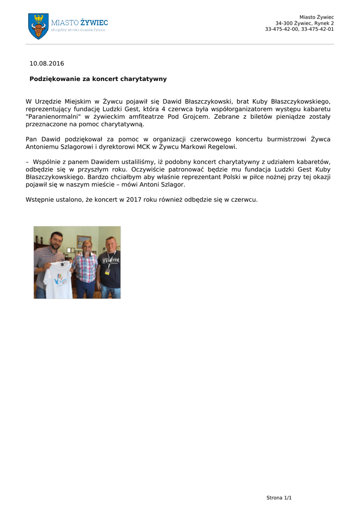 Miasto Żywiec 34-300 Żywiec, Rynek 2 33-475-42-00, 33-475-42-01 10.08.2016 Podziękowanie za koncert charytatywny W Urzędzie Miejskim w Żywcu pojawił się Dawid Błaszczykowski, brat Kuby Błaszczykowskiego, reprezentujący fundację Ludzki Gest, która 4 czerwca była współorganizatorem występu kabaretu "Paranienormalni" w żywieckim amfiteatrze Pod Grojcem. Zebrane z biletów pieniądze zostały przeznaczone na pomoc charytatywną. Pan Dawid podziękował za pomoc w organizacji czerwcowego koncertu burmistrzowi Żywca Antoniemu Szlagorowi i dyrektorowi MCK w Żywcu Markowi Regelowi. – Wspólnie z panem Dawidem ustaliliśmy, iż podobny koncert charytatywny z udziałem kabaretów, odbędzie się w przyszłym roku. Oczywiście patronować będzie mu fundacja Ludzki Gest Kuby Błaszczykowskiego. Bardzo chciałbym aby właśnie reprezentant Polski w piłce nożnej przy tej okazji pojawił się w naszym mieście – mówi Antoni Szlagor. Wstępnie ustalono, że koncert w 2017 roku również odbędzie się w czerwcu. Strona 1/1 Powered by TCPDF (www.tcpdf.org)