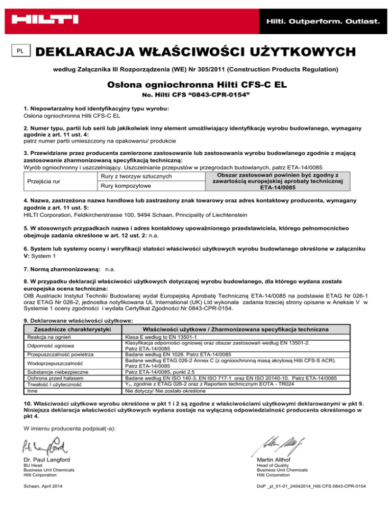 PL DEKLARACJA WŁAŚCIWOŚCI UŻYTKOWYCH według Załącznika III Rozporządzenia (WE) Nr 305/2011 (Construction Products Regulation) Osłona ogniochronna Hilti CFS-C EL No. Hilti CFS “0843-CPR-0154” 1. Niepowtarzalny kod identyfikacyjny typu wyrobu: Osłona ogniochronna Hilti CFS-C EL 2. Numer typu, partii lub serii lub jakikolwiek inny element umożliwiający identyfikację wyrobu budowlanego, wymagany zgodnie z art. 11 ust. 4: patrz numer partii umieszczony na opakowaniu/ produkcie 3. Przewidziane przez producenta zamierzone zastosowanie lub zastosowania wyrobu budowlanego zgodnie z mającą zastosowanie zharmonizowaną specyfikacją techniczną: Wyrób ogniochronny i uszczelniający. Uszczelnianie przepustów w przegrodach budowlanych, patrz ETA-14/0085 Obszar zastosowań powinien być zgodny z Rury z tworzyw sztucznych zawartością europejskiej aprobaty technicznej Przejścia rur Rury kompozytowe ETA-14/0085 4. Nazwa, zastrzeżona nazwa handlowa lub zastrzeżony znak towarowy oraz adres kontaktowy producenta, wymagany zgodnie z art. 11 ust. 5: HILTI Corporation, Feldkircherstrasse 100, 9494 Schaan, Principality of Liechtenstein 5. W stosownych przypadkach nazwa i adres kontaktowy upoważnionego przedstawiciela, którego pełnomocnictwo obejmuje zadania określone w art. 12 ust. 2: n.a. 6. System lub systemy oceny i weryfikacji stałości właściwości użytkowych wyrobu budowlanego określone w załączniku V: System 1 7. Normą zharmonizowaną: n.a. 8. W przypadku deklaracji właściwości użytkowych dotyczącej wyrobu budowlanego, dla którego wydana została europejska ocena techniczna: OIB Austriacki Instytut Techniki Budowlanej wydał Europejską Aprobatę Techniczną ETA-14/0085 na podstawie ETAG Nr 026-1 oraz ETAG Nr 026-2, jednostka notyfikowana UL International (UK) Ltd wykonała zadania trzeciej strony opisane w Aneksie V w Systemie 1 oceny zgodności i wydała Certyfikat Zgodności Nr 0843-CPR-0154. 9. Deklarowane właściwości użytkowe: Zasadnicze charakterystyki Reakcja na ognień Odporność ogniowa Przepuszczalność powietrza Wodoprzepuszczalność Substancje niebezpieczne Ochrona przed hałasem Trwałość I użyteczność Inne Właściwości użytkowe / Zharmonizowana specyfikacja techniczna Klasa E według to EN 13501-1 Klasyfikacja odporności ogniowej oraz obszar zastosowań według EN 13501-2. Patrz ETA-14/0085 Badane według EN 1026. Patrz ETA-14/0085 Badane według ETAG 026-2 Annex C (z ognioochronną masą akrylową Hilti CFS-S ACR). Patrz ETA-14/0085 Patrz ETA-14/0085, punkt 2.5 Badane według EN ISO 140-3, EN ISO 717-1 oraz EN ISO 20140-10. Patrz ETA-14/0085 Y2, zgodnie z ETAG 026-2 oraz z Raportem technicznym EOTA - TR024 Nie dotyczy/ Nie zostało określone 10. Właściwości użytkowe wyrobu określone w pkt 1 i 2 są zgodne z właściwościami użytkowymi deklarowanymi w pkt 9. Niniejsza deklaracja właściwości użytkowych wydana zostaje na wyłączną odpowiedzialność producenta określonego w pkt 4. W imieniu producenta podpisał(-a): Dr. Paul Langford Martin Althof BU Head Business Unit Chemicals Hilti Corporation Head of Quality Business Unit Chemicals Hilti Corporation Schaan, April 2014 DoP _pl_01-01_24042014_Hilti CFS 0843-CPR-0154