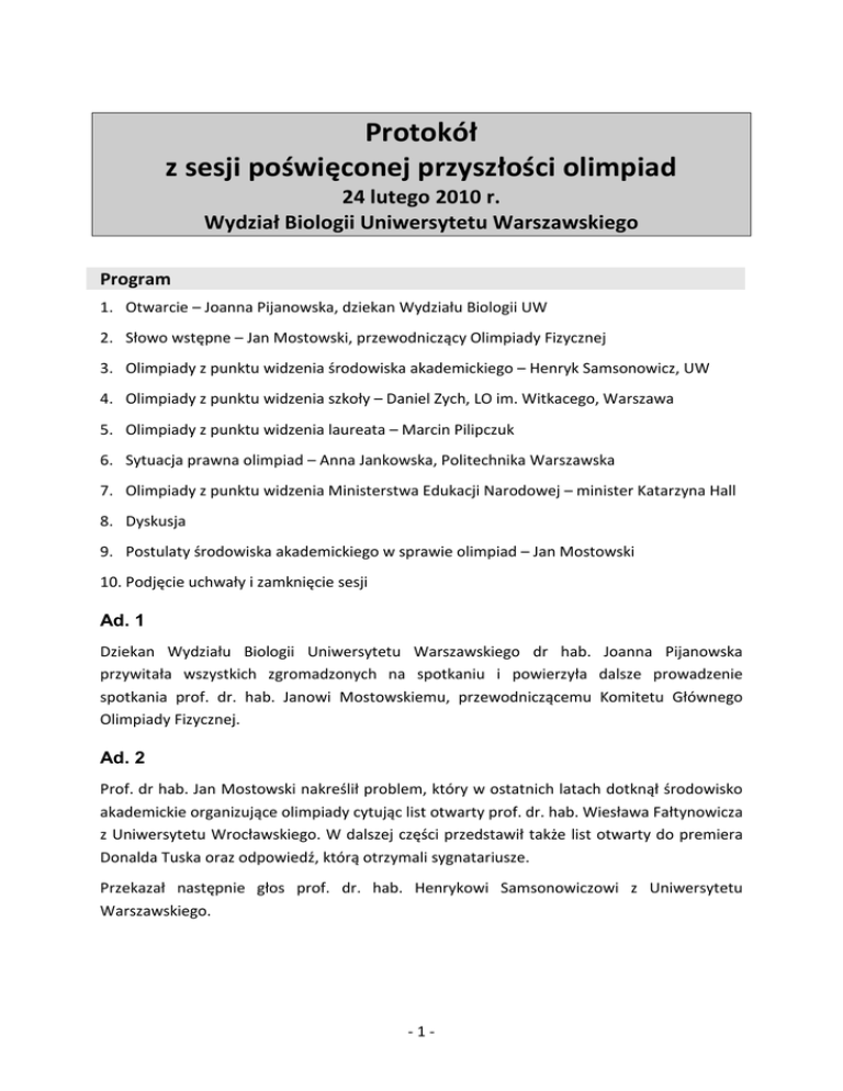 Protokół z sesji poświęconej przyszłości olimpiad 24 lutego 2010 r. Wydział Biologii Uniwersytetu Warszawskiego Program 1. Otwarcie – Joanna Pijanowska, dziekan Wydziału Biologii UW 2. Słowo wstępne – Jan Mostowski, przewodniczący Olimpiady Fizycznej 3. Olimpiady z punktu widzenia środowiska akademickiego – Henryk Samsonowicz, UW 4. Olimpiady z punktu widzenia szkoły – Daniel Zych, LO im. Witkacego, Warszawa 5. Olimpiady z punktu widzenia laureata – Marcin Pilipczuk 6. Sytuacja prawna olimpiad – Anna Jankowska, Politechnika Warszawska 7. Olimpiady z punktu widzenia Ministerstwa Edukacji Narodowej – minister Katarzyna Hall 8. Dyskusja 9. Postulaty środowiska akademickiego w sprawie olimpiad – Jan Mostowski 10. Podjęcie uchwały i zamknięcie sesji Ad. 1 Dziekan Wydziału Biologii Uniwersytetu Warszawskiego dr hab. Joanna Pijanowska przywitała wszystkich zgromadzonych na spotkaniu i powierzyła dalsze prowadzenie spotkania prof. dr. hab. Janowi Mostowskiemu, przewodniczącemu Komitetu Głównego Olimpiady Fizycznej. Ad. 2 Prof. dr hab. Jan Mostowski nakreślił problem, który w ostatnich latach dotknął środowisko akademickie organizujące olimpiady cytując list otwarty prof. dr. hab. Wiesława Fałtynowicza z Uniwersytetu Wrocławskiego. W dalszej części przedstawił także list otwarty do premiera Donalda Tuska oraz odpowiedź, którą otrzymali sygnatariusze. Przekazał następnie głos prof. dr. hab. Henrykowi Samsonowiczowi z Uniwersytetu Warszawskiego. -1- Ad. 3 Prof. dr hab. Henryk Samsonowicz przedstawił stosunek środowiska akademickiego do organizacji olimpiad. Podkreślił, że olimpiada może być narzędziem, które pozwoli przezwyciężyć słabości, z którymi borykają się szkoły mające obowiązek kształcić wszystkich uczniów, nie tylko tych najzdolniejszych. Prof. Samsonowicz zwrócił uwagę, że dzięki olimpiadom uczniowie pogłębiają wiedzę, którą później wykorzystują na dalszych etapach swojej edukacji. Jednocześnie podkreślił, że olimpiady pozwalają przełamywać utrwalone schematy w nauczaniu szkolnym i umożliwiają rozszerzanie horyzontów uczniów, którzy decydują się na udział w olimpiadach. Prof. Samsonowicz zwrócił uwagę również na wpływ olimpiad na nauczycieli. Proces przygotowywania do olimpiady dotyczy nie tylko ucznia, ale także nauczyciela, który przy tej okazji nabywa doświadczenie, a często również zdobywa wiedzę. Odnosząc się do finansowania olimpiad prof. Samsonowicz stwierdził, że rozdziałem środków finansowych powinny zajmować się towarzystwa naukowe organizujące olimpiady. Ad. 4 Pan Daniel Zych z Liceum Ogólnokształcącego im. Witkiewicza w Warszawie przedstawił zalety olimpiad z punktu widzenia nie tylko nauczyciela, ale także uczestnika. Nawiązując do swoich doświadczeń z czasów szkolnych podkreślił, że olimpiady dają szansę uczniom z mniejszych miejscowości. Są także doskonałą formą mobilizowania uczniów do samodzielnej pracy. Pan Zych stwierdził, że teraz, jako nauczyciel, spłaca swój dług wobec olimpiady, dzięki której rozwinął swoje zainteresowania. Pan Zych podkreślił, że przygotowując się razem z uczniami do olimpiady, nauczyciele także uczą się wiele. Z drugiej strony, jeśli nawet uczeń nie odniesie sukcesu na olimpiadzie, zyskuje cenne doświadczenie samodzielnej pracy, które przydaje się w późniejszych etapach edukacji i pracy. Zauważył również, że wśród organizatorów jest wielu laureatów olimpiad. Pan Zych stwierdził, że wieloletnie doświadczenie obecnych komitetów w organizacji olimpiad powinno być gwarancją ich odpowiedniego poziomu merytorycznego. Z tego powodu wymaganie od komitetów poddawania się pełnej procedurze konkursowej i udowadniania kompetencji do organizacji olimpiad wydaje się zbędne. Nawiązując do Olimpiady Literatury i Języka Polskiego zwrócił uwagę, że pełni ona także istotną rolę w kontaktach ze środowiskiem Polaków w państwach zza wschodniej granicy. Ad. 5 Pan Marcin Pilipczuk odniósł się do olimpiad z punktu widzenia wielokrotnego laureata olimpiad; matematycznej, informatycznej i fizycznej. Zwrócił uwagę, że w szkole nie zawsze jest odpowiednia konkurencja. W wieku licealnym, szczególnie dla uzdolnionych uczniów, ważnym czynnikiem motywującym do zdobywania wiedzy i umiejętności jest rywalizacja. Do -2- nauki zachęcać może także wspólne przygotowywanie się do olimpiad. Pan Pilipczuk dodał, że olimpiady są dobrze przygotowywane i przełamują szkolne schematy, dzięki czemu stanowią rzeczywiste wyzwanie intelektualne dla zdolnych uczniów. Ad. 6 Sytuację prawną olimpiad przedstawiła dr inż. Anna Jankowska z Politechniki Warszawskiej. W swojej wypowiedzi dr Jankowska przypomniała, że pierwsze problemy olimpiad pojawiły się już w 2002 r., gdy w nowym rozporządzeniu ministra nie było żadnego zapisu regulującego finansowanie olimpiad. Przypomniała, że w tym okresie Rada Główna Szkolnictwa Wyższego, na prośbę Ministerstwa Edukacji Narodowej, potwierdziła kompetencje organizacji wybranych do zorganizowania poszczególnych olimpiad, co było konieczne do wydania stosownych decyzji ministra. Dodała, że w nowej ustawie oświatowej z 2003 r. również nie ma regulacji dotyczących finansowania olimpiad. Odnosząc się do Olimpiady Wiedzy i Umiejętności Budowlanych dr Jenkowska zauważyła, że mimo wzrostu liczby uczniów i szkół biorących udział w olimpiadzie oraz wskaźników cen towarów i usług, wyraźnie zmniejsza się kwota dotacji MEN. Przedstawiła także dane, które pozwalają sądzić, że jeśli dotacja MEN wyniesie 30% całkowitych kosztów organizacji olimpiady, to 22% kwoty otrzymanej od sponsorów pokrywających pozostałe koszty organizacji odprowadzone do budżetu państwa w postaci VAT wraz z 15% średniego opodatkowania VAT wydatków poniesionych przy organizacji olimpiady będą równoważyć 