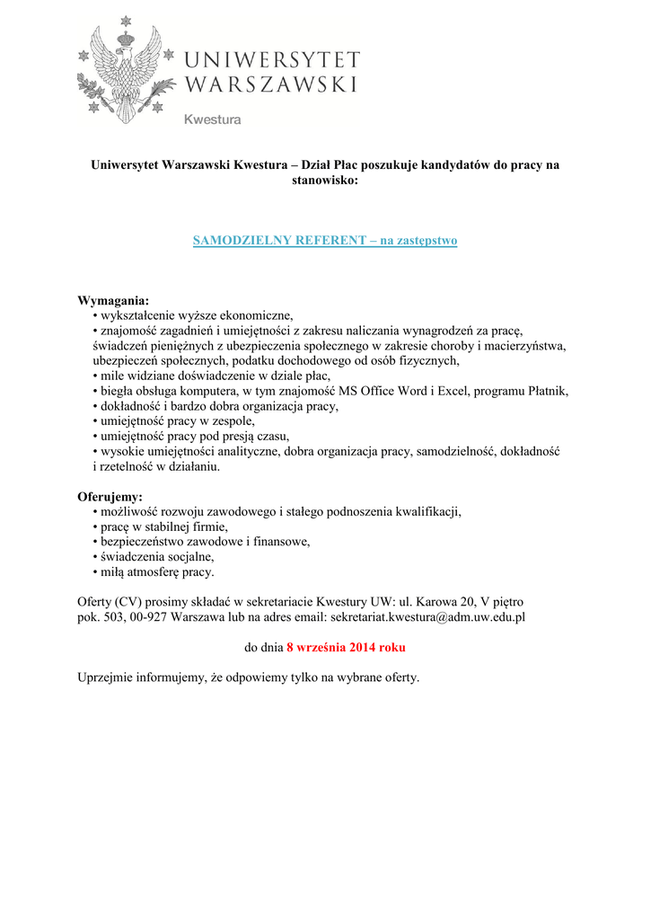 Uniwersytet Warszawski Kwestura – Dział Płac poszukuje kandydatów do pracy na stanowisko: SAMODZIELNY REFERENT – na zastępstwo Wymagania: • wykształcenie wyższe ekonomiczne, • znajomość zagadnień i umiejętności z zakresu naliczania wynagrodzeń za pracę, świadczeń pieniężnych z ubezpieczenia społecznego w zakresie choroby i macierzyństwa, ubezpieczeń społecznych, podatku dochodowego od osób fizycznych, • mile widziane doświadczenie w dziale płac, • biegła obsługa komputera, w tym znajomość MS Office Word i Excel, programu Płatnik, • dokładność i bardzo dobra organizacja pracy, • umiejętność pracy w zespole, • umiejętność pracy pod presją czasu, • wysokie umiejętności analityczne, dobra organizacja pracy, samodzielność, dokładność i rzetelność w działaniu. Oferujemy: • możliwość rozwoju zawodowego i stałego podnoszenia kwalifikacji, • pracę w stabilnej firmie, • bezpieczeństwo zawodowe i finansowe, • świadczenia socjalne, • miłą atmosferę pracy. Oferty (CV) prosimy składać w sekretariacie Kwestury UW: ul. Karowa 20, V piętro pok. 503, 00-927 Warszawa lub na adres email: [email protected] do dnia 8 września 2014 roku Uprzejmie informujemy, że odpowiemy tylko na wybrane oferty.