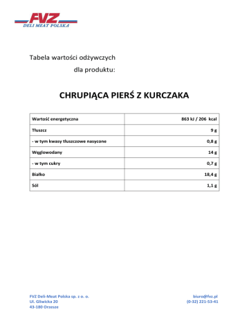 Tabela wartości odżywczych dla produktu: CHRUPIĄCA PIERŚ Z KURCZAKA Wartość energetyczna Tłuszcz 863 kJ / 206 kcal 9g - w tym kwasy tłuszczowe nasycone 0,8 g Węglowodany 14 g - w tym cukry 0,7 g Białko Sól FVZ Deli-Meat Polska sp. z o. o. Ul. Gliwicka 20 43-180 Orzesze 18,4 g 1,1 g [email protected] (0-32) 221-53-41