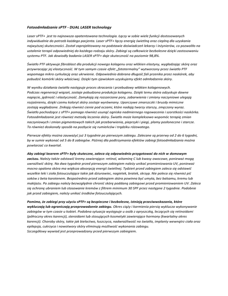 Fotoodmładzanie sPTF - DUAL LASER technology Laser sPTF+ jest to najnowsza opatentowana technologia. Łączy w sobie wiele funkcji dostosowanych indywidualnie do potrzeb każdego pacjenta. Laser sPTF+ łączy energię świetlną oraz cieplną dla uzyskania najwyższej skuteczności. Został zaprojektowany na podstawie doświadczeo lekarzy i inżynierów, co pozwoliło na ustalenie terapii odpowiedniej do każdego rodzaju skóry. Zabiegi są całkowicie bezbolesne dzięki zastosowaniu systemu PTF. Jak dowiodły badania LASER sPTF+ daje skutecznośd na poziomie 98,8%. Światło PTF aktywuje fibroblast dla produkcji nowego kolagenu oraz włókien elastyny, wygładzając skórę oraz przywracając jej elastycznośd. W tym samym czasie efekt „fototermalny” wytworzony przez światło PTF wspomaga mikro cyrkulację oraz ukrwienie. Odpowiednio dobrana długośd fali przenika przez naskórek, aby pobudzid komórki skóry właściwej. Dzięki tym zjawiskom uzyskujemy efekt odmłodzenia skóry. W wyniku działania światła następuje proces skracania i przebudowy włókien kolagenowych. Podczas regeneracji wiązao, zostaje pobudzona produkcja kolagenu. Dzięki temu skóra odzyskuje dawne napięcie, jędrnośd i elastycznośd. Zamykają się rozszerzone pory, zabarwienia i zmiany naczyniowe ulegają rozjaśnieniu, dzięki czemu koloryt skóry zostaje wyrównany. Uporczywe zmarszczki i bruzdy mimiczne zostają wygładzone. Znikają również cienie pod oczami, które nadają twarzy starszy, zmęczony wyraz. Światło pochodzące z sPTF+ pomaga również usunąd ogniska nadmiernego rogowacenia i szorstkości naskórka. Fotoodmładzanie jest również metodą leczenia skóry. Światło może kompleksowo wspomóc terapię zmian naczyniowych i zmian pigmentowych takich jak przebarwienia, pieprzyki i piegi, plamy posłoneczne i starcze. To również doskonały sposób na pozbycie się rumieoców i trądziku różowatego. Pierwsze efekty można zauważyd już 3 tygodnie po pierwszym zabiegu. Zalecane są przerwy od 2 do 6 tygodni, by w sumie wykonad od 5 do 8 zabiegów. Później dla podtrzymania efektów zabiegi fotoodmładzania można powtarzad co kwartał. Aby zabiegi laserem sPTF+ były skuteczne, zaleca się odpowiednio przygotowad do nich w domowym zaciszu. Należy także odstawid kremy zawierające: retinol, witaminę C lub kwasy owocowe, ponieważ mogą uwrażliwid skórę. Na dwa tygodnie przed pierwszym zabiegiem należy unikad promieniowania UV, ponieważ mocno opalona skóra ma większa absorpcję energii świetlnej. Tydzieo przed zabiegiem zaleca się odstawid wszelkie leki i zioła fotouczulające takie jak dziurawiec, nagietek, bratek, skrzyp. Nie poleca się również pid soków z beta karotenem. Bezpośrednio przed zabiegiem skóra powinna byd umyta, bez balsamu, kremu lub makijażu. Po zabiegu należy bezwzględnie chronid skórę poddaną zabiegowi przed promieniowaniem UV. Zaleca się ochronę ubraniem lub stosowanie kremów z filtrem minimum 30 SPF przez następne 2 tygodnie. Podobnie jak przed zabiegiem, należy unikad środków fotouczulających. Pomimo, że zabiegi przy użyciu sPTF+ są bezpieczne i bezbolesne, istnieją przeciwwskazania, które wykluczają lub ograniczają przeprowadzenie zabiegu. Okres ciąży i karmienia piersią wyklucza wykonywanie zabiegów w tym czasie u kobiet. Podobna sytuacja występuje u osób z opryszczką, leczących się retinoidami (półroczny okres karencji), steroidami lub stosujących kosmetyki zawierające hormony (kwartalny okres karencji). Choroby skóry, takie jak bielactwo, łuszczyca, nadwrażliwośd na światło, implanty wewnątrz ciała oraz epilepsja, cukrzyca i nowotwory skóry eliminują możliwośd wykonania zabiegu. Szczegółowy wywiad jest przeprowadzany przed pierwszym zabiegiem.