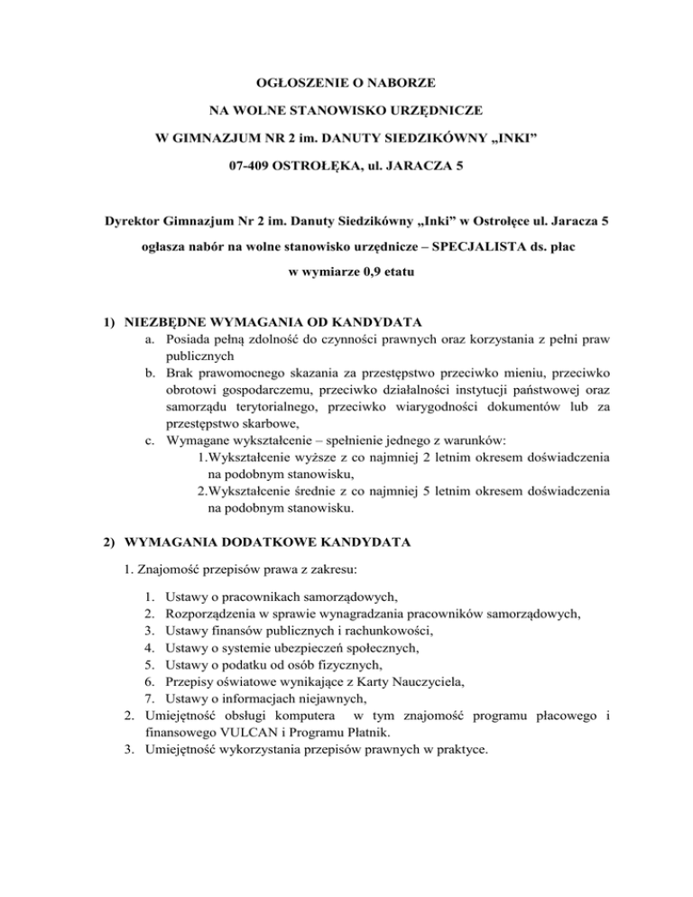 OGŁOSZENIE O NABORZE NA WOLNE STANOWISKO URZĘDNICZE W GIMNAZJUM NR 2 im. DANUTY SIEDZIKÓWNY „INKI” 07-409 OSTROŁĘKA, ul. JARACZA 5 Dyrektor Gimnazjum Nr 2 im. Danuty Siedzikówny „Inki” w Ostrołęce ul. Jaracza 5 ogłasza nabór na wolne stanowisko urzędnicze – SPECJALISTA ds. płac w wymiarze 0,9 etatu 1) NIEZBĘDNE WYMAGANIA OD KANDYDATA a. Posiada pełną zdolność do czynności prawnych oraz korzystania z pełni praw publicznych b. Brak prawomocnego skazania za przestępstwo przeciwko mieniu, przeciwko obrotowi gospodarczemu, przeciwko działalności instytucji państwowej oraz samorządu terytorialnego, przeciwko wiarygodności dokumentów lub za przestępstwo skarbowe, c. Wymagane wykształcenie – spełnienie jednego z warunków: 1.Wykształcenie wyższe z co najmniej 2 letnim okresem doświadczenia na podobnym stanowisku, 2.Wykształcenie średnie z co najmniej 5 letnim okresem doświadczenia na podobnym stanowisku. 2) WYMAGANIA DODATKOWE KANDYDATA 1. Znajomość przepisów prawa z zakresu: 1. Ustawy o pracownikach samorządowych, 2. Rozporządzenia w sprawie wynagradzania pracowników samorządowych, 3. Ustawy finansów publicznych i rachunkowości, 4. Ustawy o systemie ubezpieczeń społecznych, 5. Ustawy o podatku od osób fizycznych, 6. Przepisy oświatowe wynikające z Karty Nauczyciela, 7. Ustawy o informacjach niejawnych, 2. Umiejętność obsługi komputera w tym znajomość programu płacowego i finansowego VULCAN i Programu Płatnik. 3. Umiejętność wykorzystania przepisów prawnych w praktyce. 3) ZAKRES WYKONYWANYCH ZADAŃ NA STANOWISKU: 1) Sporządzanie list płac dla pracowników oraz osób zatrudnionych na podstawie umowy zlecenia lub umowy o dzieło zgodnie z obowiązującymi przepisami, 2) Prowadzenie imiennych kart wynagrodzeń. 3) Prawidłowe i terminowe naliczanie zobowiązań wobec Urzędu Skarbowego 4) Właściwe i terminowe naliczanie składek na ubezpieczenia społeczne i rozliczenie z ZUS 5) Prowadzenie dokumentacji związanej z wypłatą zasiłków z ubezpieczenia społecznego, 6) Obsługa Programu Płatnik 7) Sporządzanie informacji i sprawozdawczości dotyczących zatrudnienia i płac dla GUS 8) Dokonywanie płatności przelewowych, zgodnie z treścią zatwierdzonych do wypłaty rachunków, faktur lub innych zestawień, 9) Prowadzenie kasy, sporządzanie dokumentacji z tym związanej zgodnie z instrukcją kasową, 10) Zabezpieczenie dokumentów finansowych zgodnie z obowiązującymi przepisami. 11) Prowadzenie spraw w oparciu o jednolity rzeczowy wykaz akt. 4). INFORMACJA O WSKAŻNIKU ZATRUDNIENIA OSÓB NIEPEŁNOSPRAWNYCH W miesiącu poprzedzającym datę upublicznienia ogłoszenia wskaźnik zatrudnienia osób niepełnosprawnych w Gimnazjum Nr 2 w Ostrołęce w rozumieniu przepisów o rehabilitacji zawodowej i społecznej oraz zatrudnieniu osób niepełnosprawnych jest niższy niż 6%. 5). WYMAGANE DOKUMENTY a. b. c. d. e. f. g. CV, list motywacyjny, dokument potwierdzający wykształcenie (odpis dyplomu uczelni wyższej), kwestionariusz osobowy dla osoby ubiegającej się o zatrudnienie, inne dodatkowe dokumenty o posiadanych kwalifikacjach i umiejętnościach, oświadczenie kandydata o niekaralności za przestępstwa popełnione umyślnie, aktualne zaświadczenie lekarskie o braku przeciwwskazań zdrowotnych do wykonywania pracy na w/w stanowisku, h. oświadczenie o pełnej zdolności do czynności prawnych i korzystaniu z pełni praw publicznych, i. oświadczenie, że kandydat nie był karany za przestępstwa: przeciwko mieniu, przeciwko obrotowi gospodarczemu, przeciwko działalności instytucji państwowych oraz samorządu terytorialnego, przeciwko wiarygodności dokumentów lub za przestępstwo karno-skarbowe, j. oświadczenie, że kandydat nie był karany zakazem pełnienia funkcji związanych z dysponowaniem środkami publicznymi, o których mowa w art. 31 ust. 1 pkt. 4 ustawy z dnia 17 grudnia 2004 r., k. oświadczenie kandydata o wyrażeniu zgody na przetwarzanie danych osobowych, zgodnie z ustawą z dnia 29 sierpnia 1997 r. (Dz. U. z 2002 r. Nr 101, poz. 926 z póź. zm.) w celu przeprowadzenia konkursu na stanowisko specjalisty ds. płac 6). TERMIN I MIEJSCE SKŁADANIA OFERT 1. Wymagane dokumenty należy złożyć w sekretariacie Gimnazjum Nr 2 im. Danuty Siedzikówny „Inki” w Ostrołęce ul. Jaracza 5 w godzinach 8:00 – 14:00, w zamkniętej kopercie oznaczonej imieniem i nazwiskiem kandydata z podanym adresem do korespondencji, numerem telefonu kontaktowego, z dopiskiem „Nabór na stanowisko urzędnicze – specjalista ds. płac”, lub za pośrednictwem poczty, w nieprzekraczalnym terminie do dnia 14 maja 2016 roku. 2. Dodatkowe informacje można uzyskać pod numerem telefonu : 29 76 65 493. 3. Konkurs przeprowadza komisja rekrutacyjna powołana przez Dyrektora Gimnazjum Nr 2 im. Danuty Siedzikówny „Inki” w Ostrołęce. 4. Oferty, które wpłyną po terminie oraz nie spełnią wymogów formalnych nie będą rozpatrywane, 5. Dokumenty kandydata wybranego w drodze naboru zostaną dołączone do Jego akt osobowych. Aplikacje złożone przez pozostałych kandydatów będą przechowywane w placówce i mogą być odebrane osobiście przez okres 1 miesiąca od dnia opublikowania wyników konkursu. Gimnazjum Nr 2 w Ostrołęce nie odsyła dokumentów kandydatom, nieodebrane dokumenty zostaną komisyjnie zniszczone po upływie wyznaczonego terminu. 6. Kandydaci, którzy spełnią podane w ogłoszeniu wymagania zostaną zakwalifikowani do rozmowy kwalifikacyjnej i powiadomieni indywidualnie o terminie rozmowy, 7. Informacje o wyniku naboru zostaną podane do publicznej wiadomości w Biuletynie Informacji Publicznej Urzędu Miasta Ostrołęki www.ostroleka.pl/bip/, na stronie internetowej szkoły [email protected], 8. Zastrzega się prawo do zawarcia ewentualnej umowy na czas określony w celu sprawdzenia kompetencji pracownika, 9. Zatrudniona osoba, o której mowa w art. 16 ust. 3 ustawy o pracownikach samorządowy