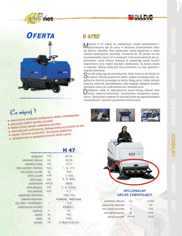 H 47RO M S D KOMBAJNY jącego; a układu zamiata ni ze ąc dł po ć oś możliw ; ♦♦maszyna ma docisku szczotek em st sy ny yj yc ec pr czotek; ♦♦ ób zakładania sz os sp zie do tyłu; ty os pr zo ♦♦bard ą listwę przy jeźd ow al st , ną zo os podn abilności; ♦♦automatycznie iku” dla lepszej st rn io zb w k ni or bi ania; ♦♦system “z komorze silniki ss ej ln ja ec sp w e ♦♦zabezpieczon H 47 8750 1250 1375 3 x 435 140 3/500 2 x 800 1800 2 x 2000 7,5 300/310 550 elektr. 36 740 1705 238x141x150 szerokość robocza pojemność zbiornika moc silnika szczotek moc silnika ssania obroty szczotek mm l 1300 W 500 W obr/min 900 40 PADY włókno szklane opcjonalny układ zamiatający EKSTRAKTORY wydajność m /h mm szerokość robocza mm szerokość listwy ilość szczotek i średnica 1/mm kg max nacisk szczotki silnik szczotki no/W V/W silnik ssący podciśnienie mmH2O V/W silnik trakcyjny max prędkość km/h l pojemność zbiorników materiał zbiorników l poj. zbior. z recyklingiem podnoszenie szczotek V zasilanie Ah bateria kg ciężar cm wymiary 2 SZLIFIERSKIE Co więcej ? SZOROWARKI aszyna H 47 należy do największych modeli samojezdnych i przeznaczona jest do pracy w otoczeniu przemysłowym takim jak dworce, zajezdnie, firmy spedycyjne, centra logistyczne a nawet zakłady metalurgiczne, warsztaty, montownie itp. Nic jednak nie stoi na przeszkodzie użycia ich w miejscach mniej przemysłowych jak supermarkety i porty lotnicze. Maszyny te zapewniają wysoki komfort ergonomiczny przy niskich kosztach użytkowania. Są bardzo proste w obsłudze. Ważną cechą jest duża przestrzeń na nogi operatora i wygoda kierowania. zczotki wyłączają się automatycznie, kiedy maszyna stoi dłużej niż 6 sekund. Wysoka pojemność baterii, system recyklingu wody i gigantyczne zbiorniki pozwalają na bardzo długą pracę. Każdy element maszyny został tak zaprojektowany, żeby osiągnąć najlepsze rezultaty sprzątania nawet dla użytkowników bez doświadczenia. odatkowe zalety to zabezpieczona przed korozją stalowa rama nośna, odporna konstrukcja i przemysłowe komponenty mechaniczne. Zastosowano większe niż potrzeba silniki dla zagwarantowania niezawodności i wysokich parametrów technicznych. ODKURZACZE O FERTA 200 77