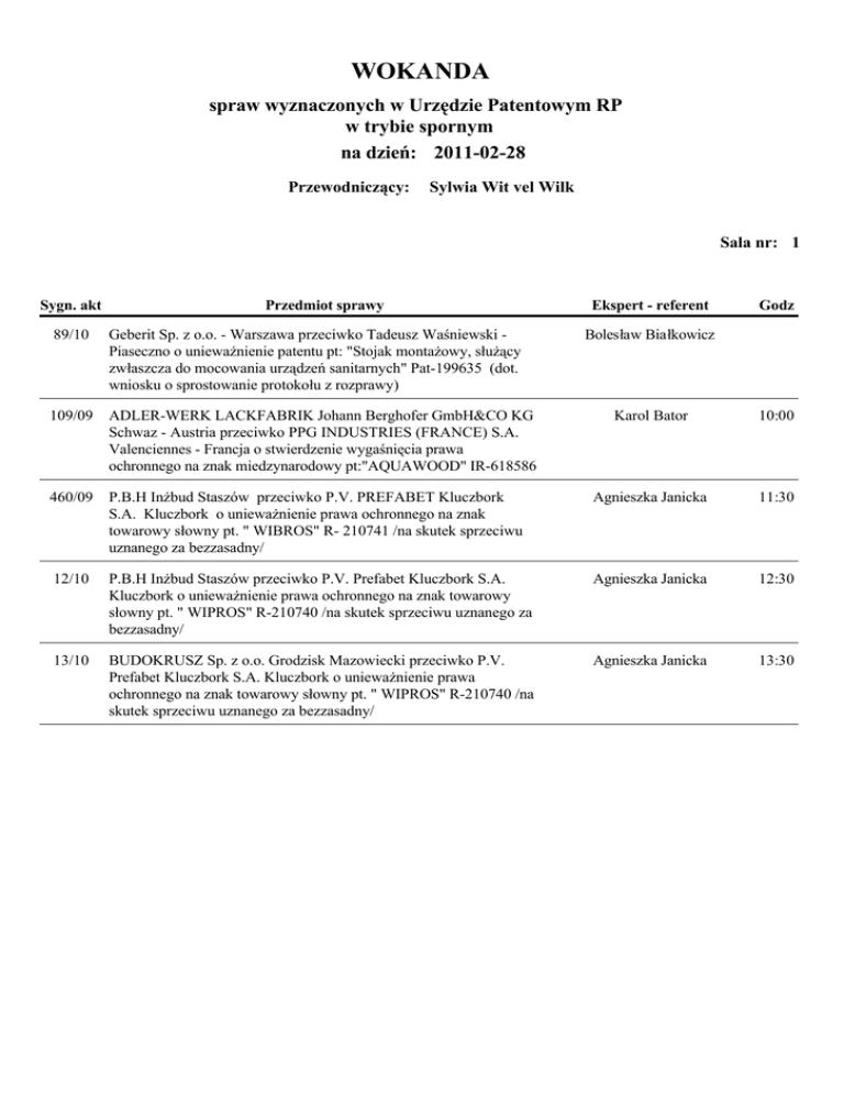 WOKANDA spraw wyznaczonych w Urzędzie Patentowym RP w trybie spornym na dzień: 2011-02-28 Przewodniczący: Sylwia Wit vel Wilk Sala nr: 1 Sygn. akt Przedmiot sprawy 89/10 Geberit Sp. z o.o. - Warszawa przeciwko Tadeusz Waśniewski Piaseczno o unieważnienie patentu pt: "Stojak montażowy, służący zwłaszcza do mocowania urządzeń sanitarnych" Pat-199635 (dot. wniosku o sprostowanie protokołu z rozprawy) 109/09 ADLER-WERK LACKFABRIK Johann Berghofer GmbH&CO KG Schwaz - Austria przeciwko PPG INDUSTRIES (FRANCE) S.A. Valenciennes - Francja o stwierdzenie wygaśnięcia prawa ochronnego na znak miedzynarodowy pt:"AQUAWOOD" IR-618586 460/09 Ekspert - referent Godz Bolesław Białkowicz Karol Bator 10:00 P.B.H Inżbud Staszów przeciwko P.V. PREFABET Kluczbork S.A. Kluczbork o unieważnienie prawa ochronnego na znak towarowy słowny pt. " WIBROS" R- 210741 /na skutek sprzeciwu uznanego za bezzasadny/ Agnieszka Janicka 11:30 12/10 P.B.H Inżbud Staszów przeciwko P.V. Prefabet Kluczbork S.A. Kluczbork o unieważnienie prawa ochronnego na znak towarowy słowny pt. " WIPROS" R-210740 /na skutek sprzeciwu uznanego za bezzasadny/ Agnieszka Janicka 12:30 13/10 BUDOKRUSZ Sp. z o.o. Grodzisk Mazowiecki przeciwko P.V. Prefabet Kluczbork S.A. Kluczbork o unieważnienie prawa ochronnego na znak towarowy słowny pt. " WIPROS" R-210740 /na skutek sprzeciwu uznanego za bezzasadny/ Agnieszka Janicka 13:30
